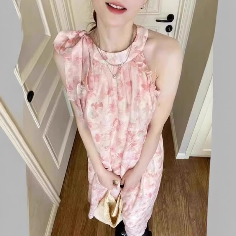 프랑스 스타일 핑크 목 슬링 원피스 여성 여름 2025 새로운 도착 해변 휴가 꽃 미디 원피스