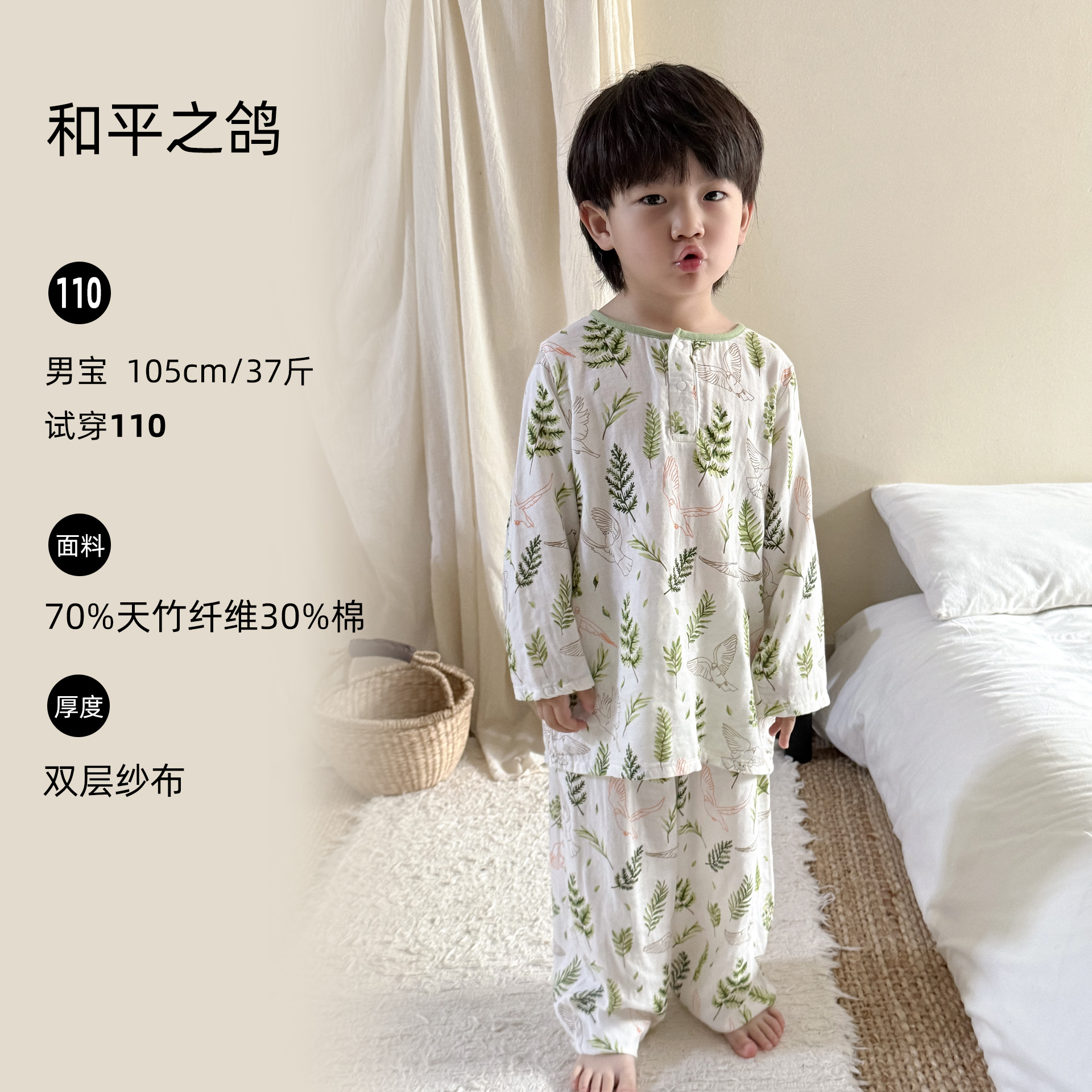 • 평화의 비둘기 - 아동용 더블 레이어 거즈 긴팔 바지 홈웨어 세트