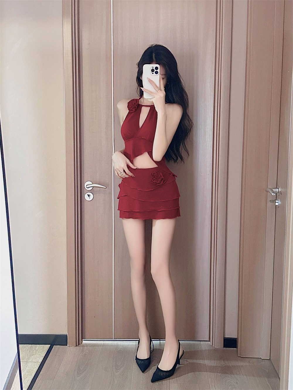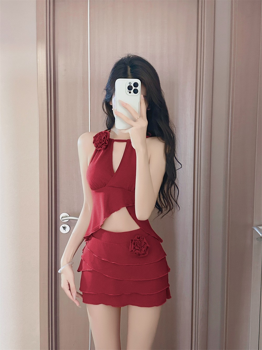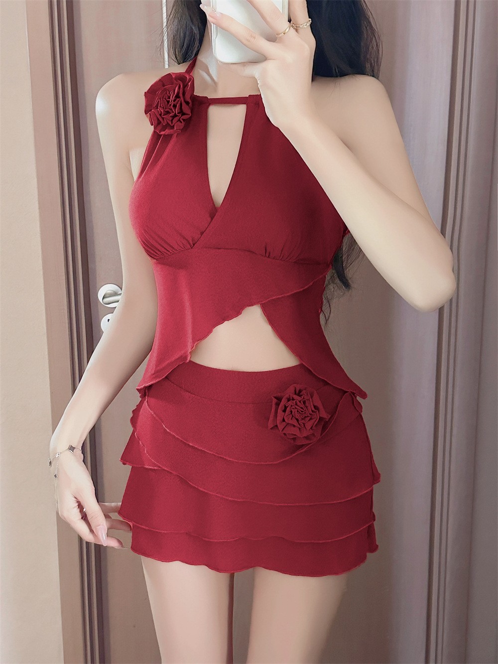 아름다운 쪼개지는 수영복 여성의 붉은 꽃 높은 아름다움 가치 새로운 스타일 목 걸기 끈없는 백리스 순수한 욕망 작은 가슴 해변 휴일 온천