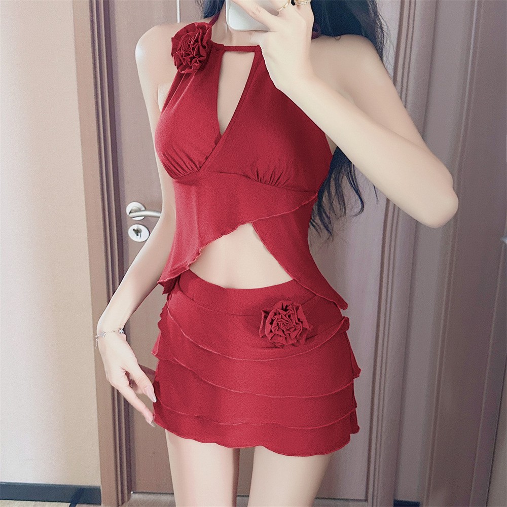 아름다운 쪼개지는 수영복 여성의 붉은 꽃 높은 아름다움 가치 새로운 스타일 목 걸기 끈없는 백리스 순수한 욕망 작은 가슴 해변 휴일 온천스토어 가기