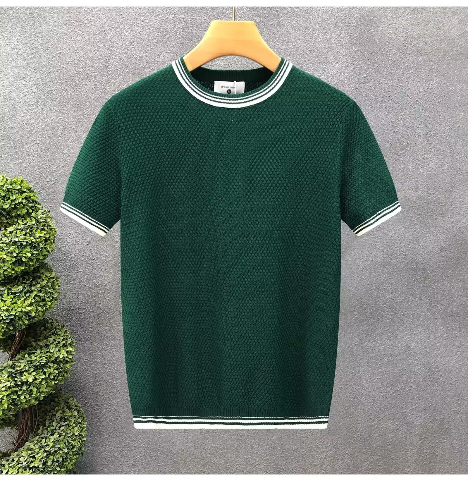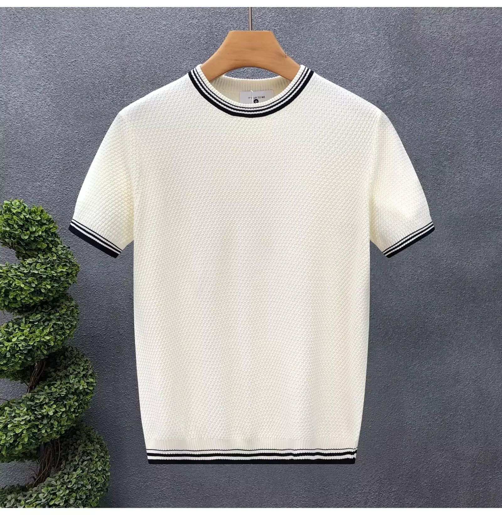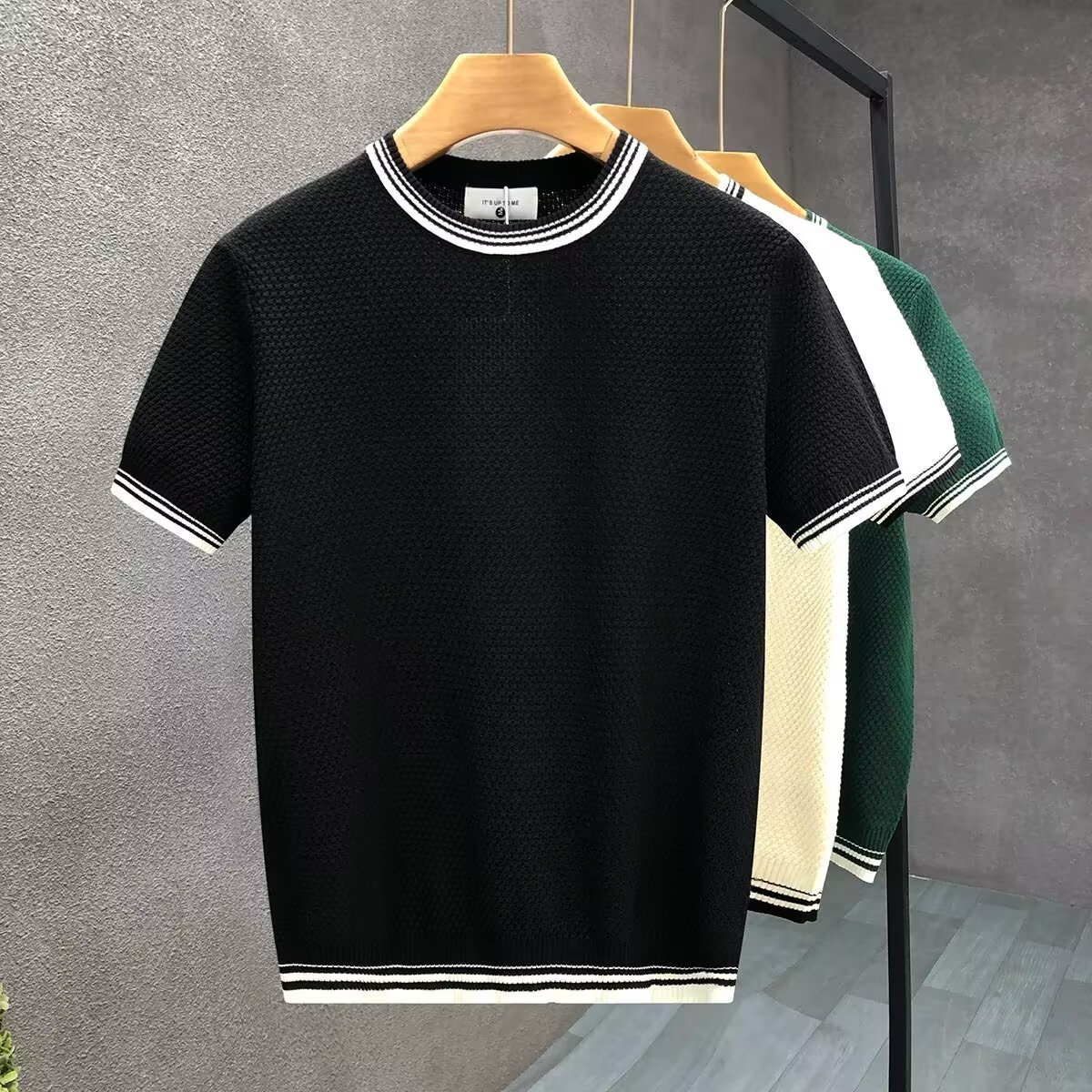 여름 남자 아이스 실크 반팔 티셔츠 청소년 패션 스트라이프 엣지 라운드 넥 얇은 니트 반팔 티셔츠 트렌디베이스