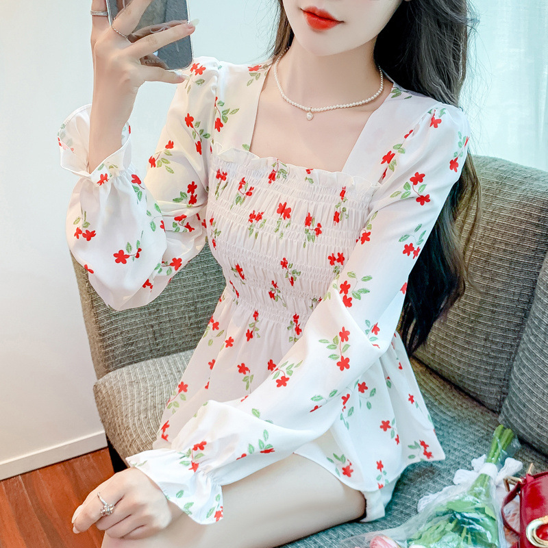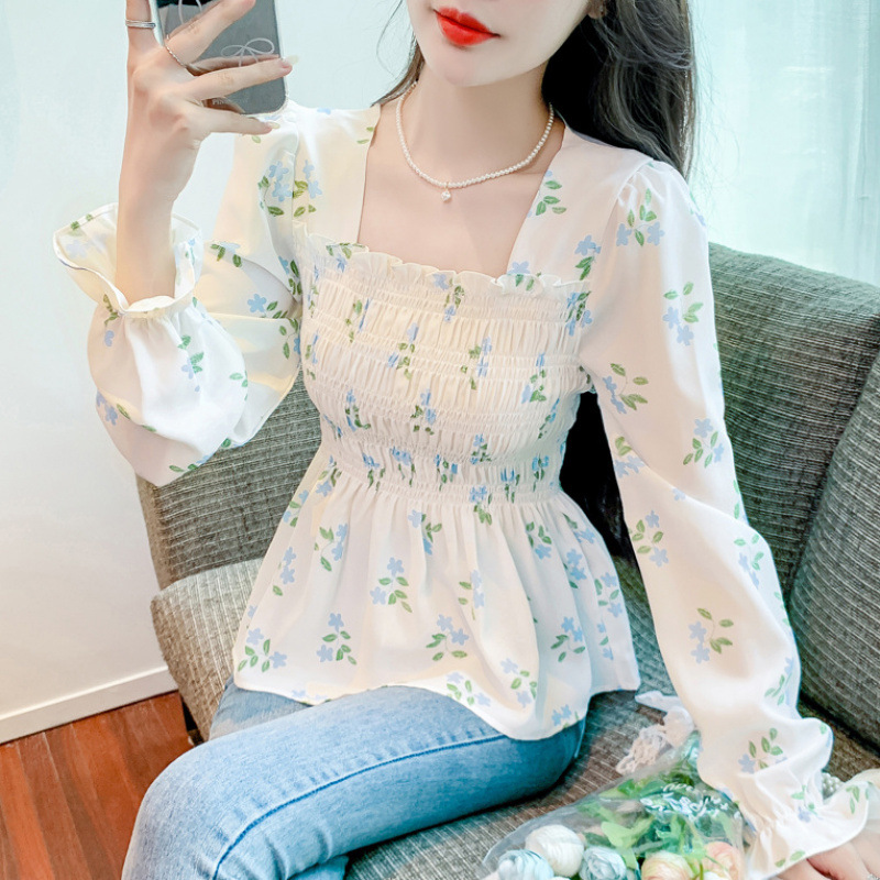 이른 가을 프랑스 뉴 스퀘어 칼라 셔츠 꽉 허리 패션 슬리밍 달콤한 아름다운 작은 셔츠 시대 감소 긴 소매 탑스토어 가기