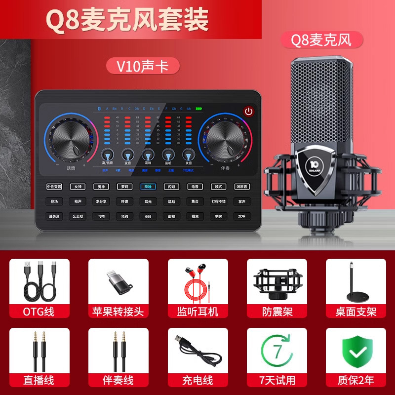 • [전문 사운드 카드] 10개의 조명 Q8 마이크 + V10 사운드 카드(무료 OTG 라이브 방송 케이블)