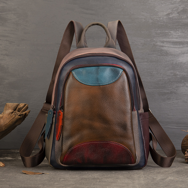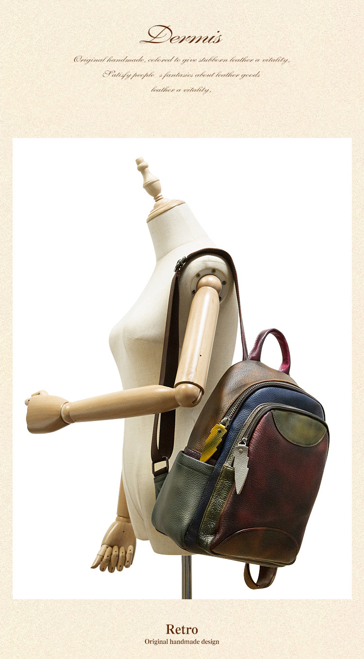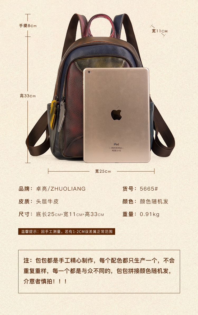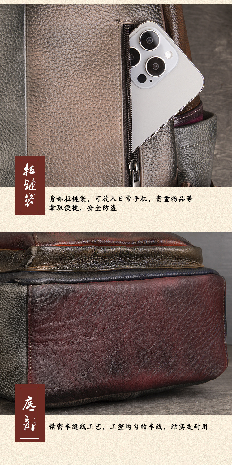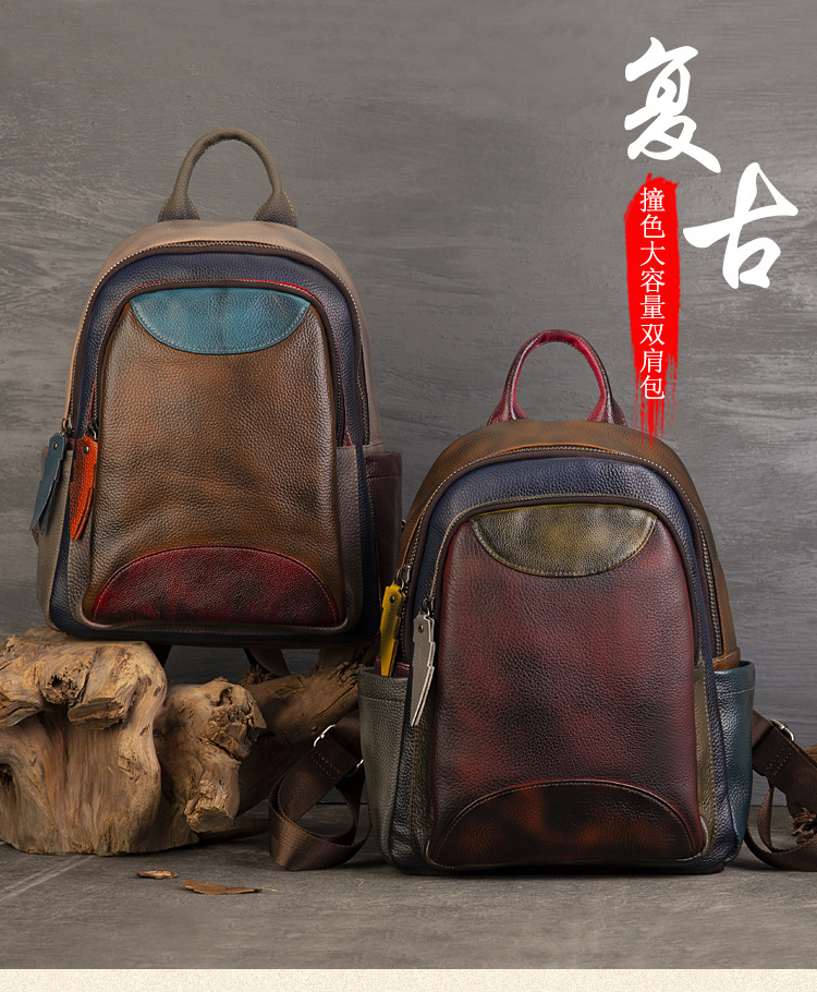 원래 수제 컬러 가죽 캐주얼 배낭 소프트 Cowhide 대용량 배낭 바느질 컬러 여행 등산 가방스토어 가기