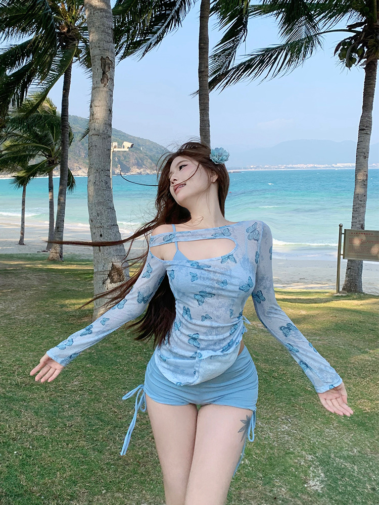 2025 새로운 나비 인쇄 3 조각 분할 수영복 여성 인스 타 그램 스타일 캐주얼 휴가 슬리밍 바디 슬리밍 유방 커버 사이즈