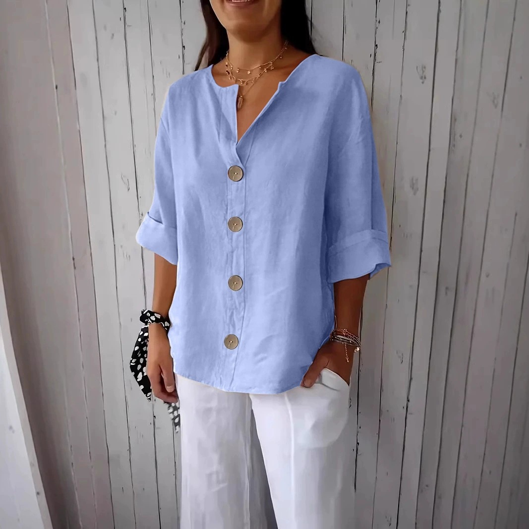 아마존 2025 국경 유럽 및 미국 여름 새로운 루즈 티셔츠 여성용 V 넥 코튼 및 리넨 버튼 탑