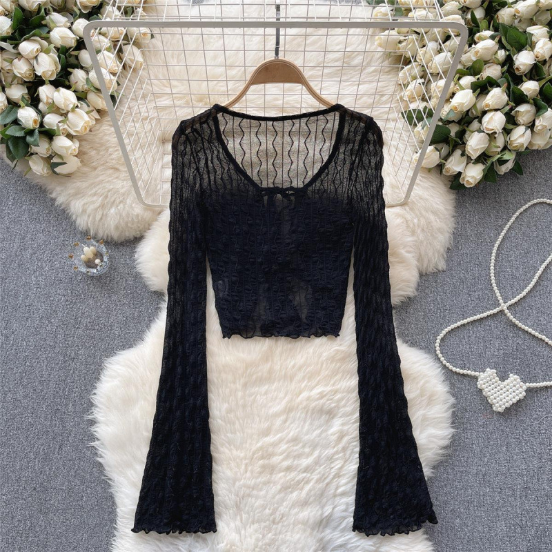 메시 레이스 셔츠 여성용 슬림 모양의 할로우 아웃 긴팔 선 스크린 탑 디자인 센스 쇼트 셔츠 올매치스토어 가기