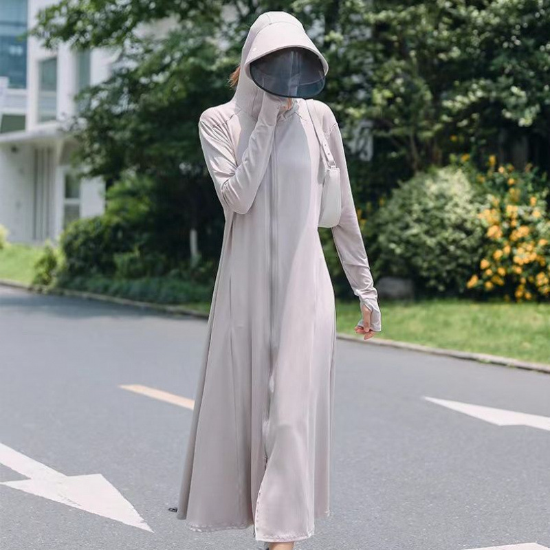 태양 보호 의류 여성의 2025 여름 새로운 후드 무릎 긴 UV 얼음 실크 통기성 태양 보호 얇은 외투