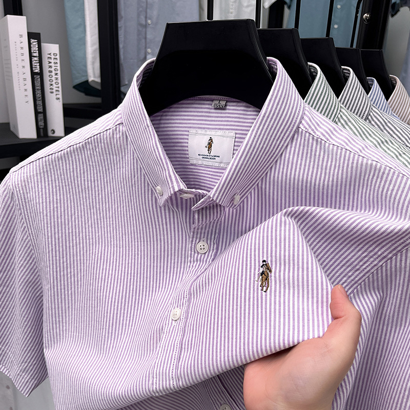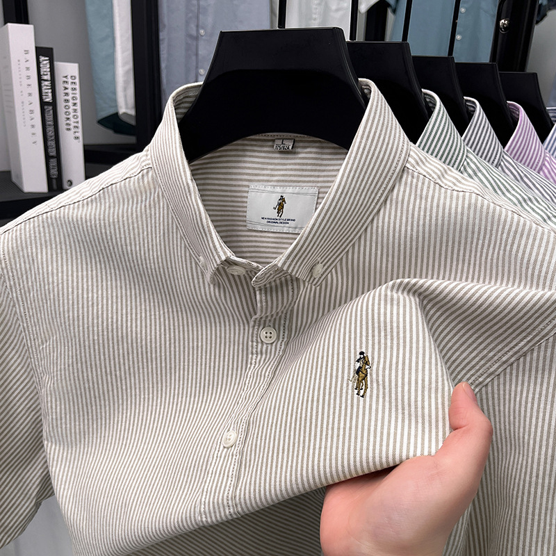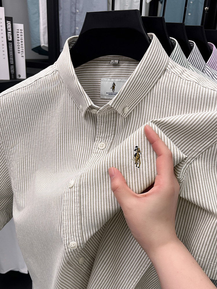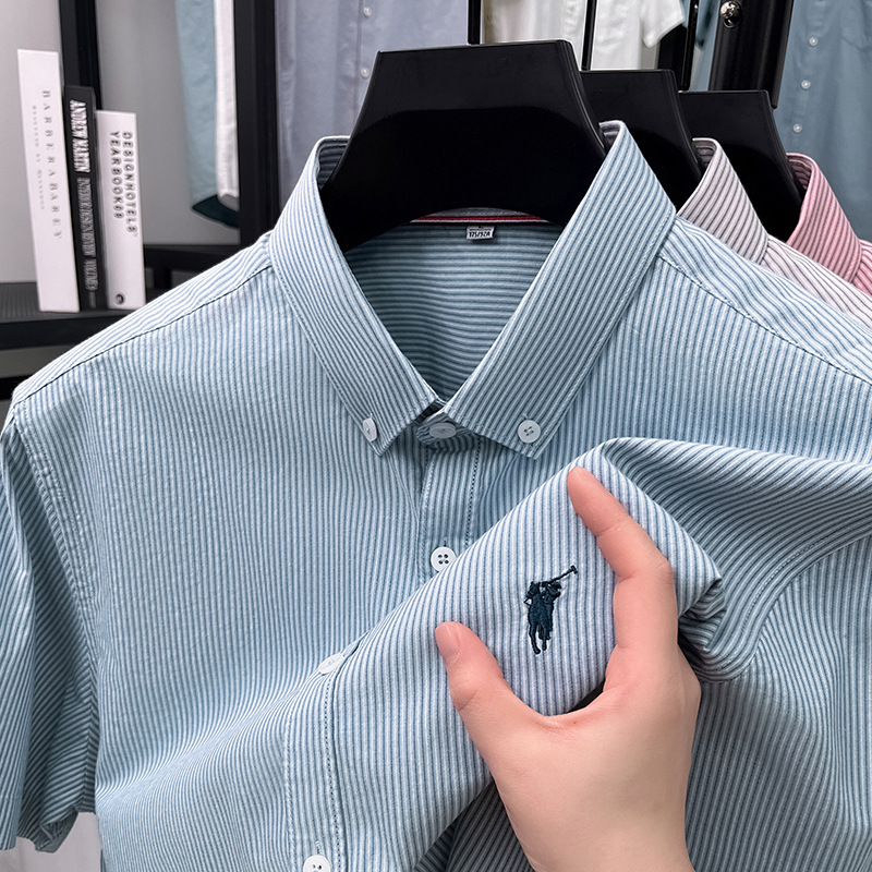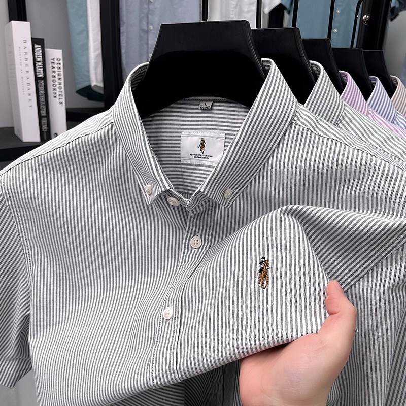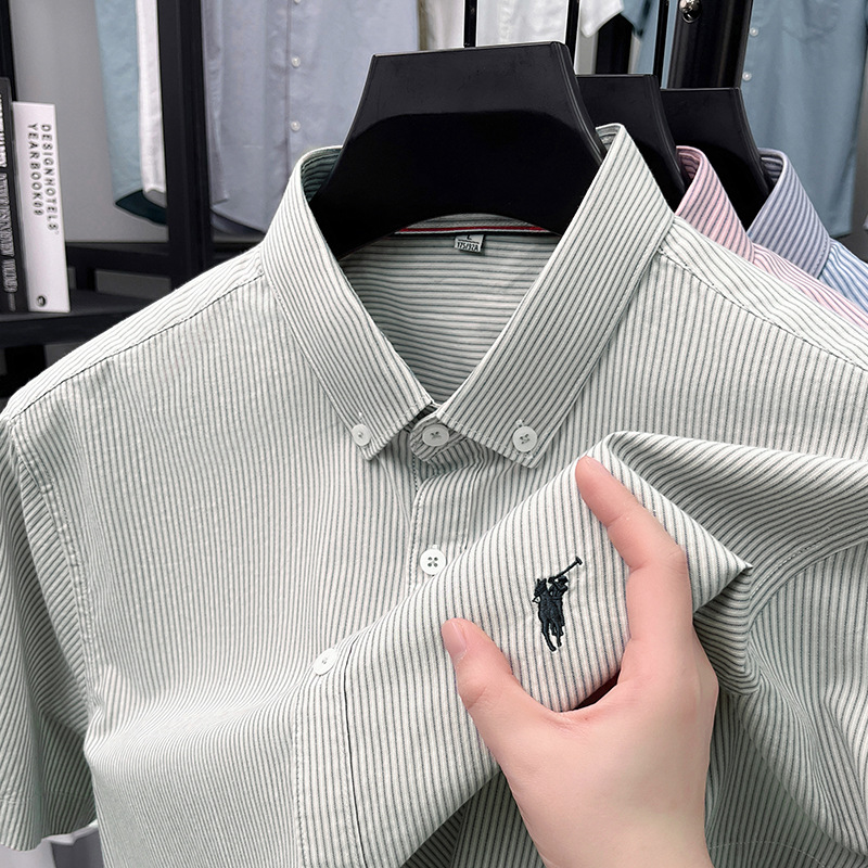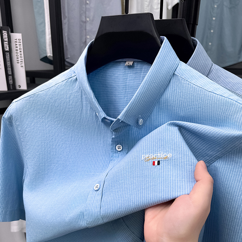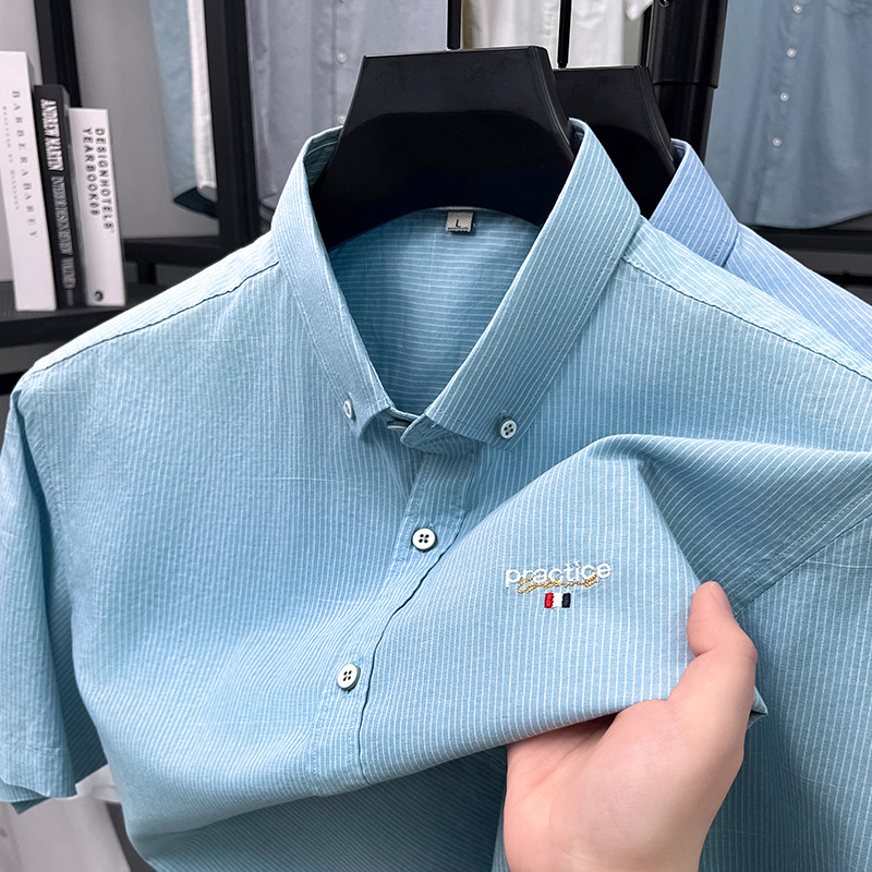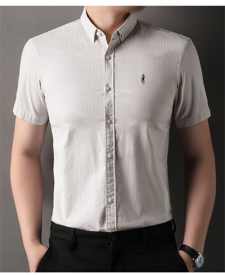 남성용 가을 100% 면 셔츠, 반팔 캐주얼 스트라이프 자수, 다림질 필요 없는 고품질 셔츠, 남성 도매스토어 가기
