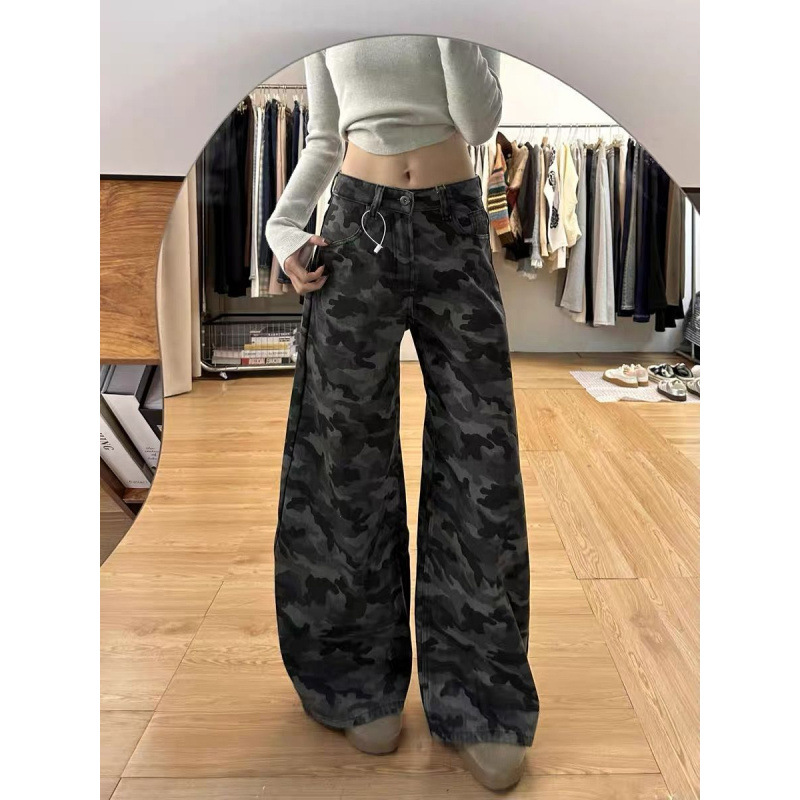 봄 2025 레트로 높은 허리 느슨한 슬림 핏 걸레 바지 미국 스타일 하이 스트리트 툴링 와이드 레그 위장 청바지 여성스토어 가기