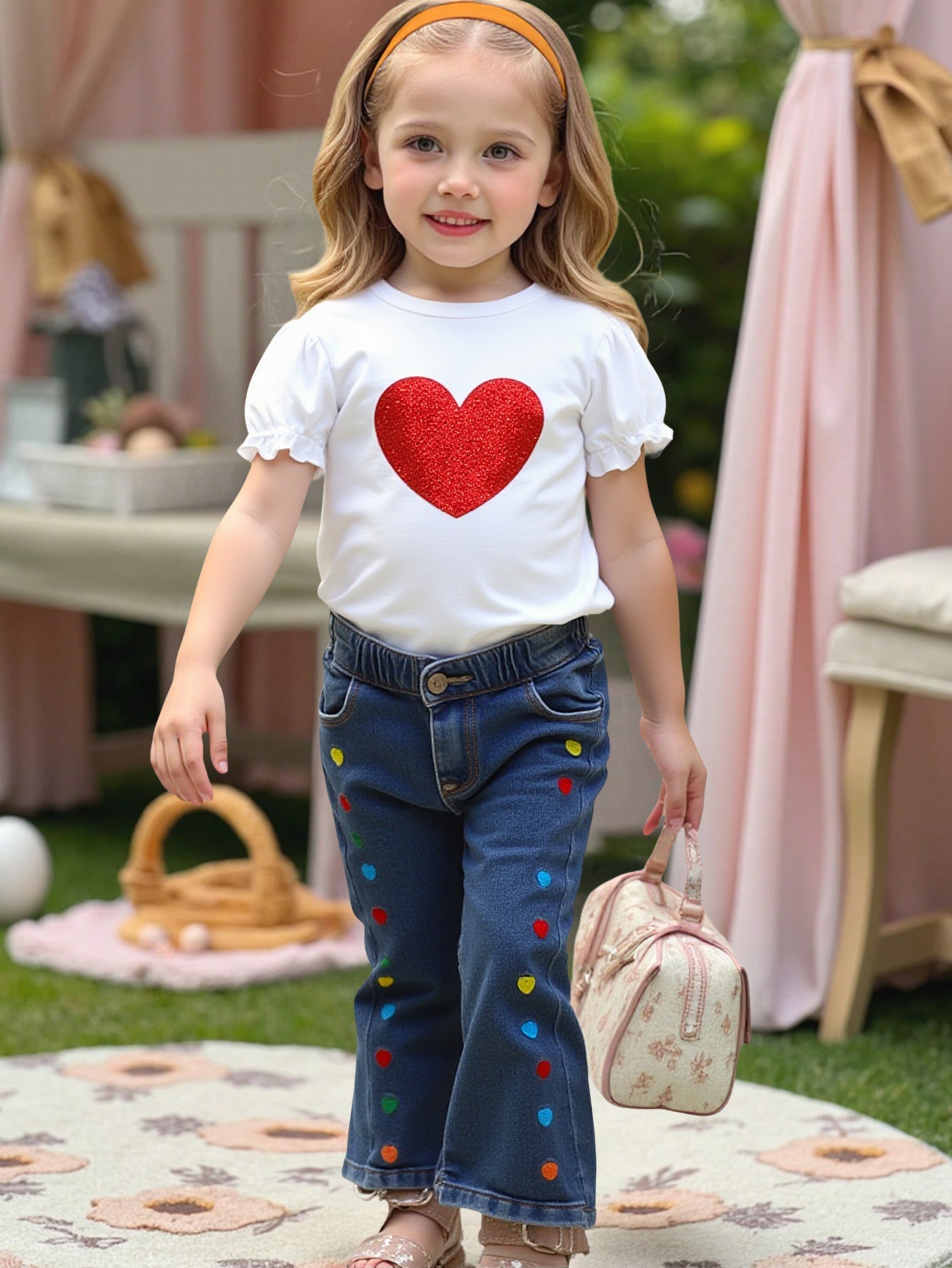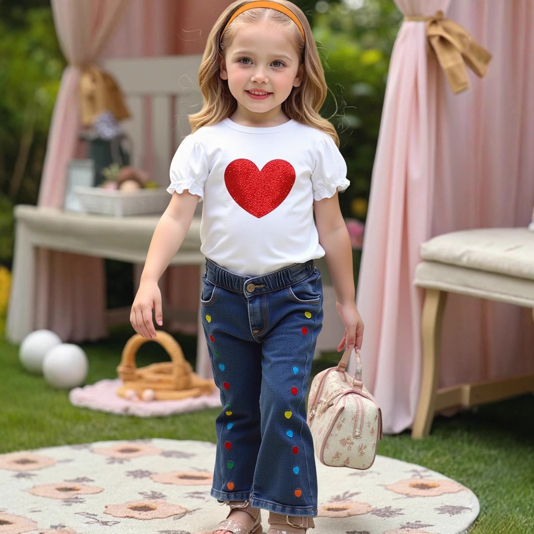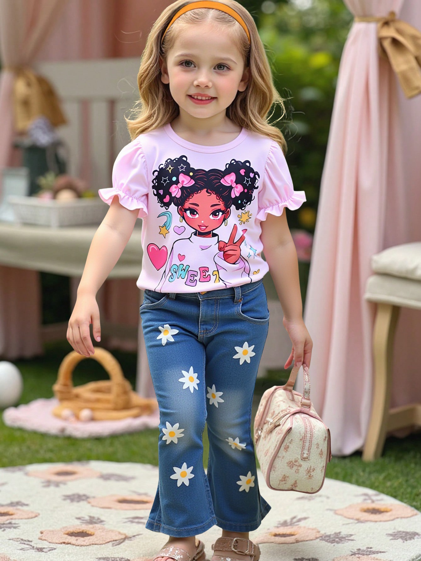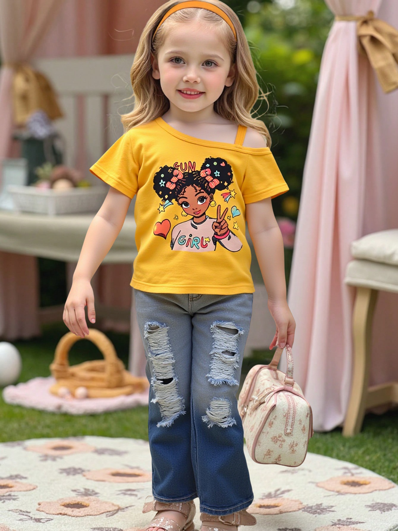국경 간 소녀 청바지 세트 서양 스타일 2025 여름 새로운 만화 티셔츠 인쇄 청바지 세트