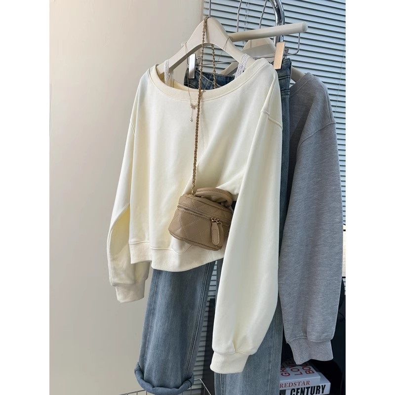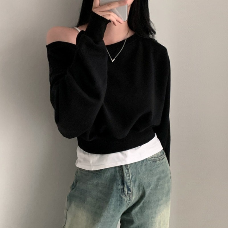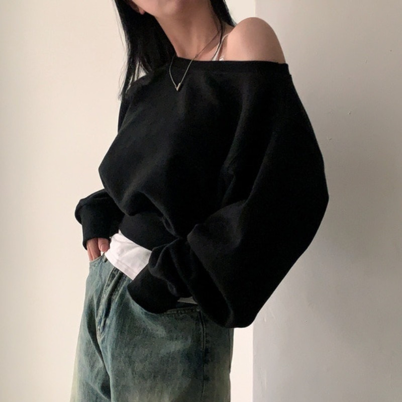 빈티지 시크한 홍콩 스타일 오프 숄더 긴 소매 스웨터 여성 봄과 가을 얇은 한국 스타일 느슨한 짧은 달콤하고 매운 탑스토어 가기