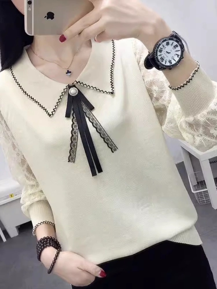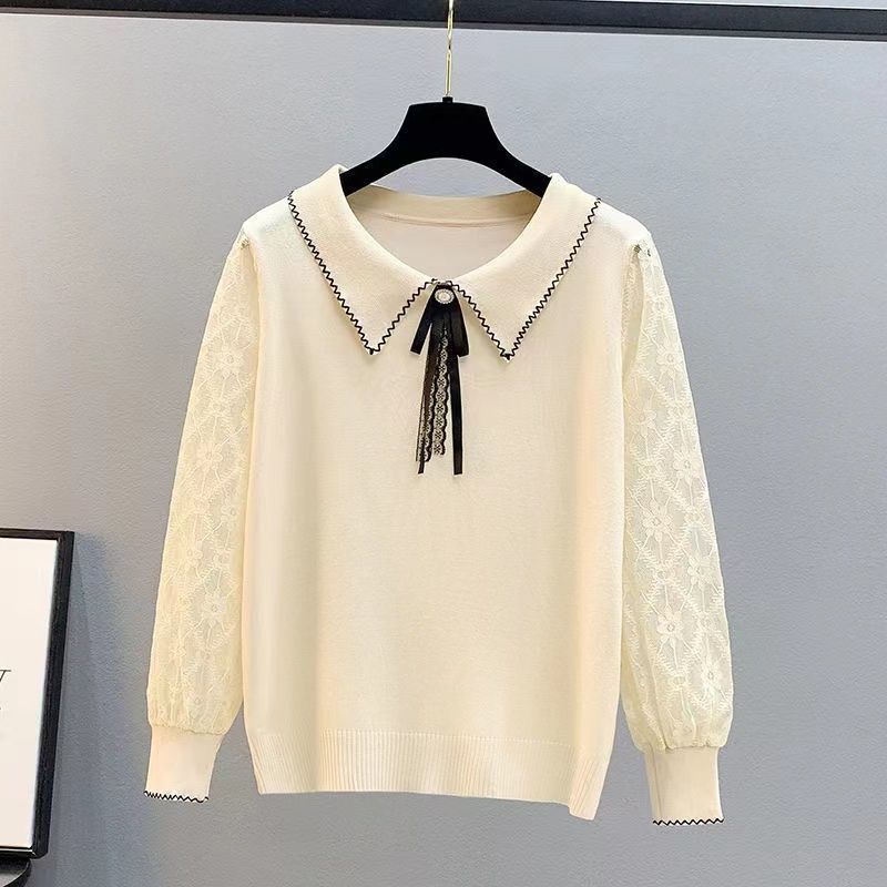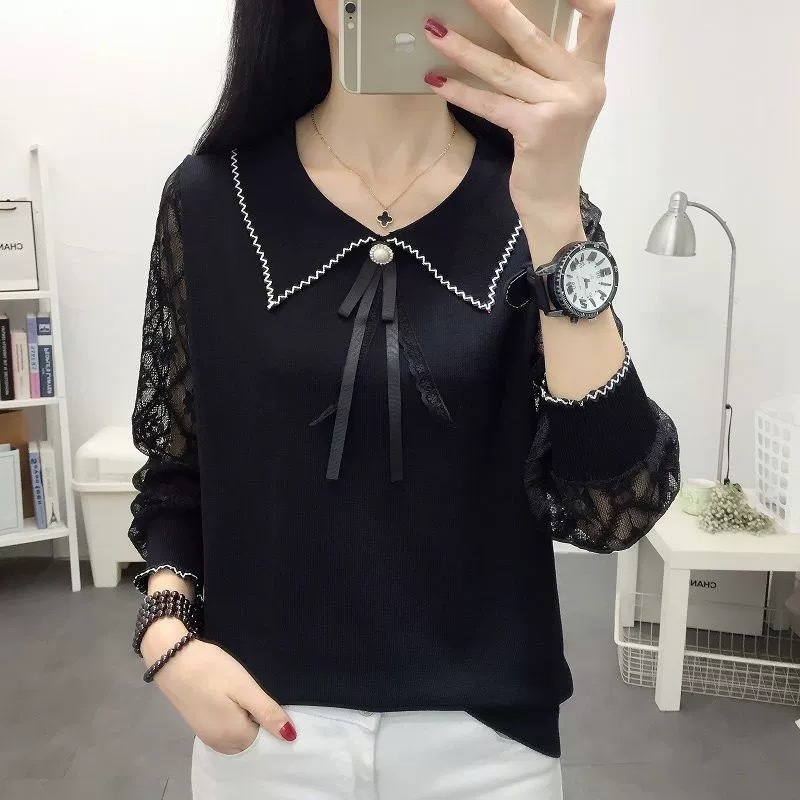 플러스 사이즈 레이스베이스 셔츠 여성의 2025 년 초가을 새 긴 소매 에어컨 선스크린 셔츠 탑 얇은 니트 셔츠스토어 가기