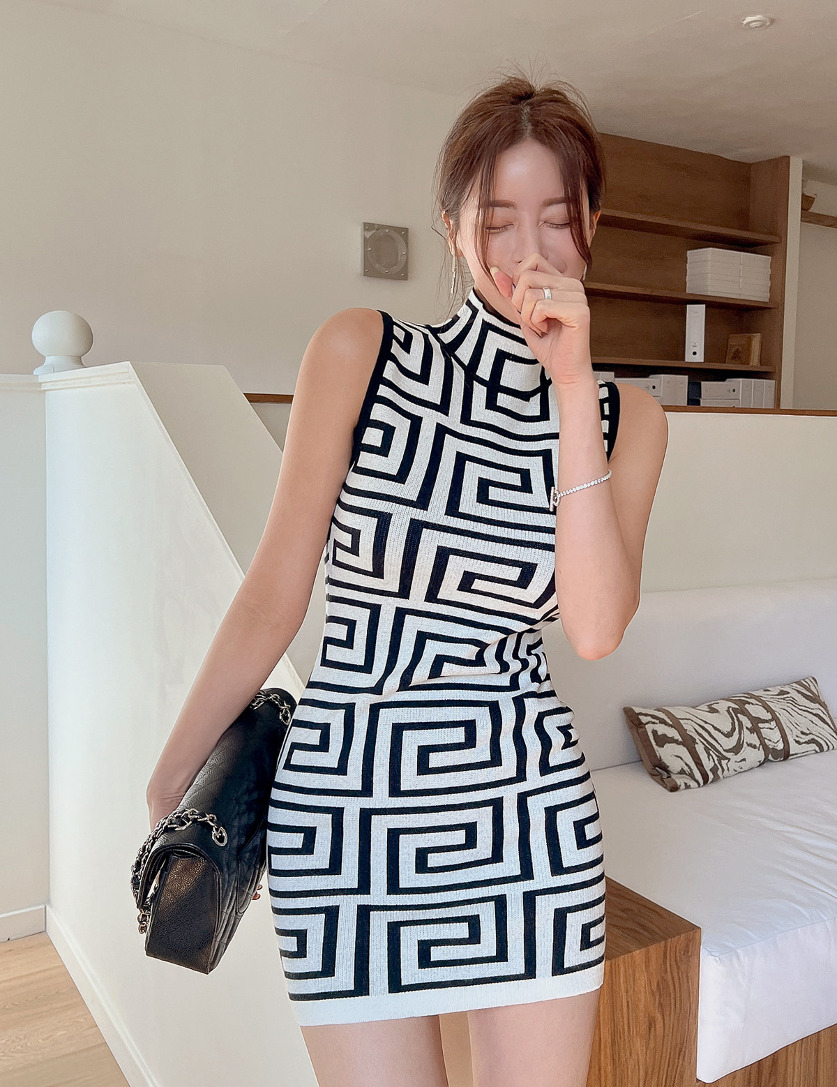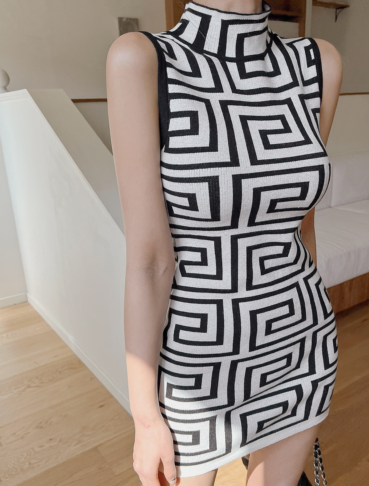 여름 2025 새로운 일본과 한국 스타일 하프 터틀넥 레트로 기하학적 패턴 슬림핏 민소매 힙합 니트 원피스 8341