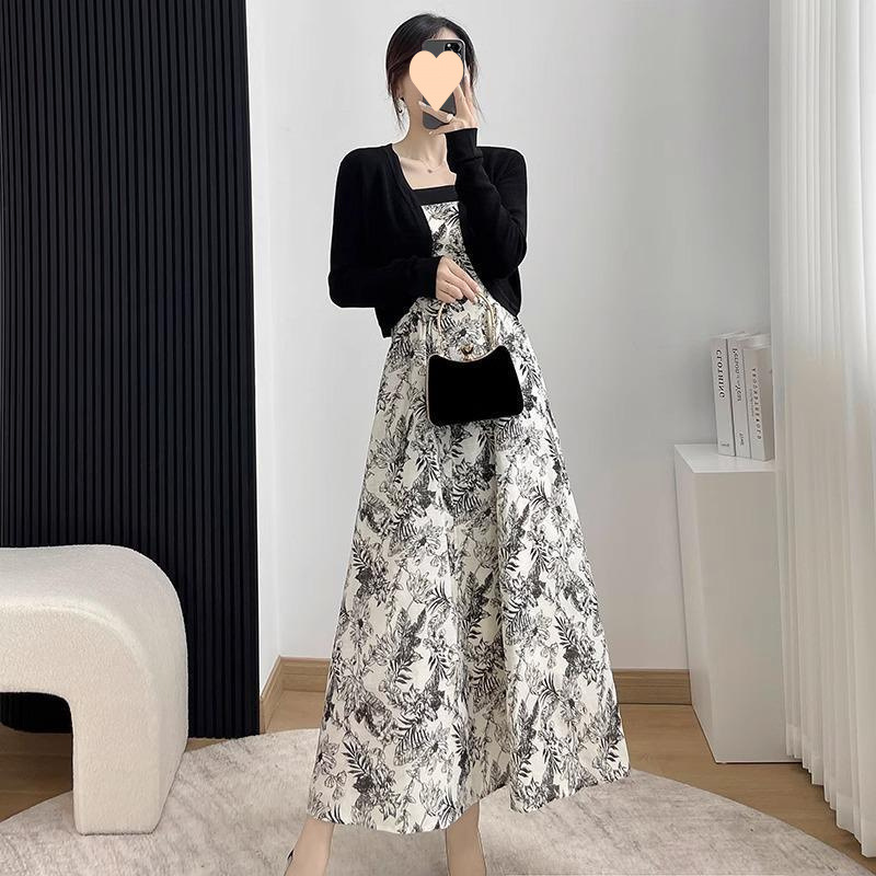 프랑스 꽃 슬링 원피스 여자 2024 봄 새로운 하이 엔드 우아한 타이트 허리 슬리밍 카디건 투피스 세트