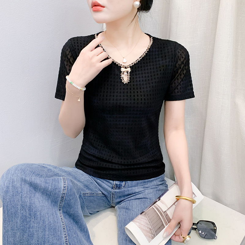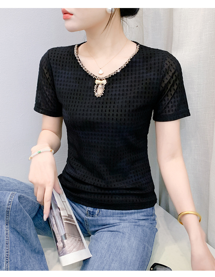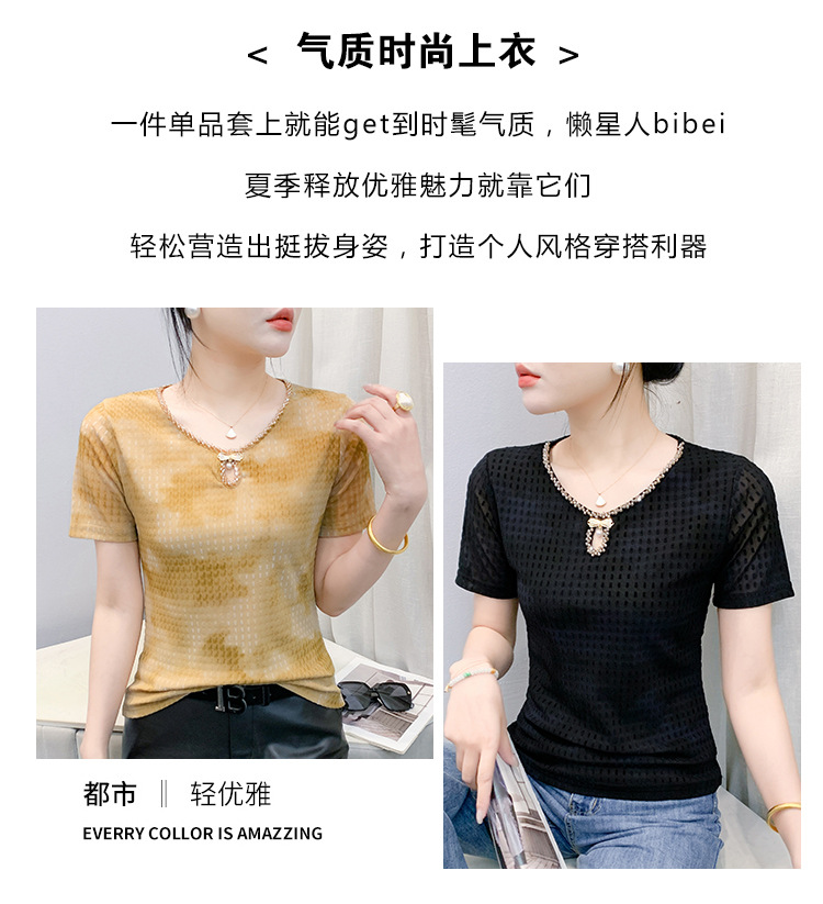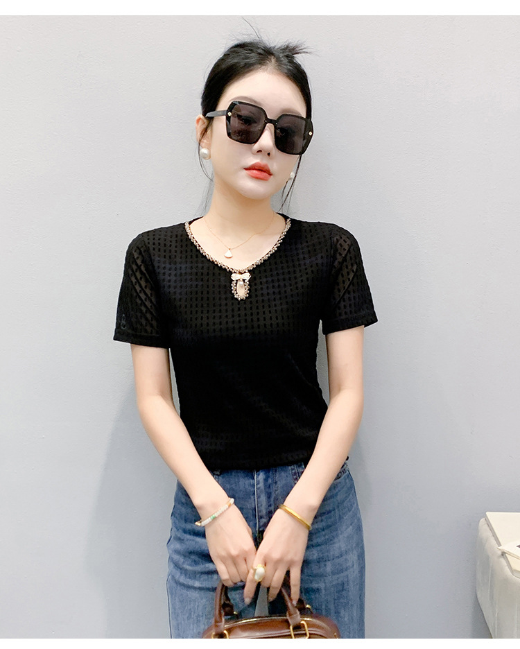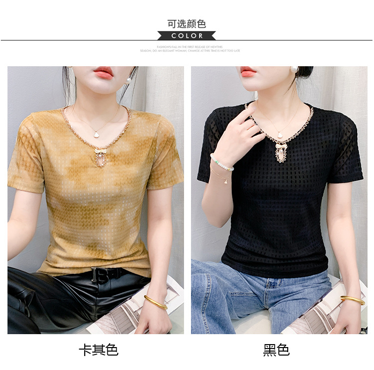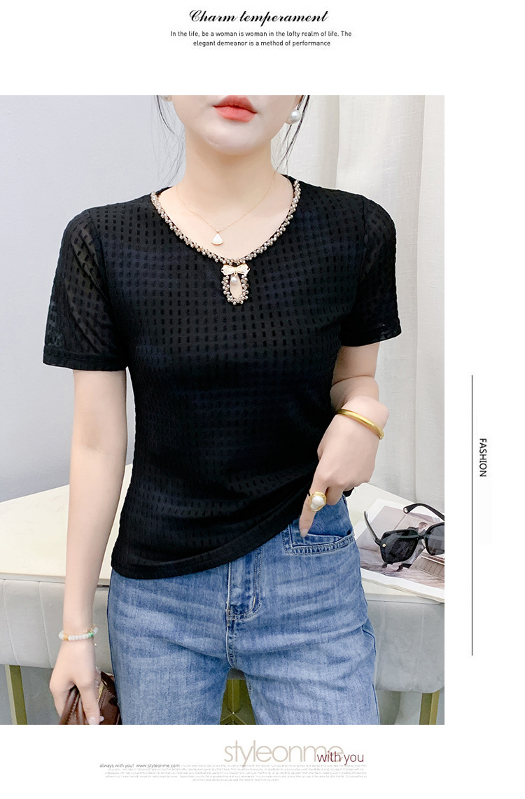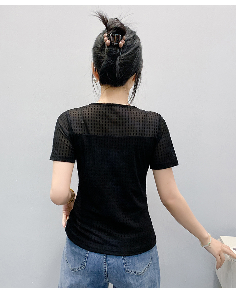 둥근 목 구슬 메쉬 짧은 소매 2025 여름 새로운 폴카 도트 캐주얼 여성 의류 중공 패션 베이스 셔츠스토어 가기