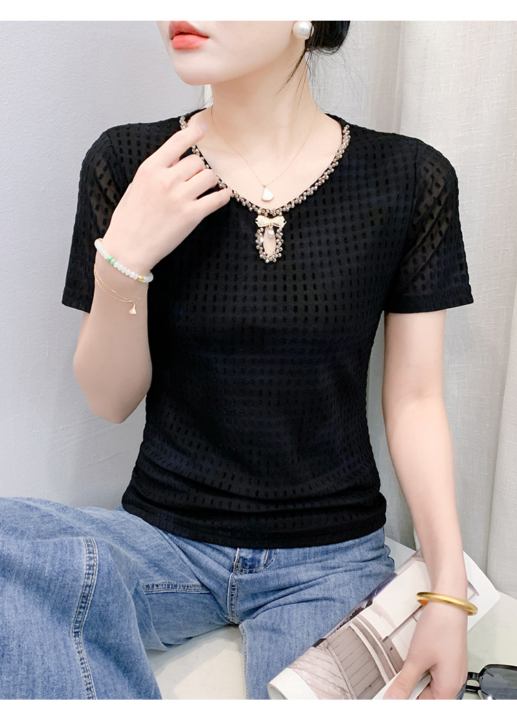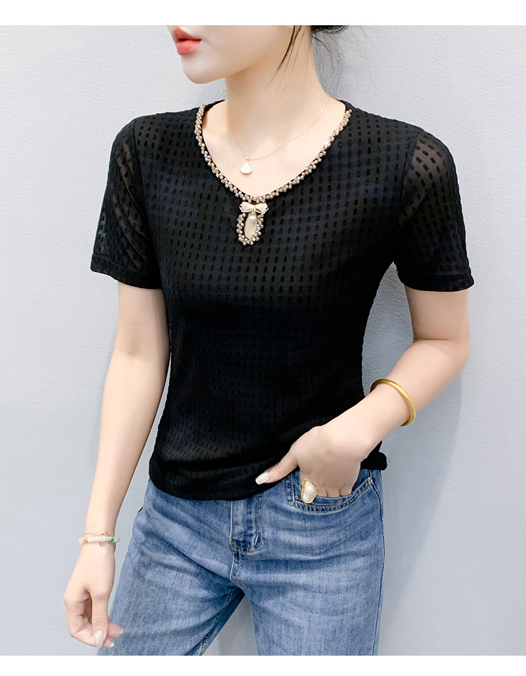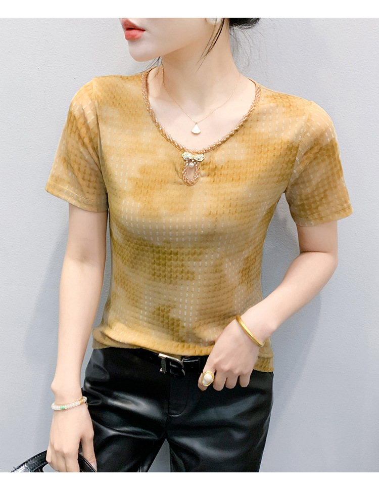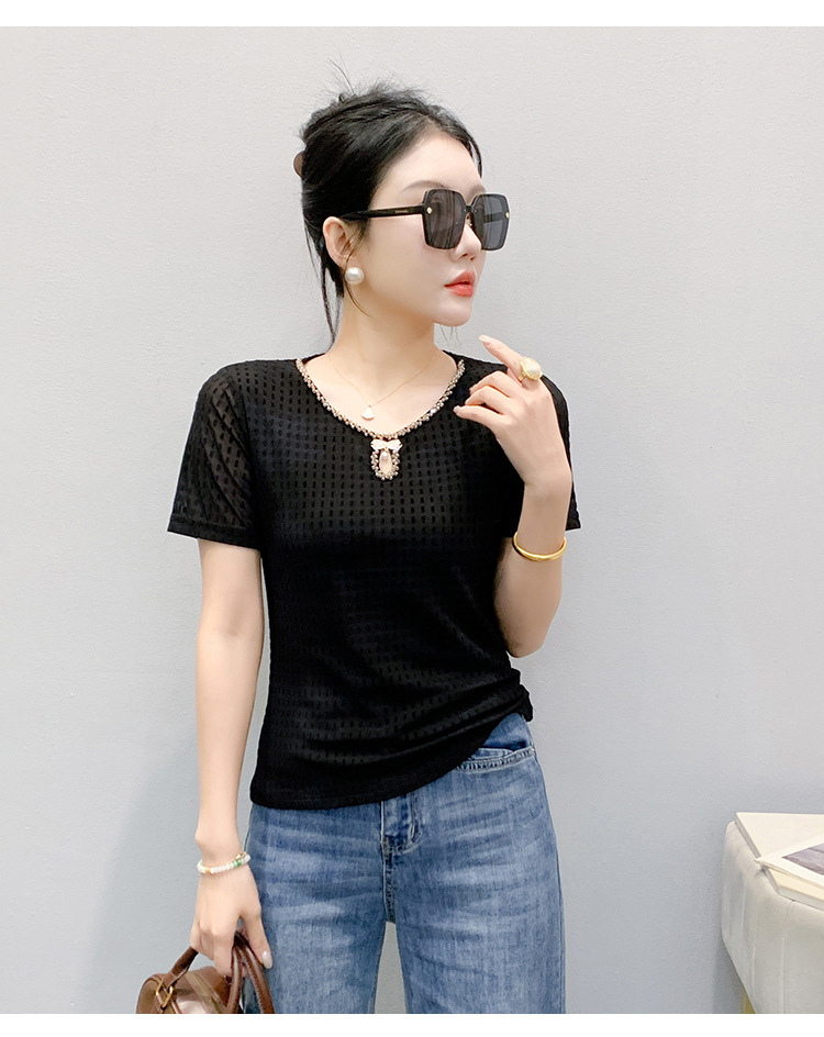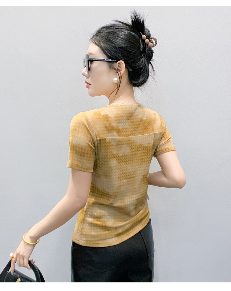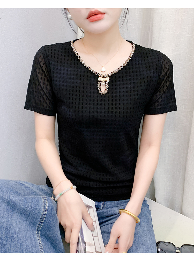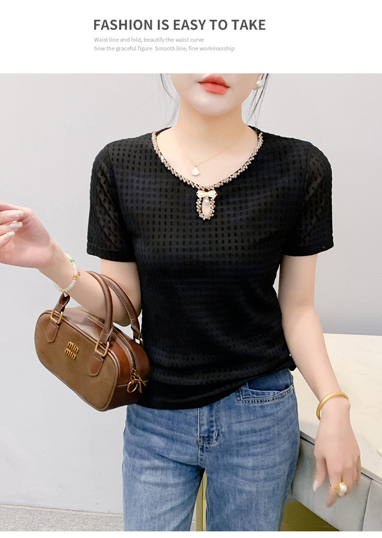 둥근 목 구슬 메쉬 짧은 소매 2025 여름 새로운 폴카 도트 캐주얼 여성 의류 중공 패션 베이스 셔츠스토어 가기