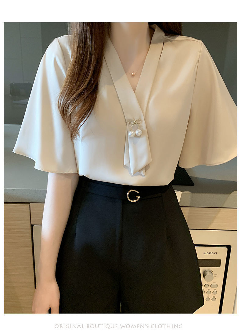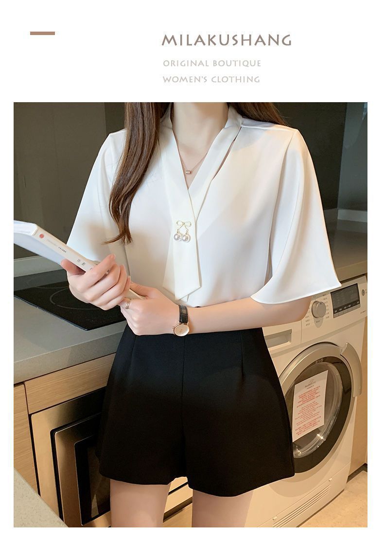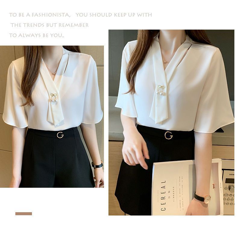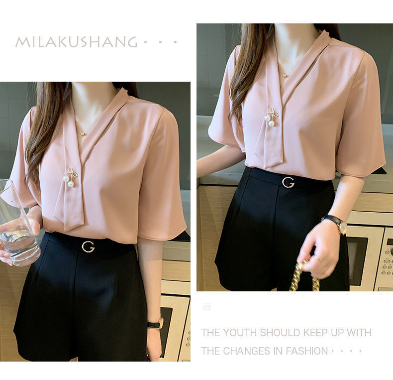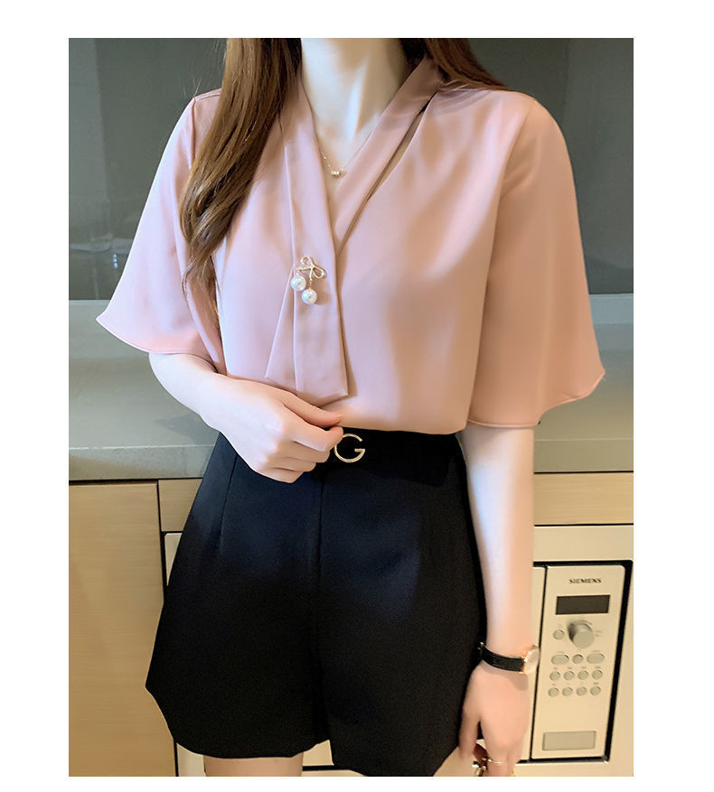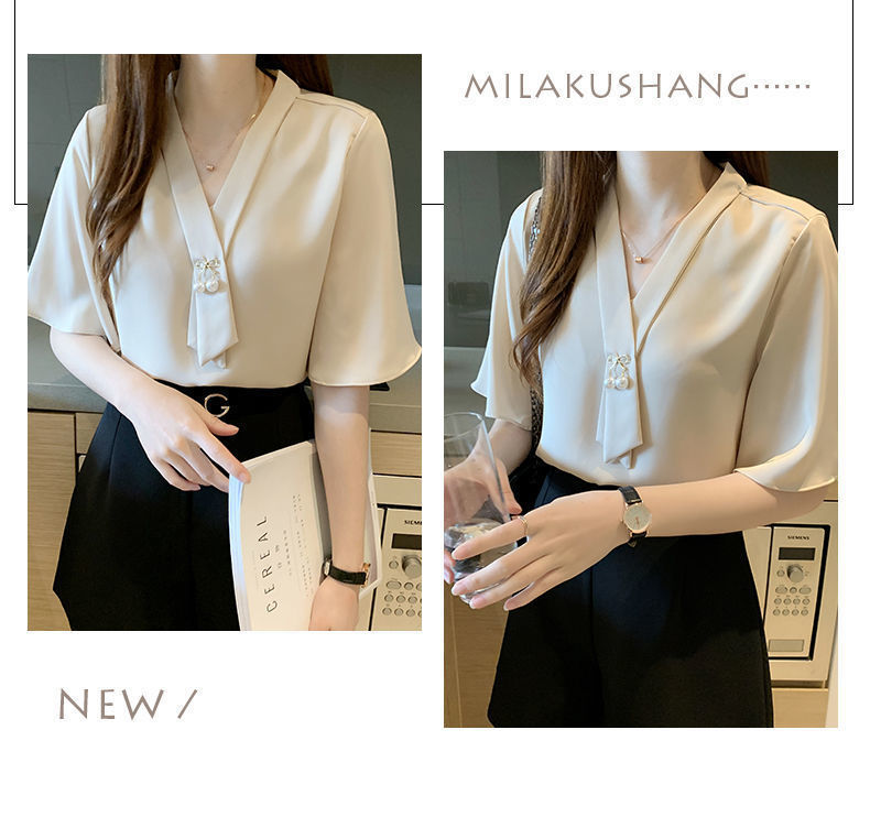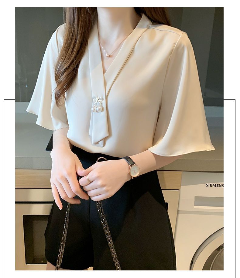 쉬폰 셔츠 여성용 미드 슬리브 여름 새로운 한국 스타일 루즈 웨스턴 스타일 작은 셔츠 트럼펫 소매 V-넥 우아한베이스 셔츠