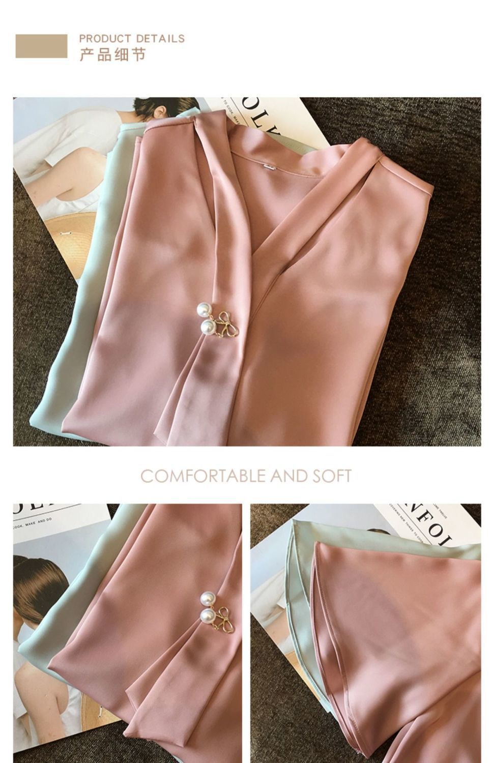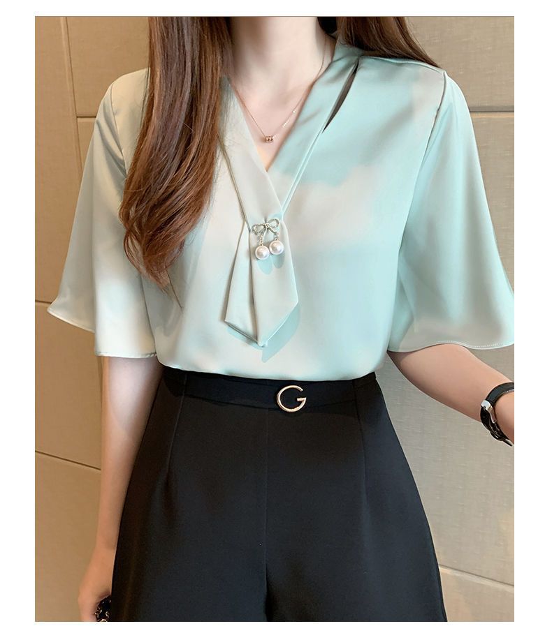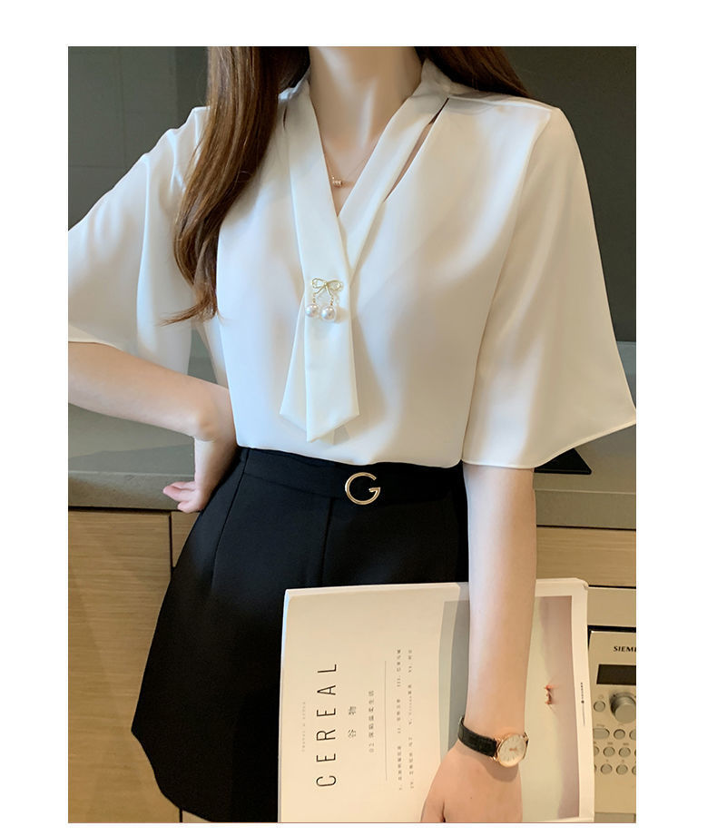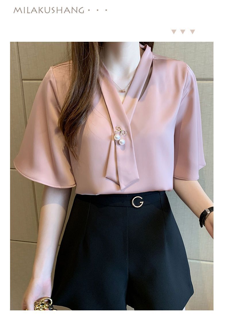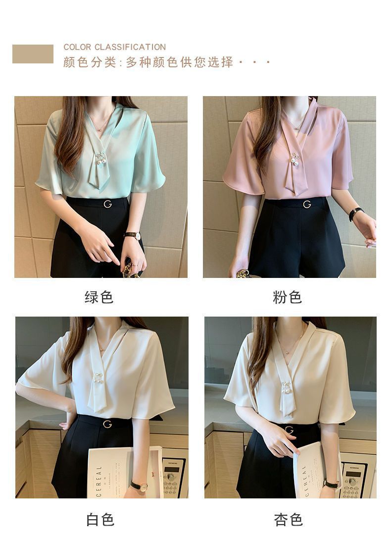 쉬폰 셔츠 여성용 미드 슬리브 여름 새로운 한국 스타일 루즈 웨스턴 스타일 작은 셔츠 트럼펫 소매 V-넥 우아한베이스 셔츠