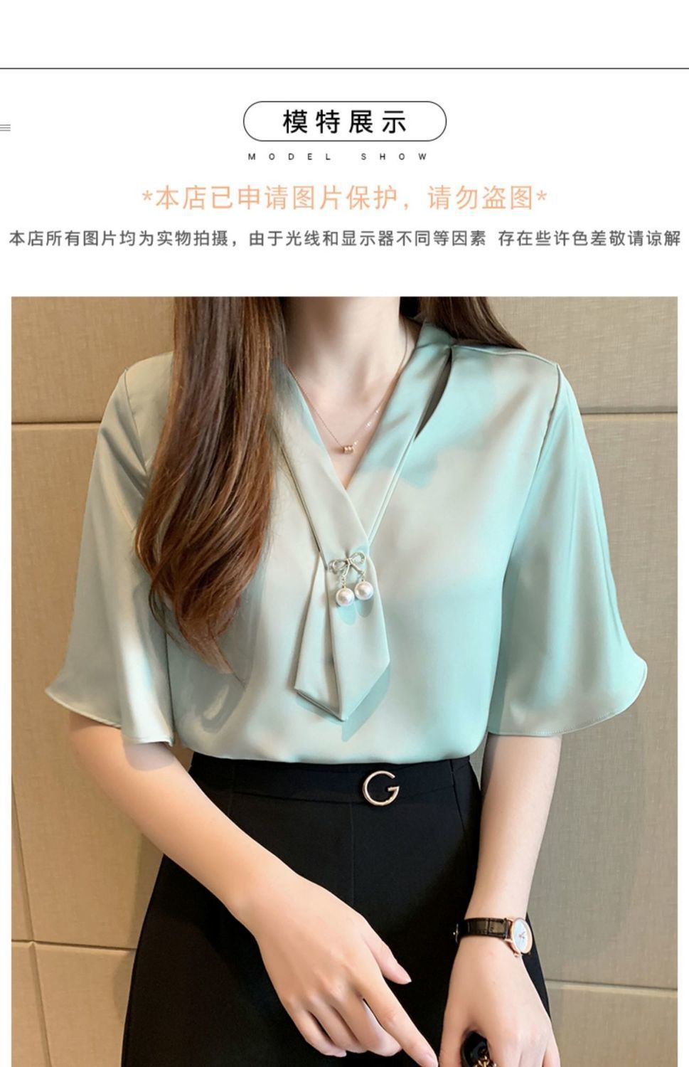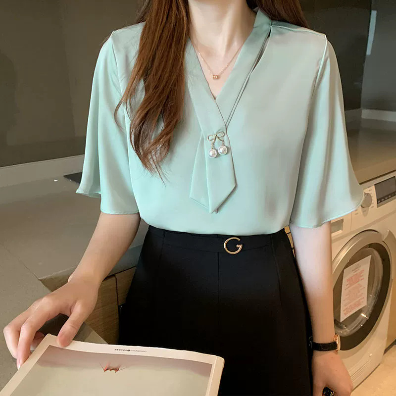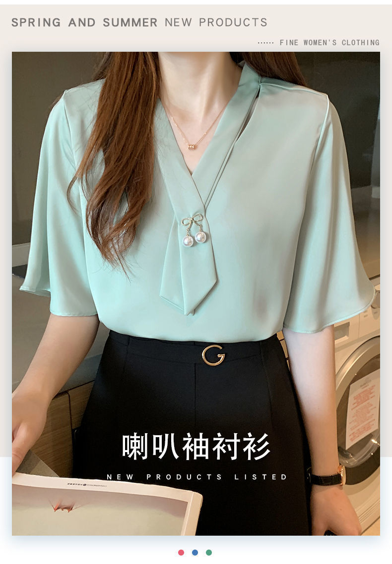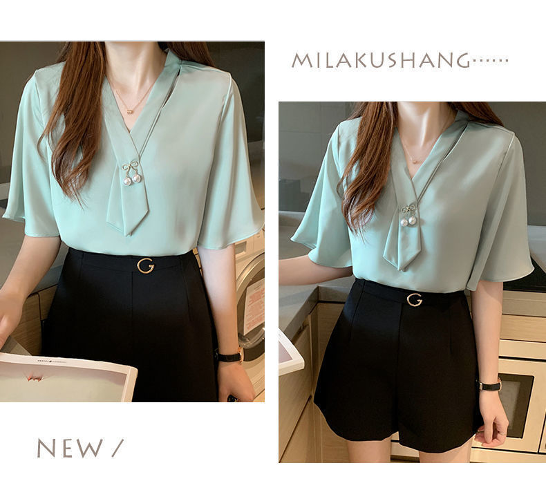쉬폰 셔츠 여성용 미드 슬리브 여름 새로운 한국 스타일 루즈 웨스턴 스타일 작은 셔츠 트럼펫 소매 V-넥 우아한베이스 셔츠스토어 가기