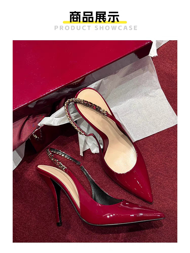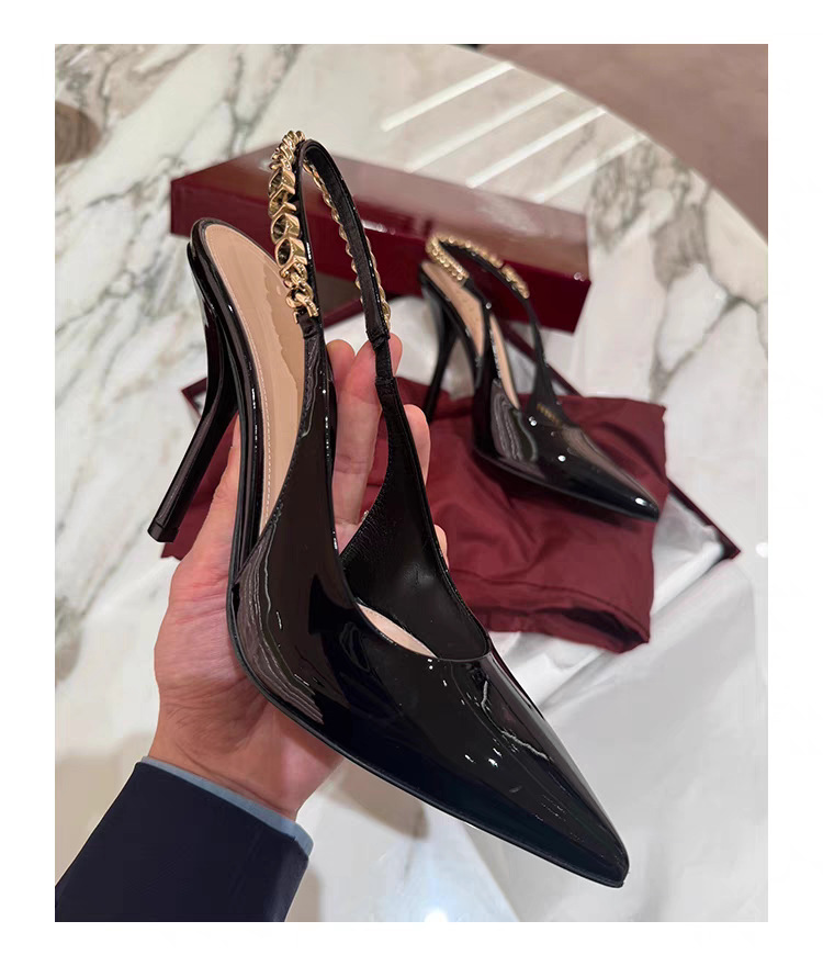 특허 가죽 금속 체인 스틸레토 힐 바오터우 샌들 여성 2025 년 봄과 여름 새로운 우아한 틈새 뾰족한 토끼 하이힐
