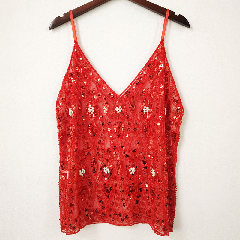 여름 세퀸 비즈 섹시한 슬림 짧은 V 넥 조끼 여성의 우아한 국경 아마존