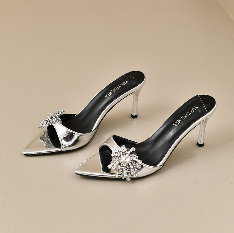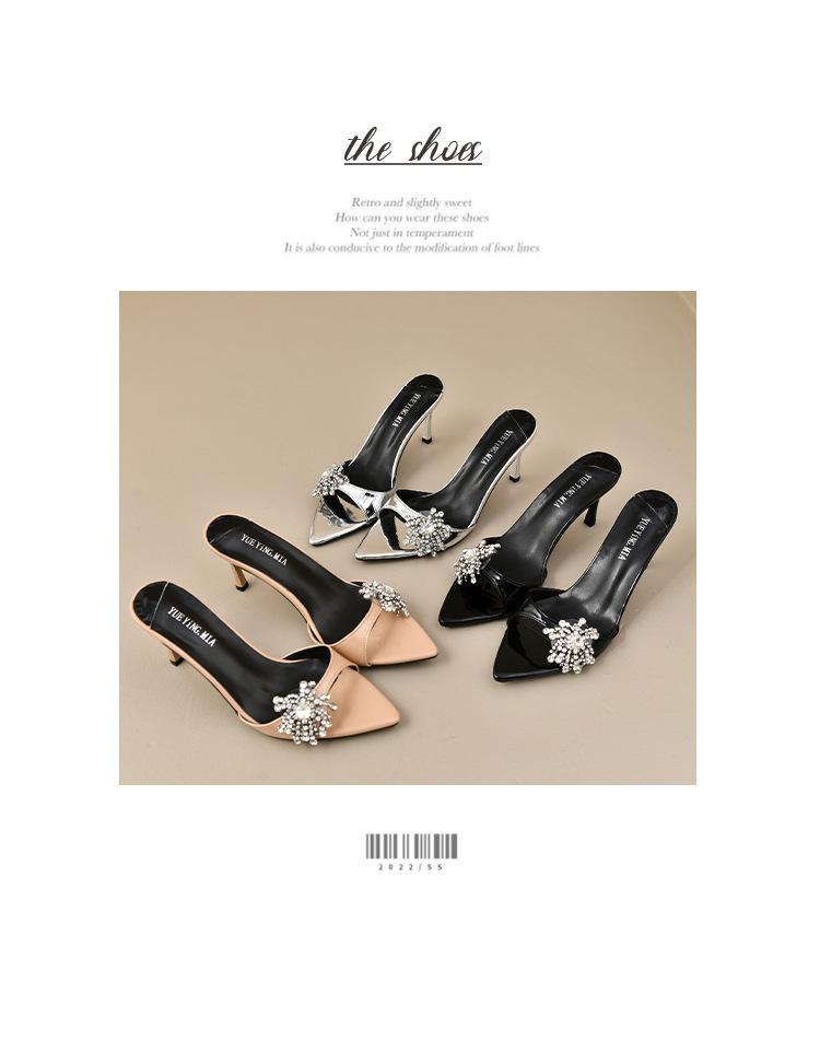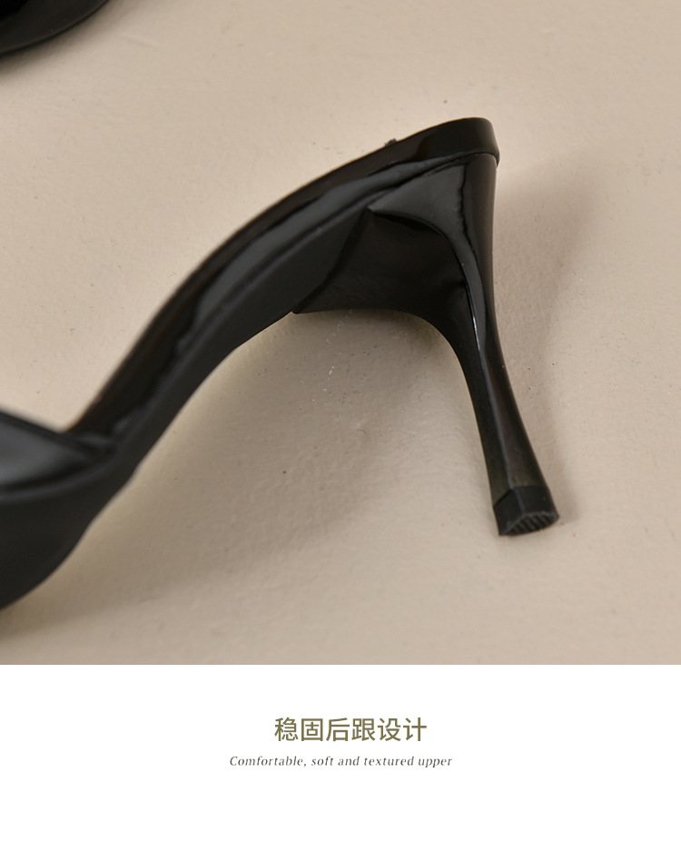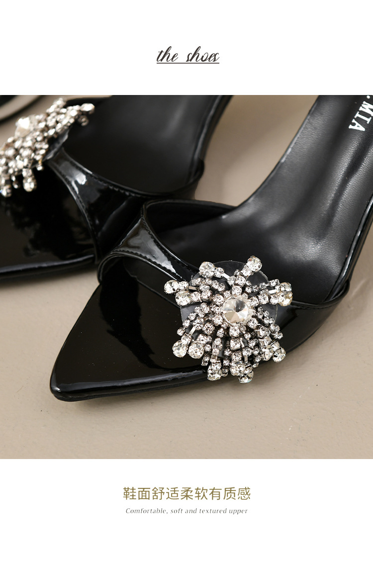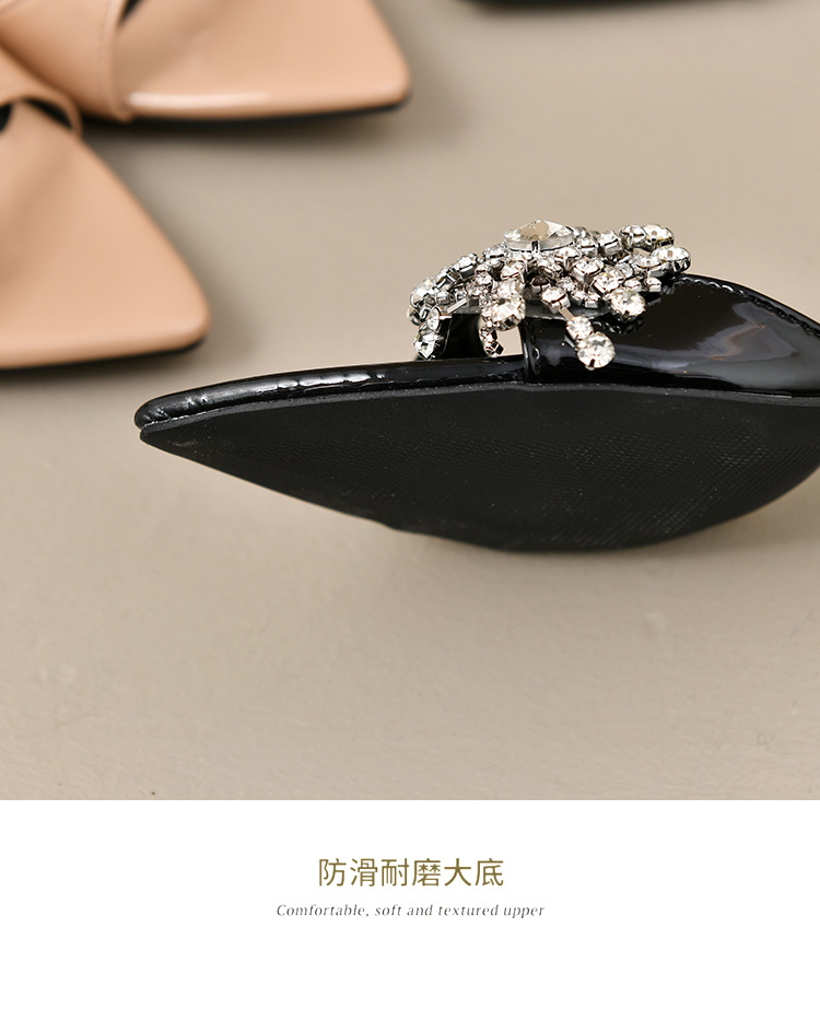 2025 년 새로운 여름 프랑스 특허 가죽 술 라인스톤 하이힐 샌들 여성용 블랙 슬리퍼 여성용 아우터웨어