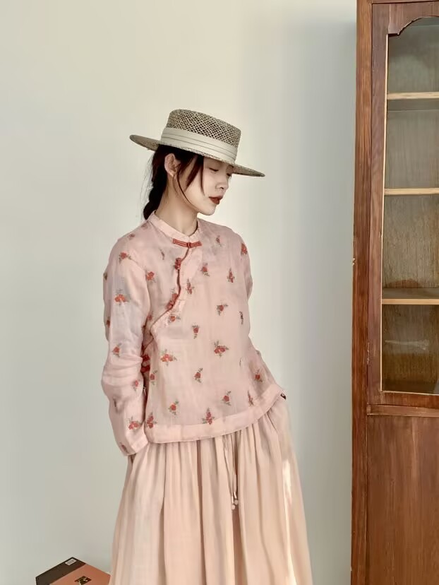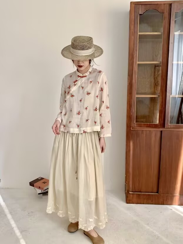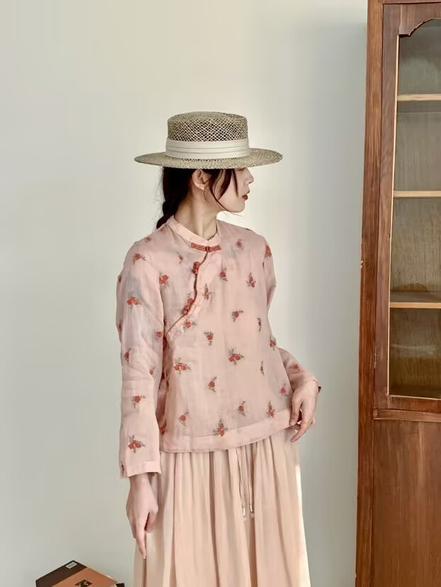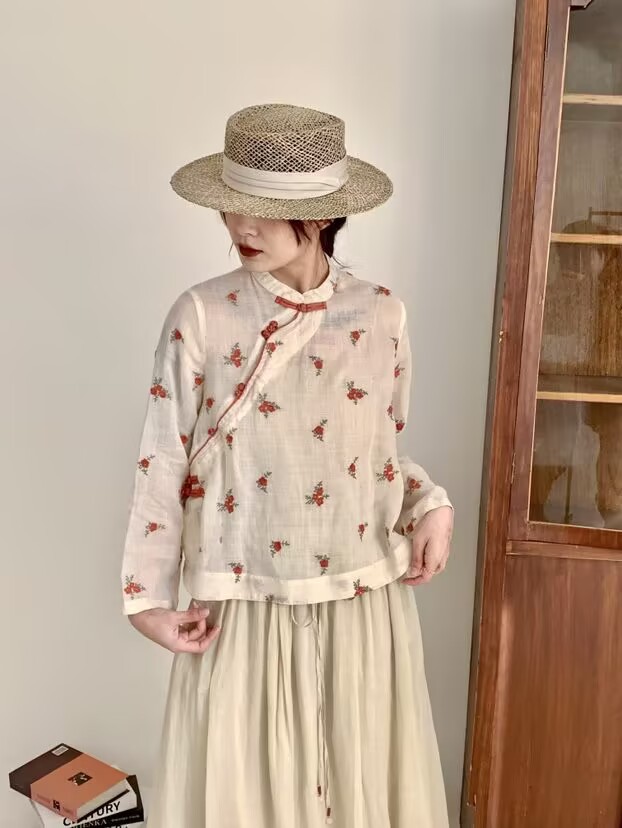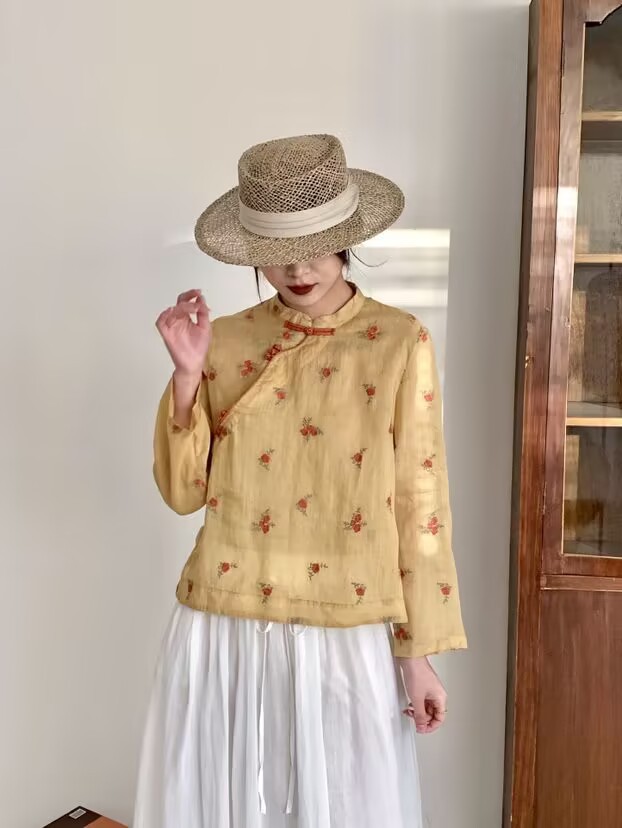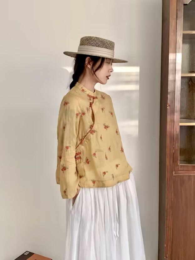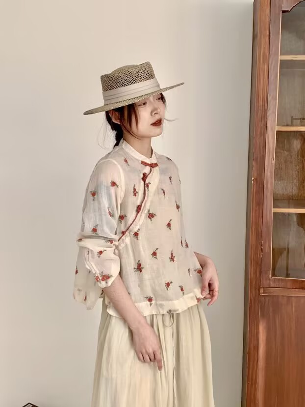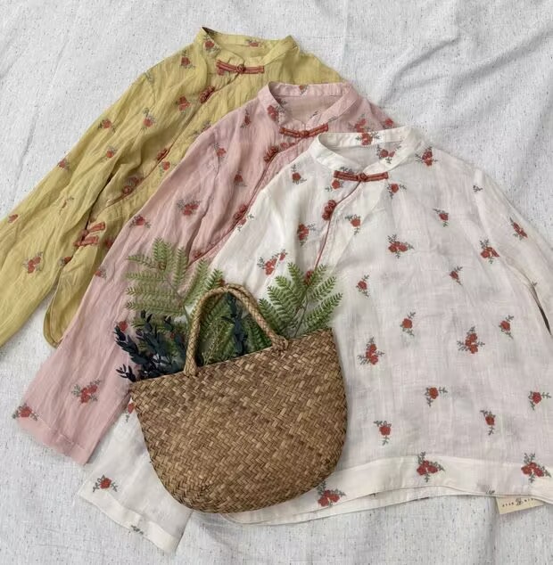 라미 셔츠 여성용 여름 중국 스타일 슬란 트 플래켓 버클 및 수직 칼라 민족 스타일 색상 차단 모든 경기 캐주얼 선 스크린 블라우스 티셔츠스토어 가기