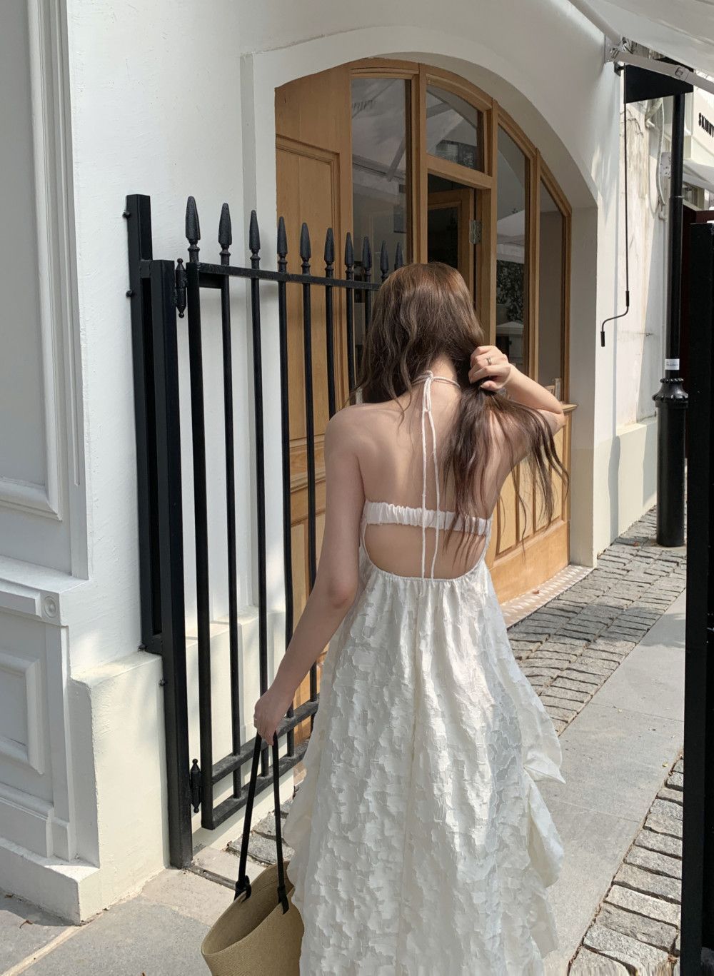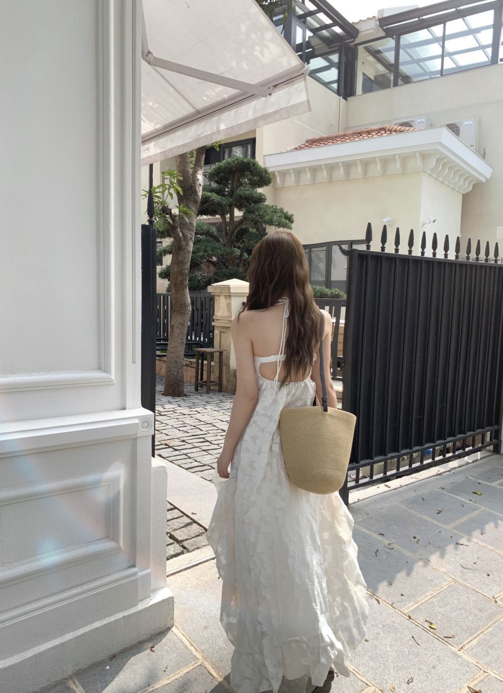 프랑스 스타일 목 원피스 여성 여름 해변 휴가 백리스 긴 원피스 슈퍼 페어리 우아한 루즈 A 라인 스커트