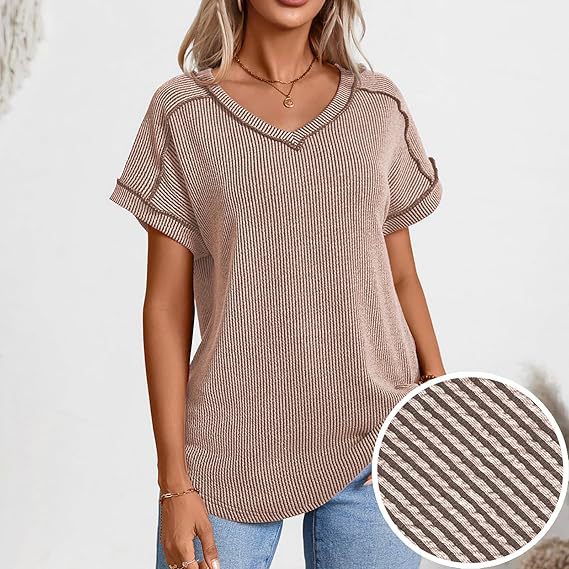 2025 봄과 여름 국경 유럽 및 미국 아마존 새로운 패션 2 색 트위스트 코튼 및 리넨 폭탄 반팔 V 넥 티셔츠 여성용 탑스토어 가기