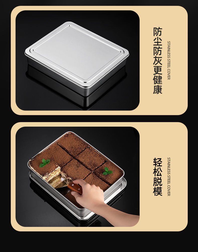 티라미수 플레이트 스테인레스 스틸 직사각형 플레이트 베이킹 케이크를위한 뚜껑 특수 플레이트가있는 직사각형 304 상자