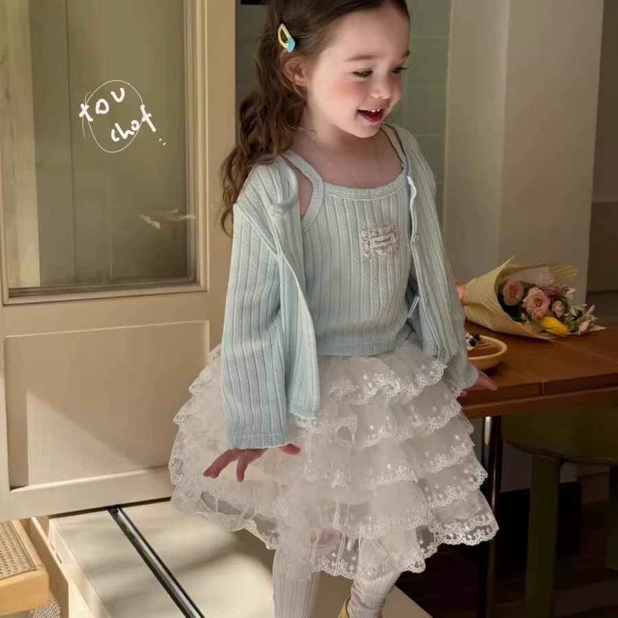 어린이 의류 25 봄 새 소녀 한국어 버전의 카디건 투피스 레이스 케이크 스커트 오버스커트 코트스토어 가기