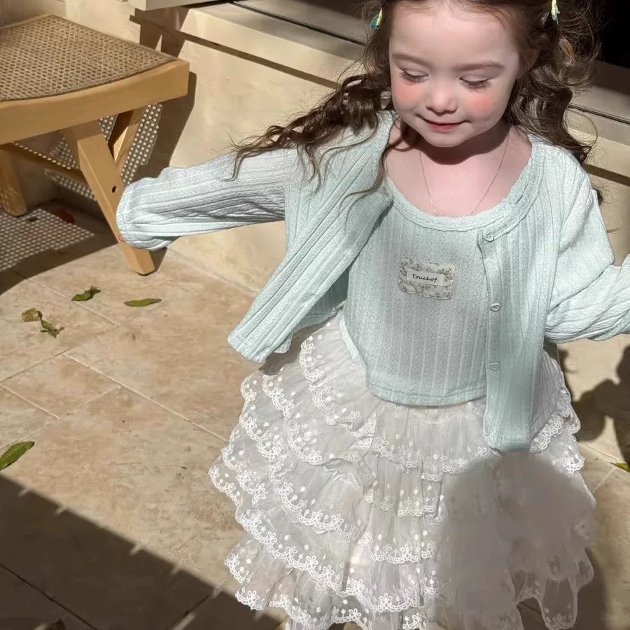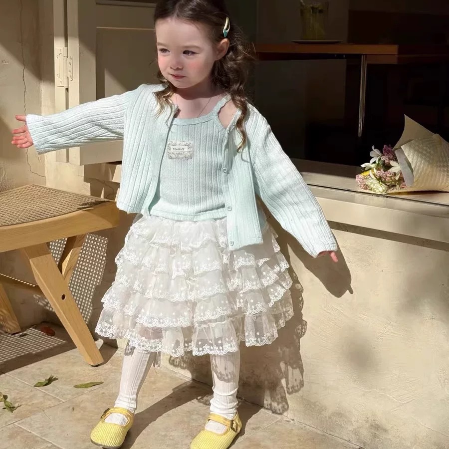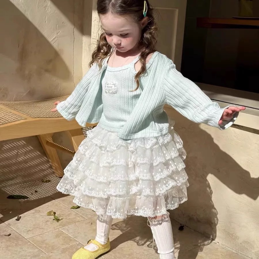 어린이 의류 25 봄 새 소녀 한국어 버전의 카디건 투피스 레이스 케이크 스커트 오버스커트 코트