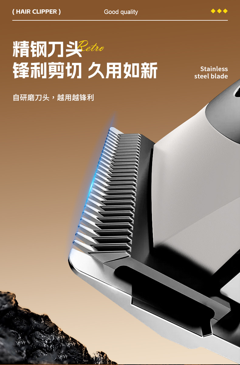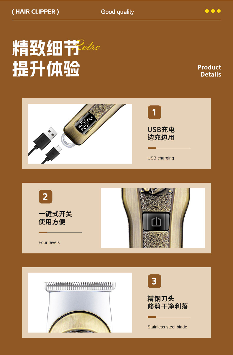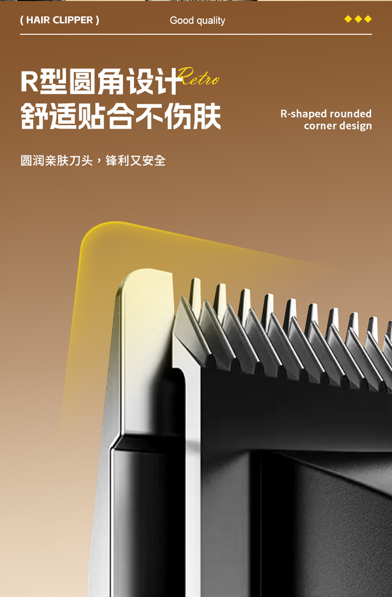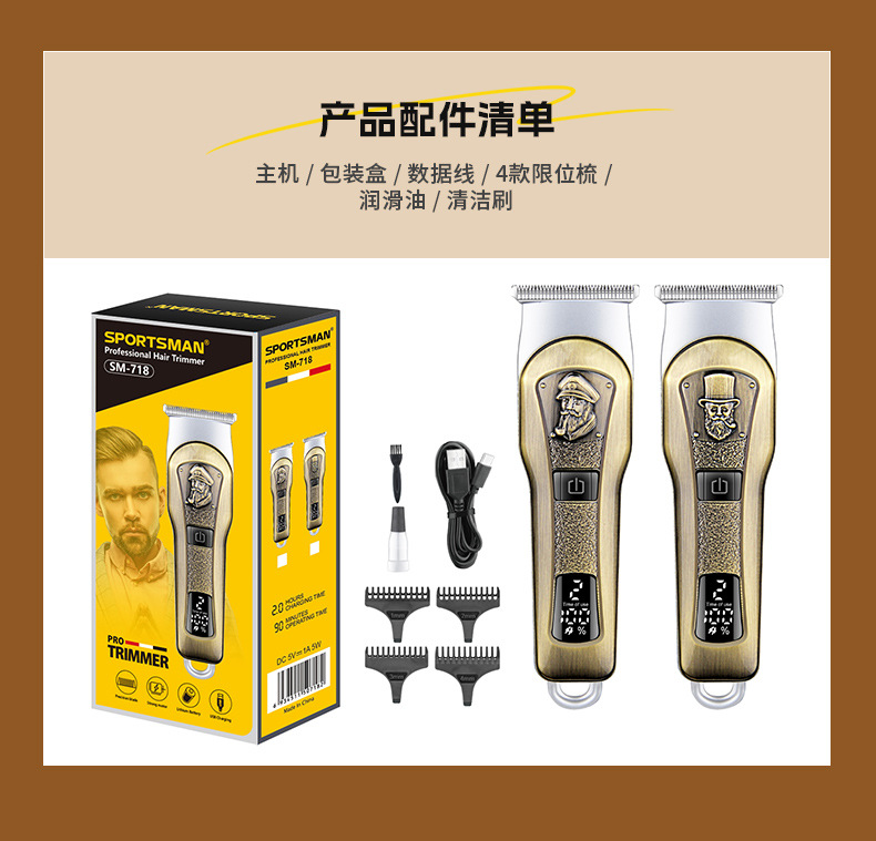 套装内含:理发器主机一个,限位梳4个,1-4mm,USB充电线,清洁刷,润滑油,英文说明书