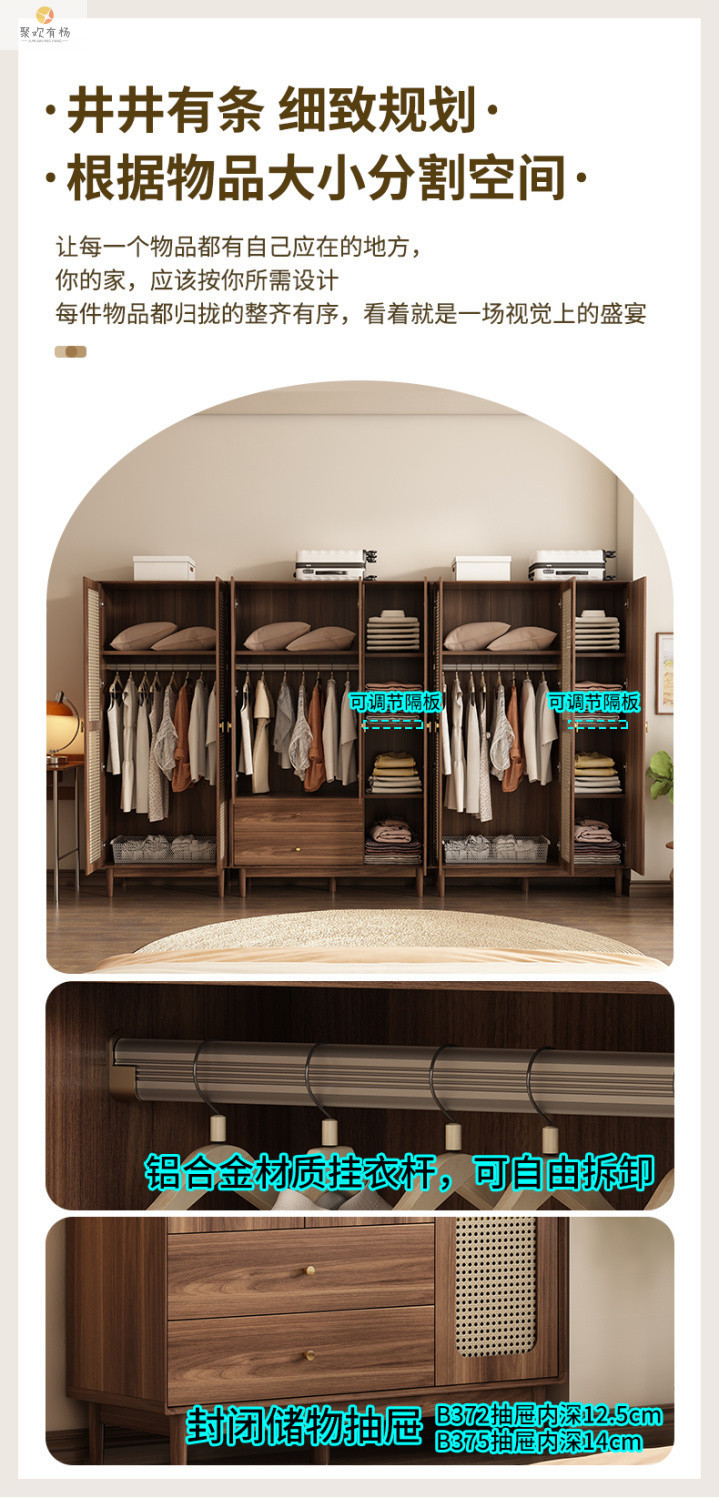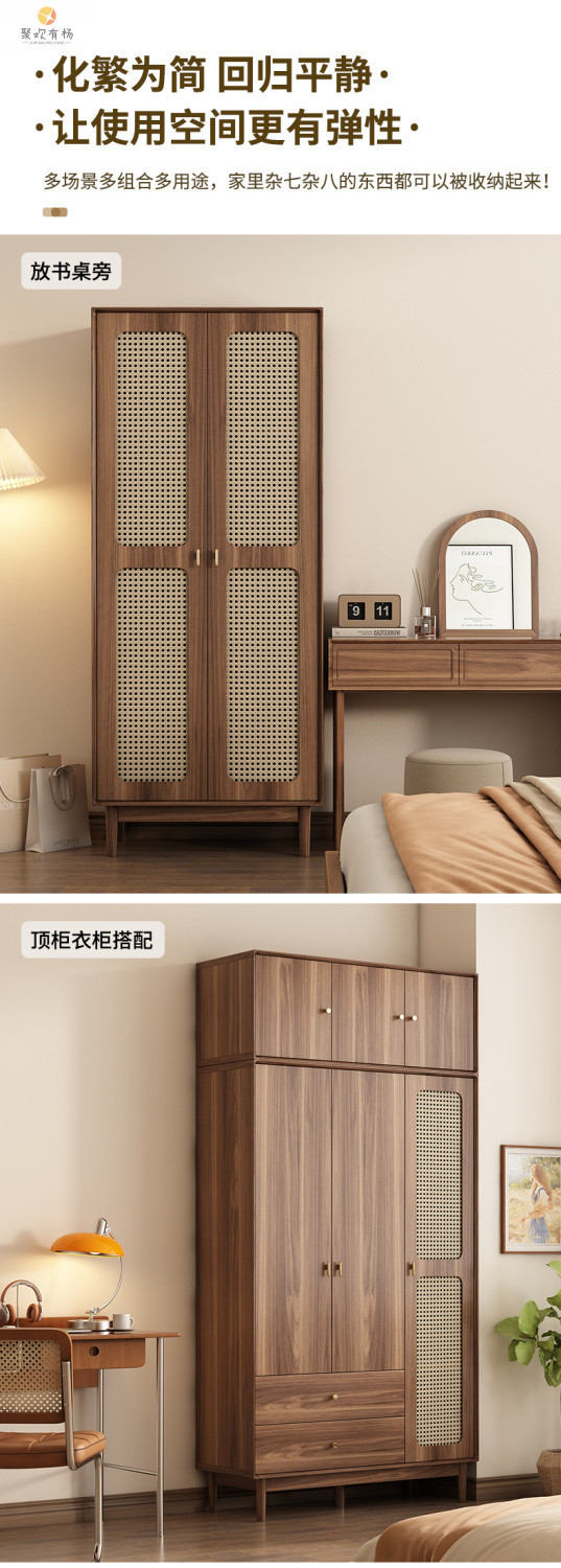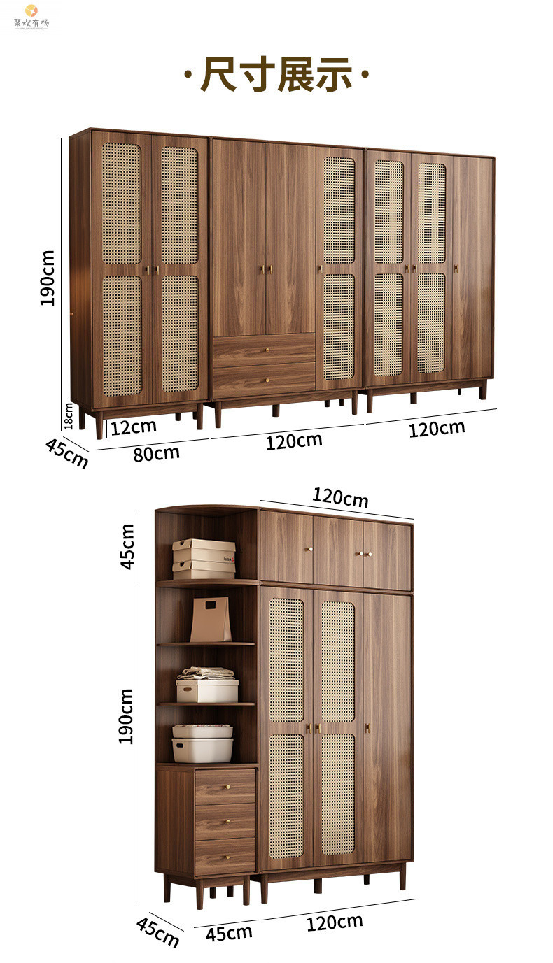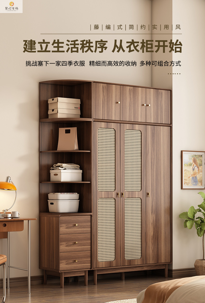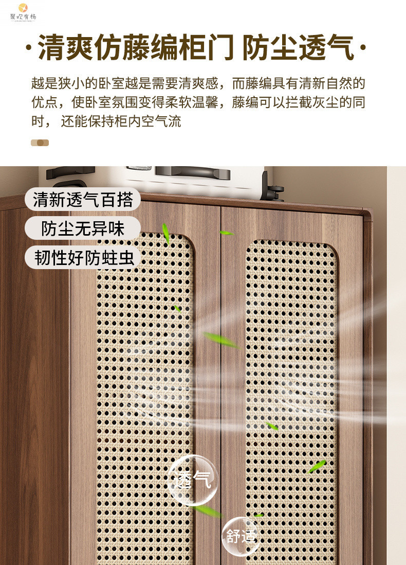 단단한 나무 등나무 문 옷장 새로운 중국식 침실 옷장 가정용 저장 캐비닛 작은 아파트 다층 대용량 캐비닛