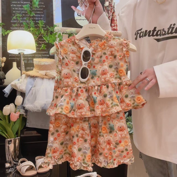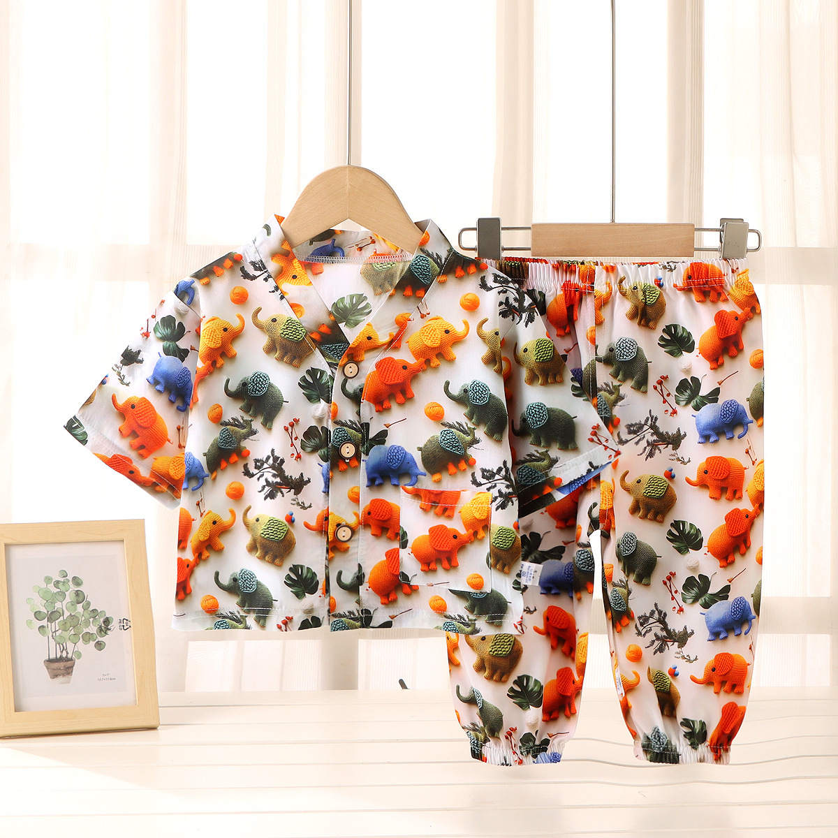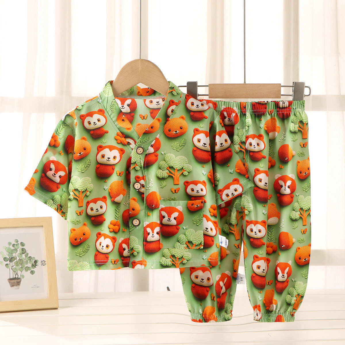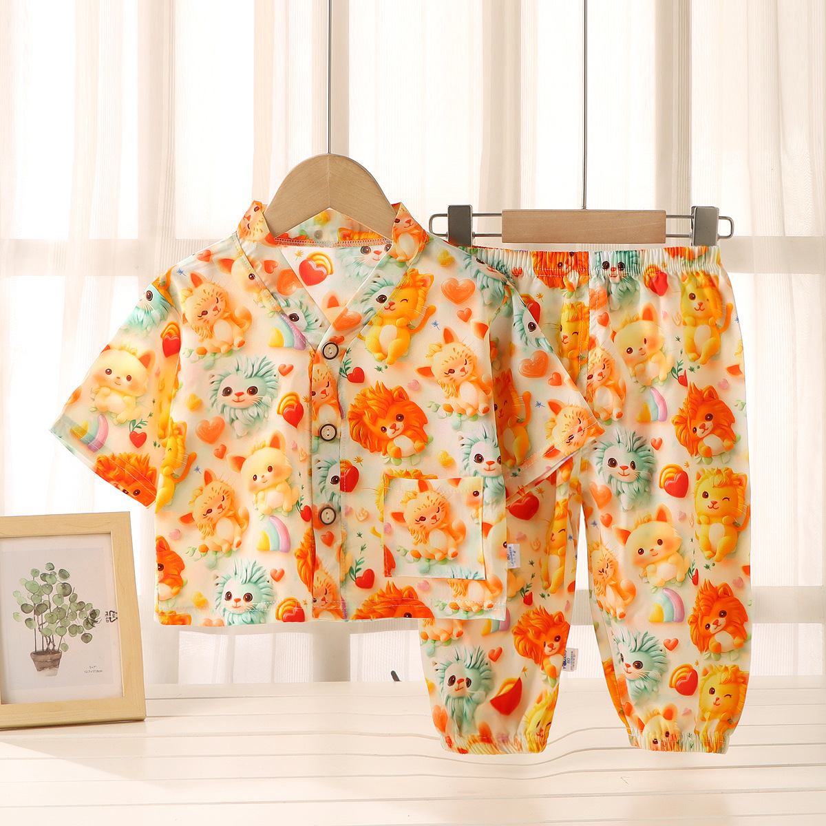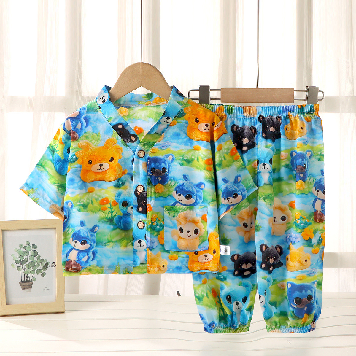 어린이 면 실크 홈 의류 세트 여름 새로운 남성과 여성의 얇은 3 차원 에어컨 의류 탑 바지 투피스스토어 가기