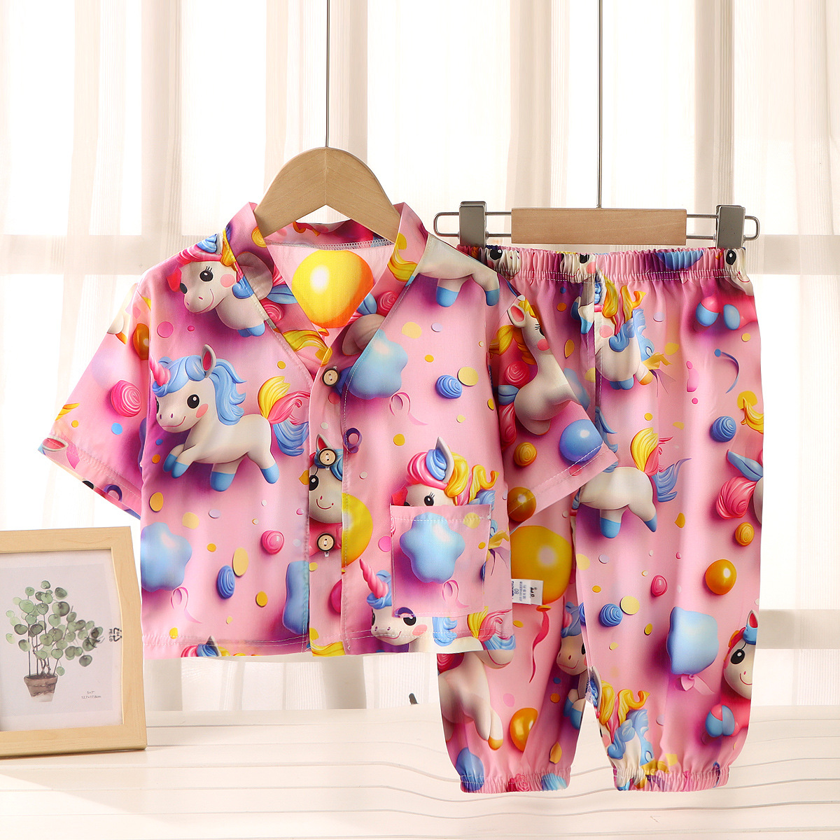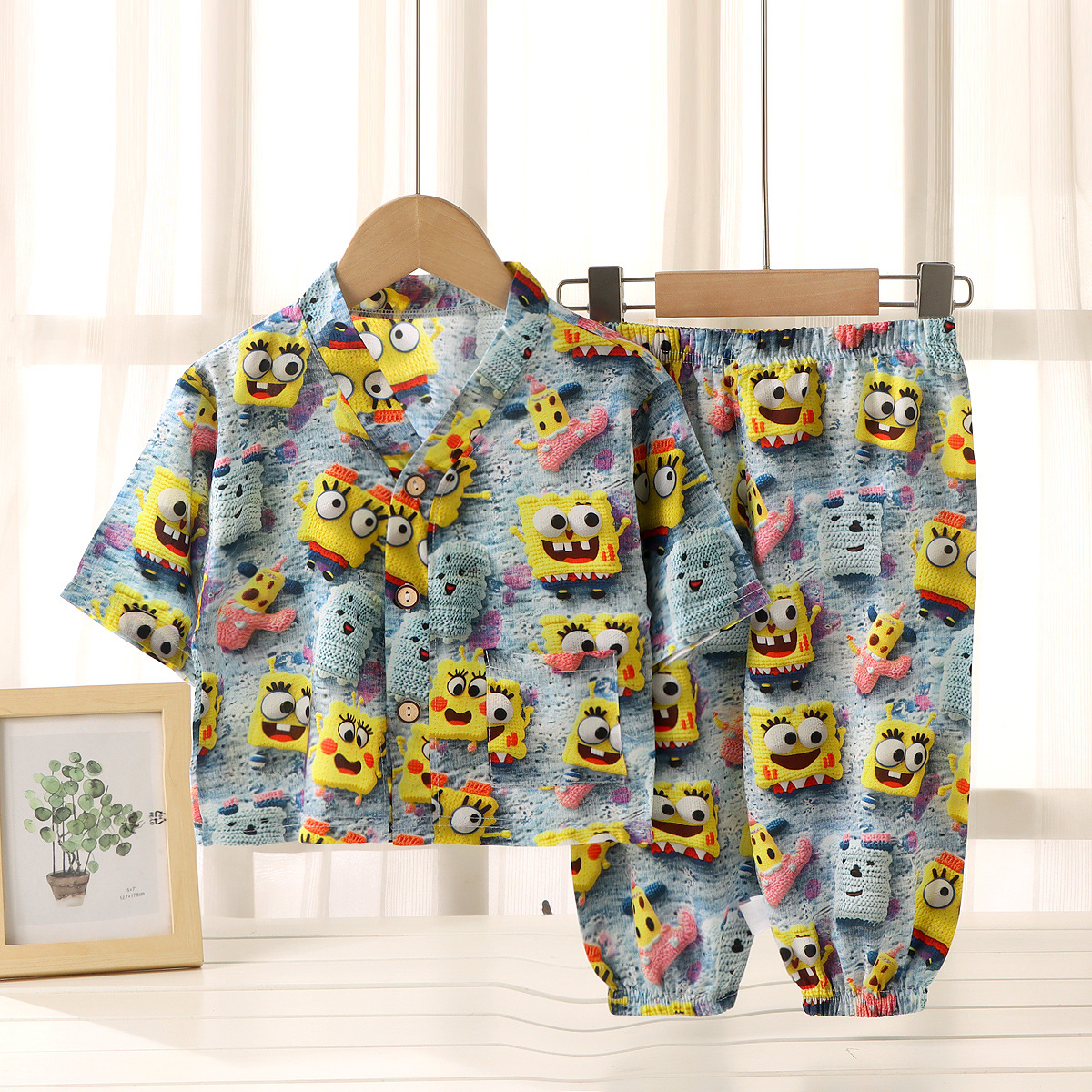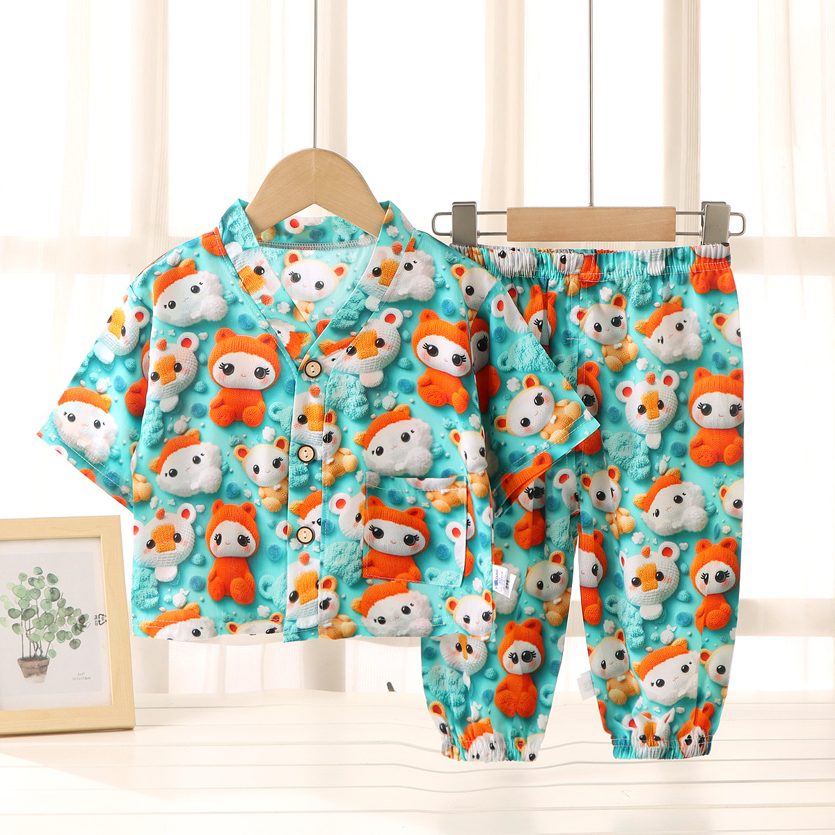 어린이 면 실크 홈 의류 세트 여름 새로운 남성과 여성의 얇은 3 차원 에어컨 의류 탑 바지 투피스