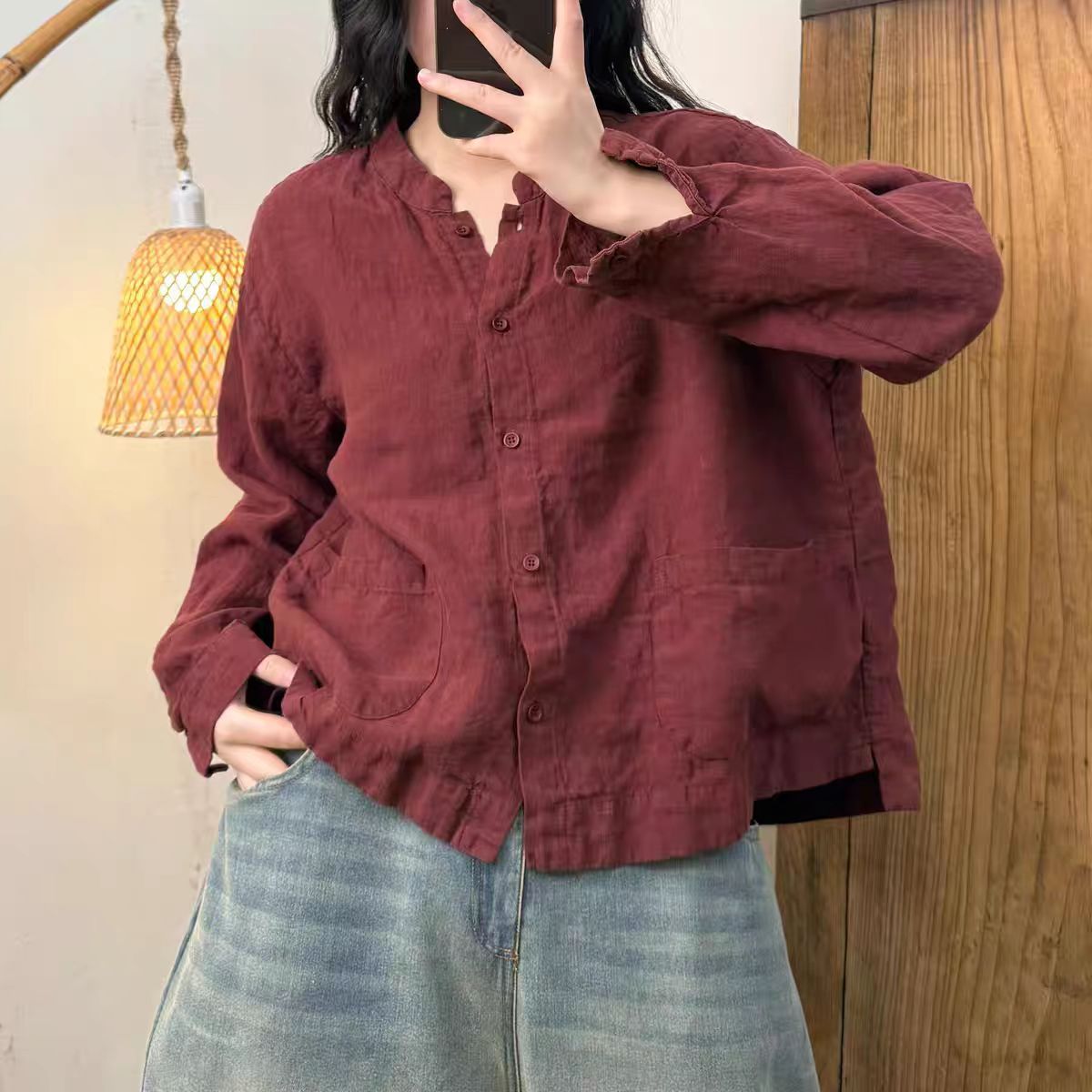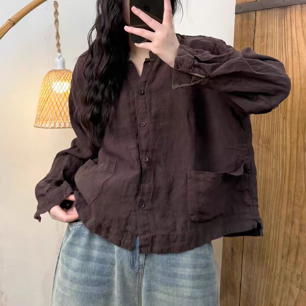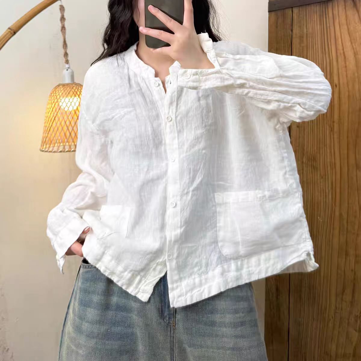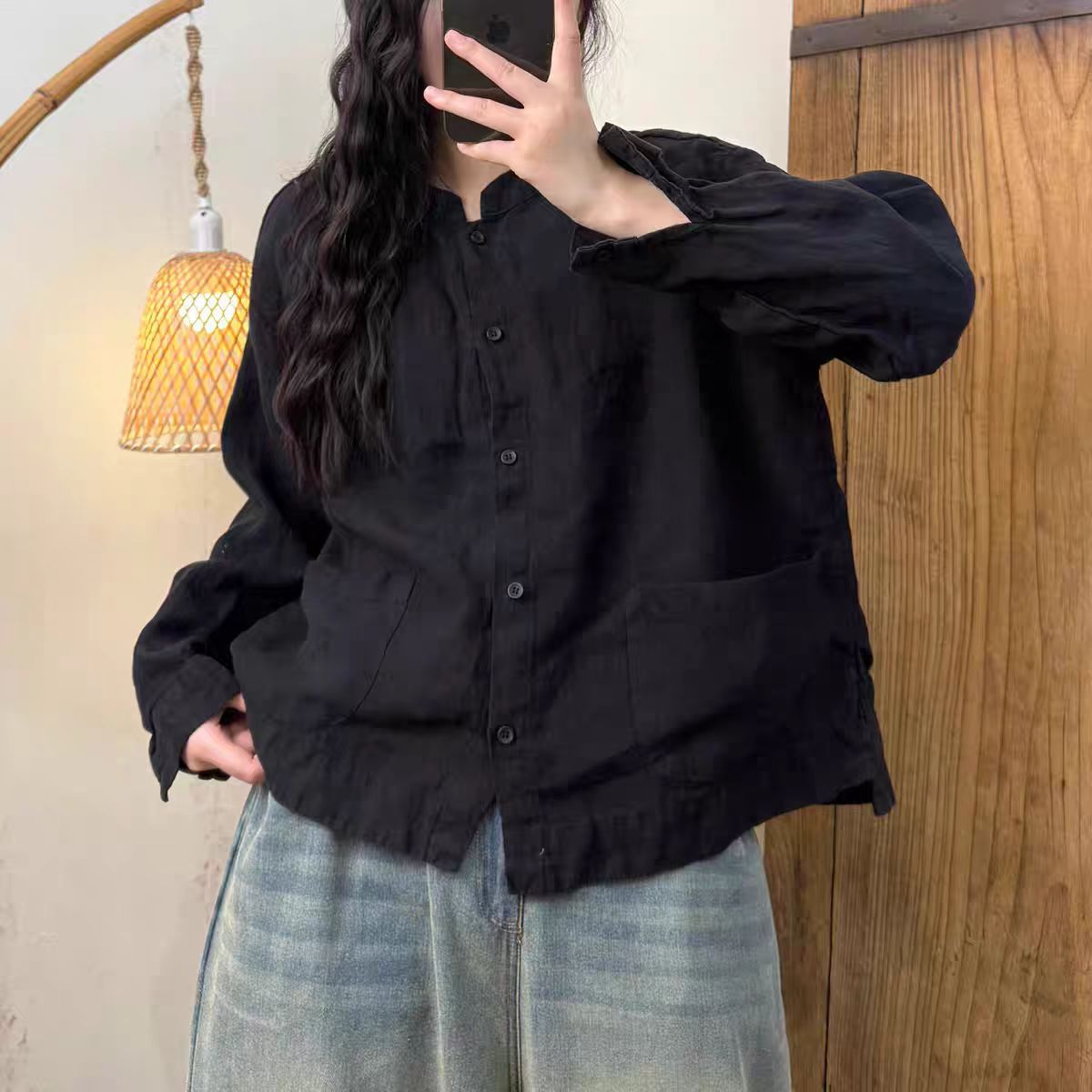 2025 봄 새로운 캐주얼 올 매치 하이 퀄리티 샌드 워시 린넨 버클 크루 넥 버클 롱 슬리브 탑 셔츠스토어 가기