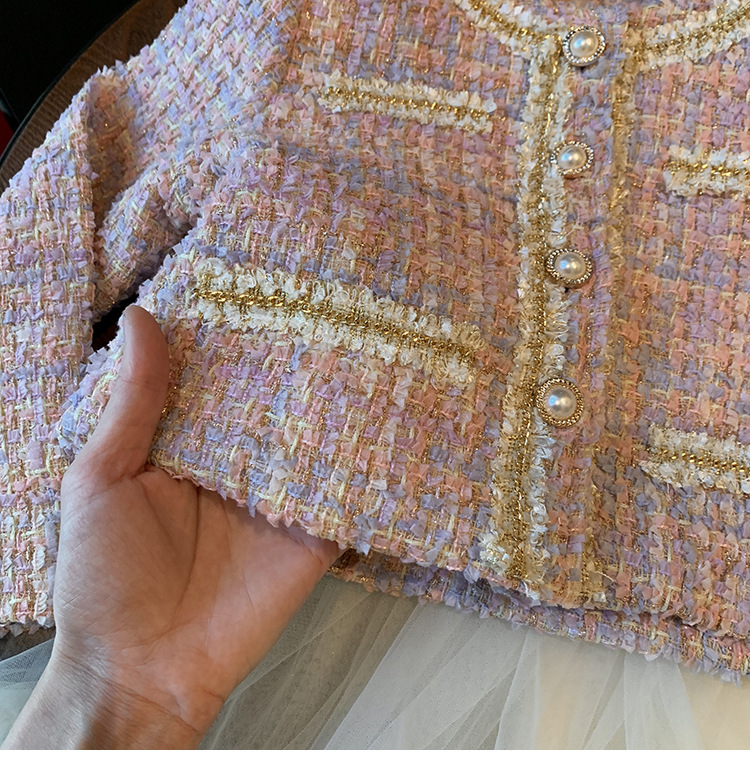 소녀의 샤넬 스타일 활 2024 가을 새로운 세트 스커트 아기 소녀의 투피스 메쉬 스타일라인 어린이 스커트