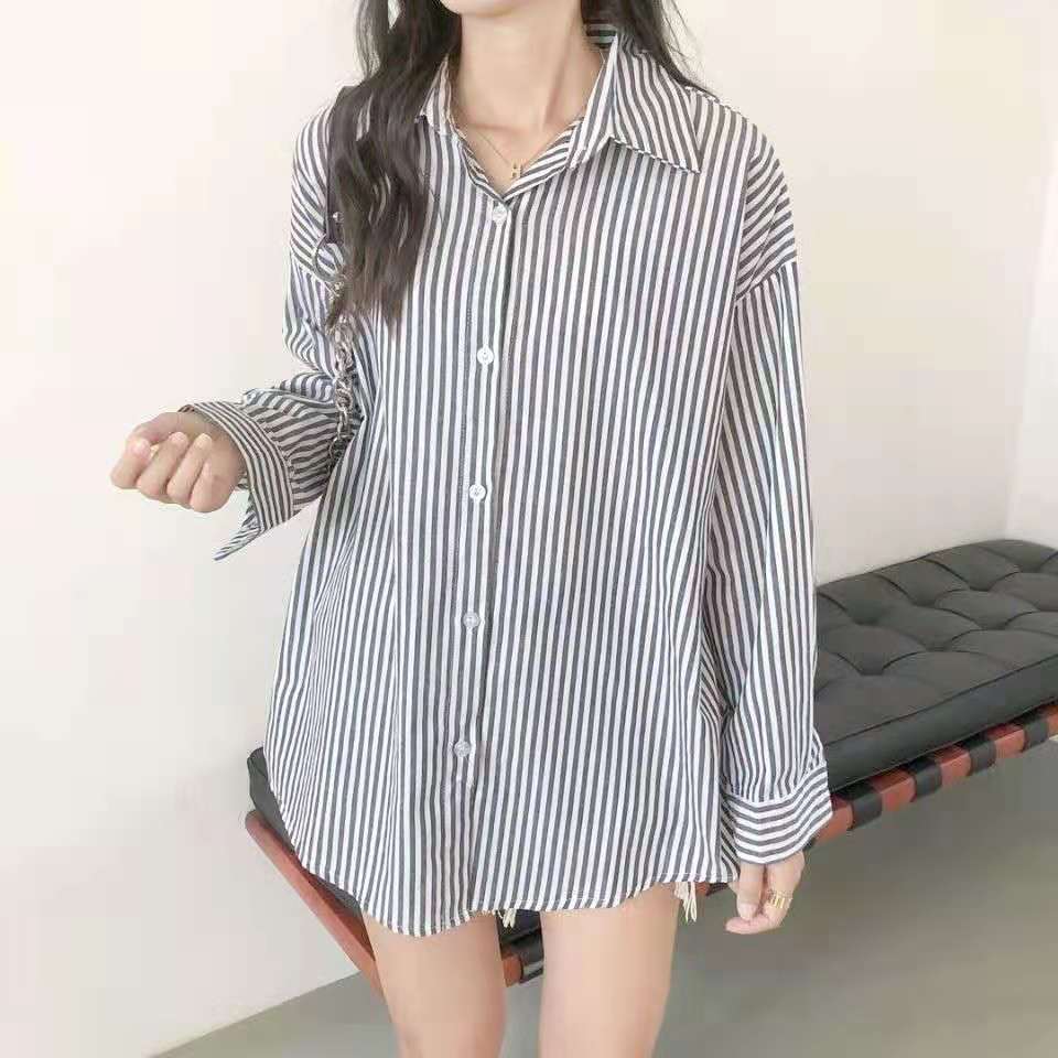 수직 스트라이프 스택 긴 소매 셔츠 여성의 봄과 가을 새로운 스타일 우아한 올 매치 레트로 홍콩 스타일 느슨한 한국 스타일 탑스토어 가기