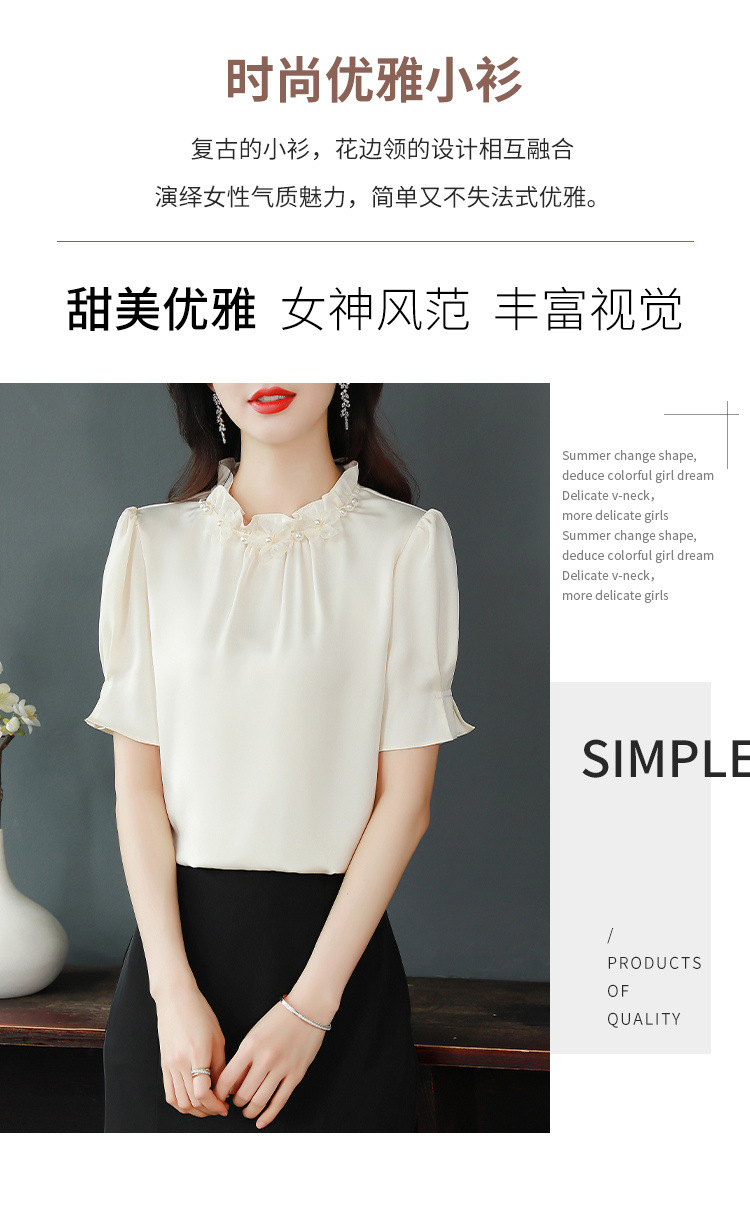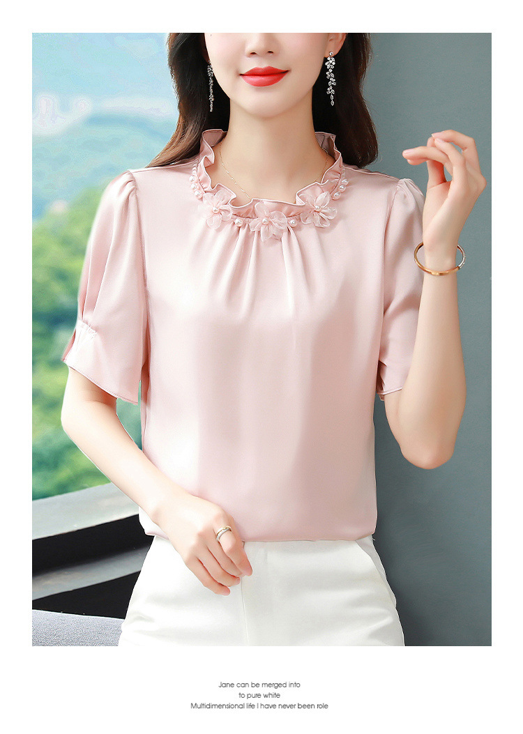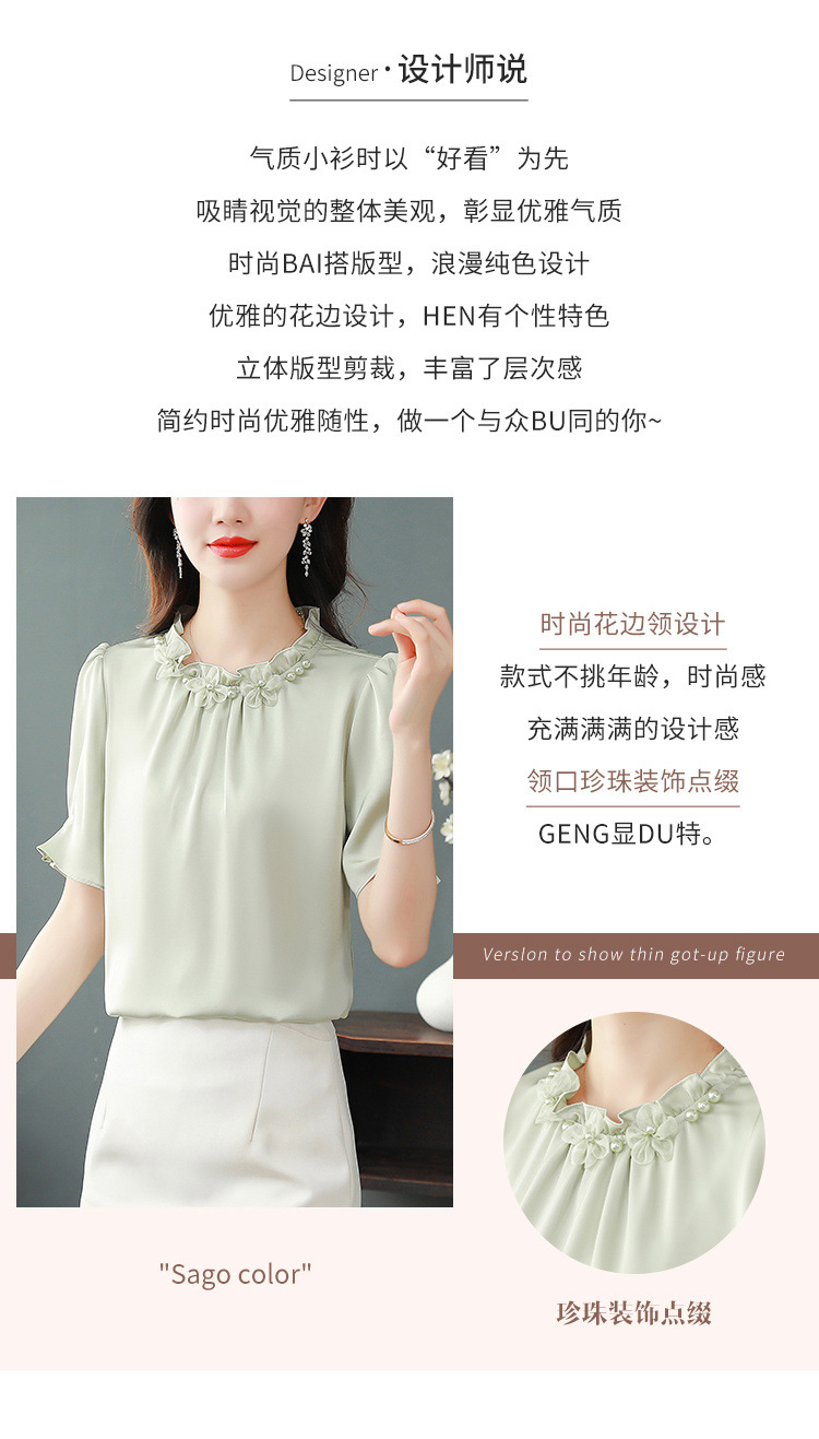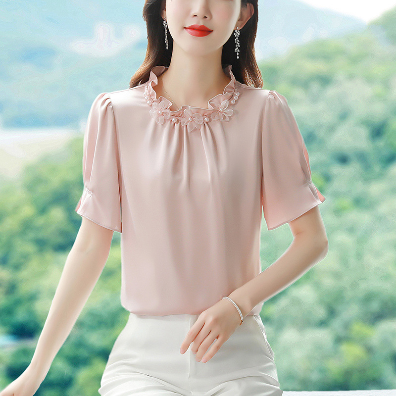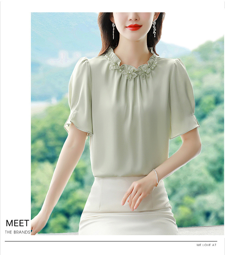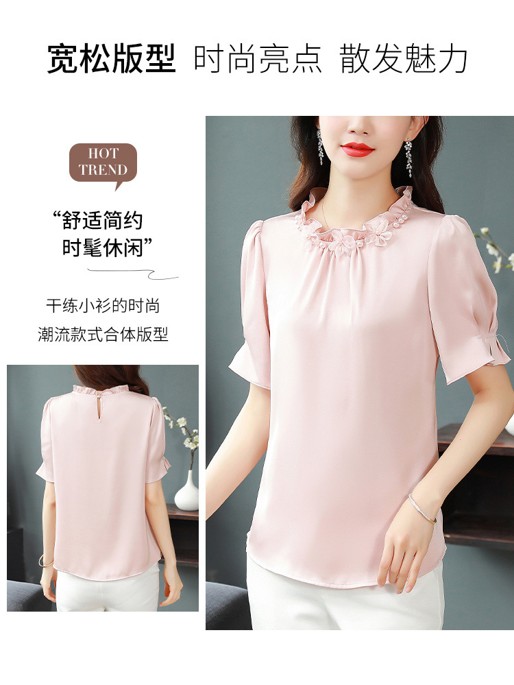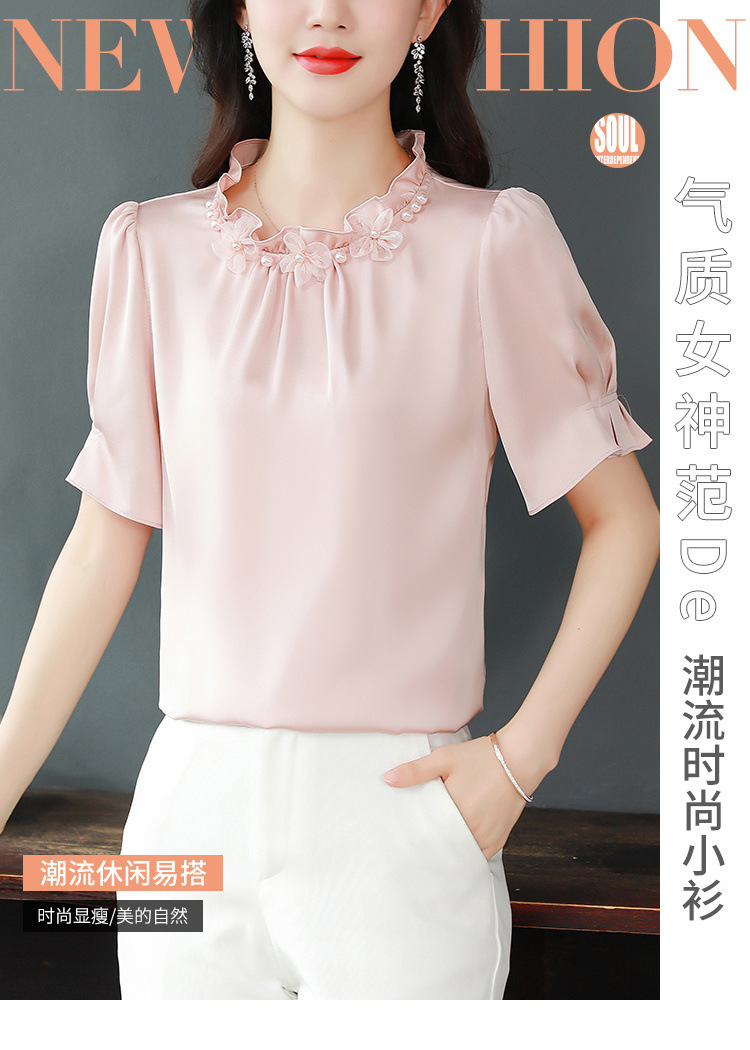 2025 년 새 여름 탑 여자 느슨한 배 덮개 셔츠 고급 올매치 달콤한 반팔 서양식 고급 새틴스토어 가기