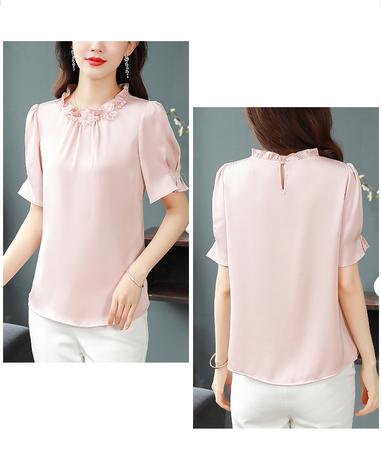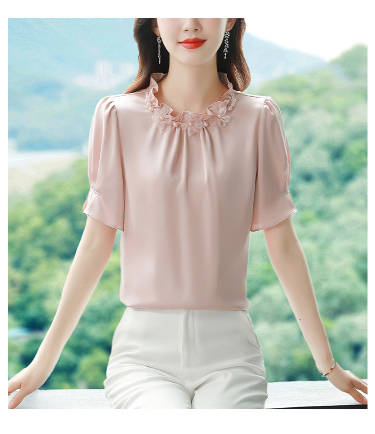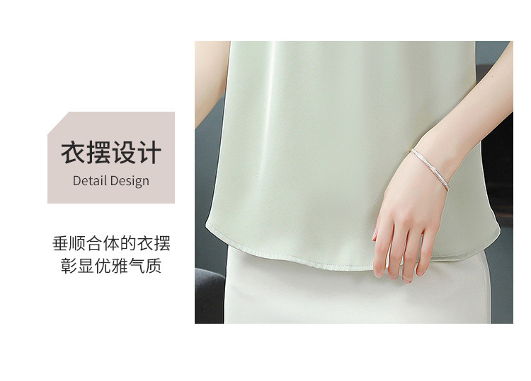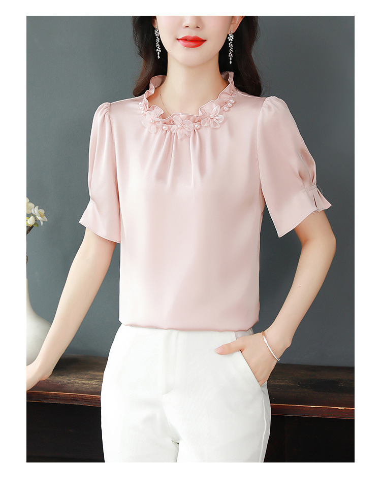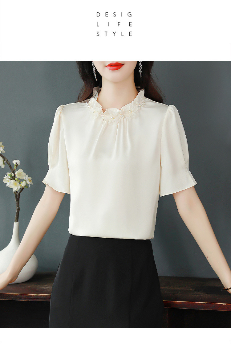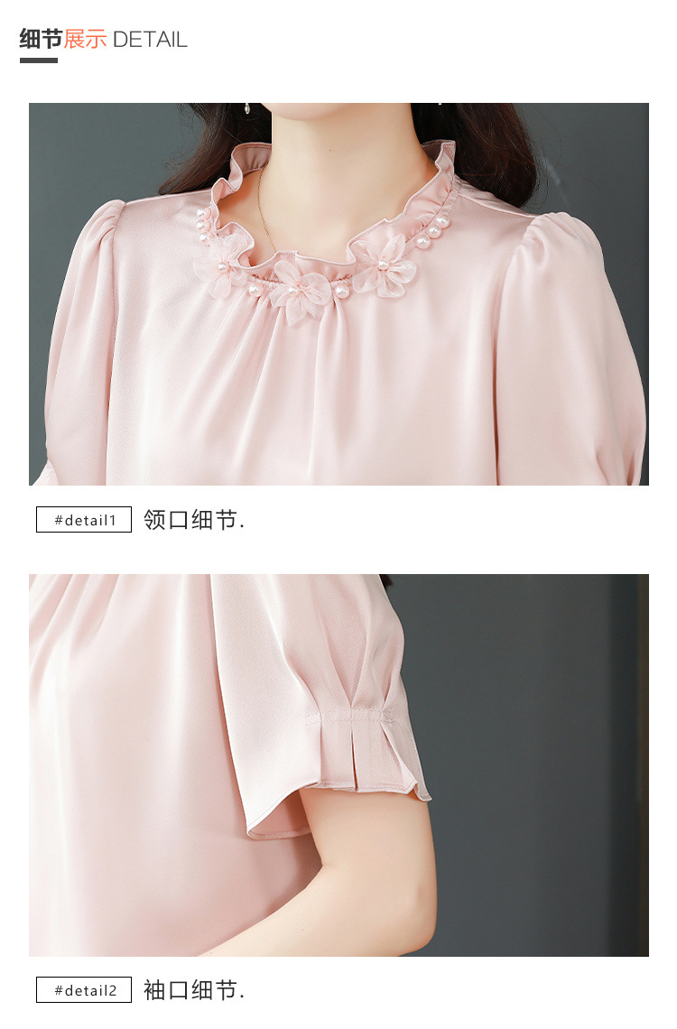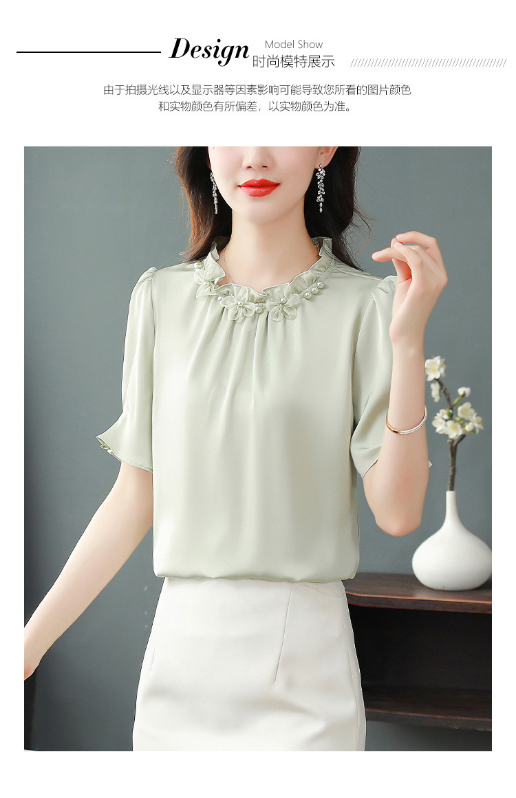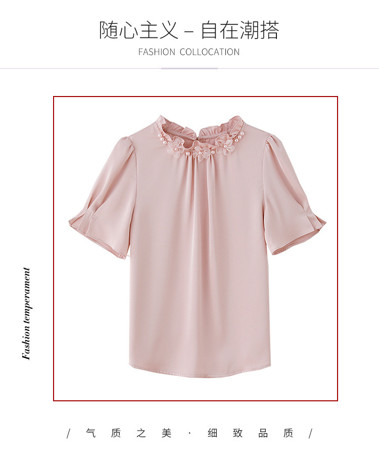 2025 년 새 여름 탑 여자 느슨한 배 덮개 셔츠 고급 올매치 달콤한 반팔 서양식 고급 새틴스토어 가기
