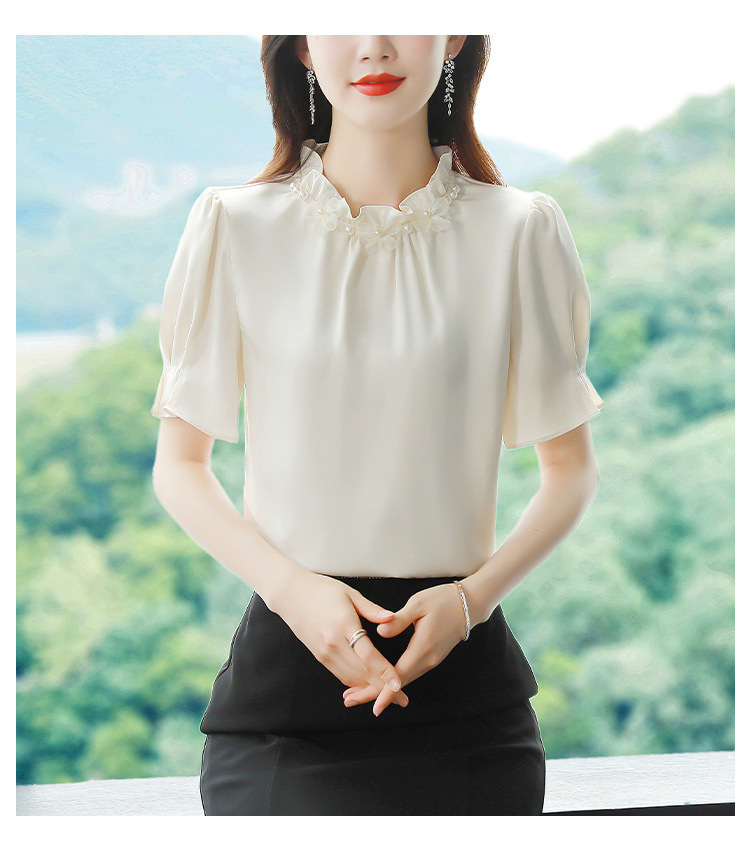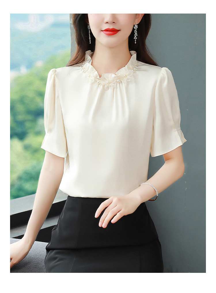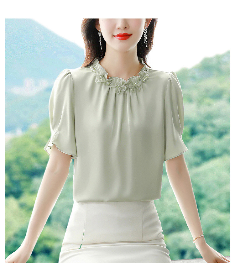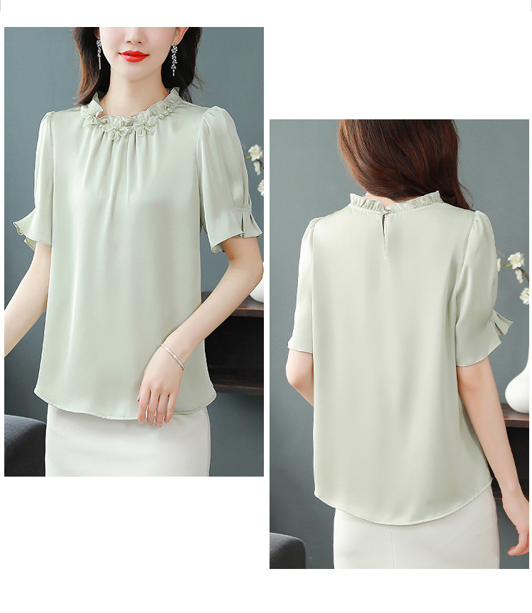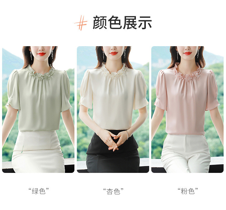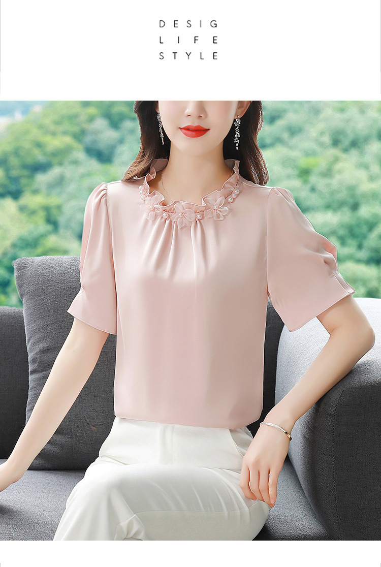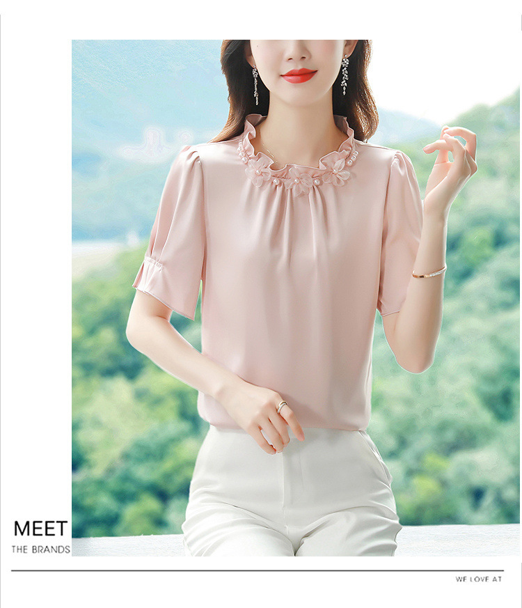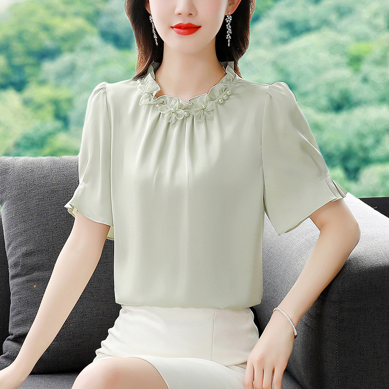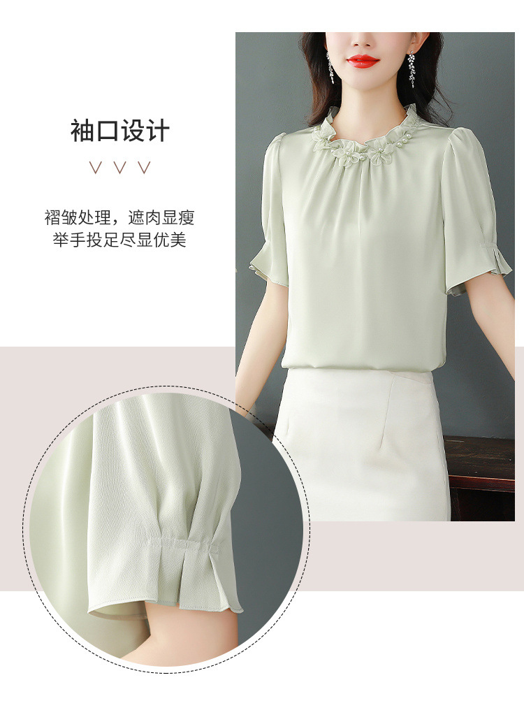 2025 년 새 여름 탑 여자 느슨한 배 덮개 셔츠 고급 올매치 달콤한 반팔 서양식 고급 새틴스토어 가기