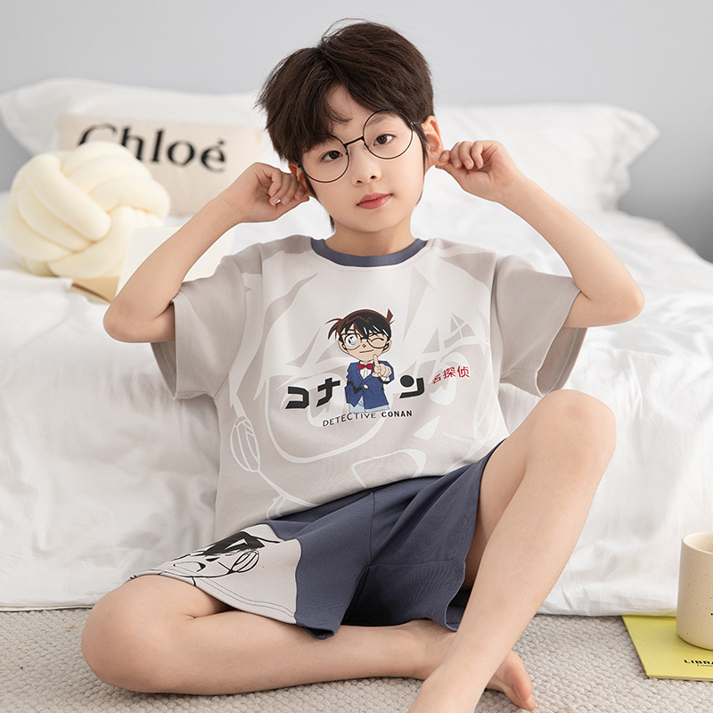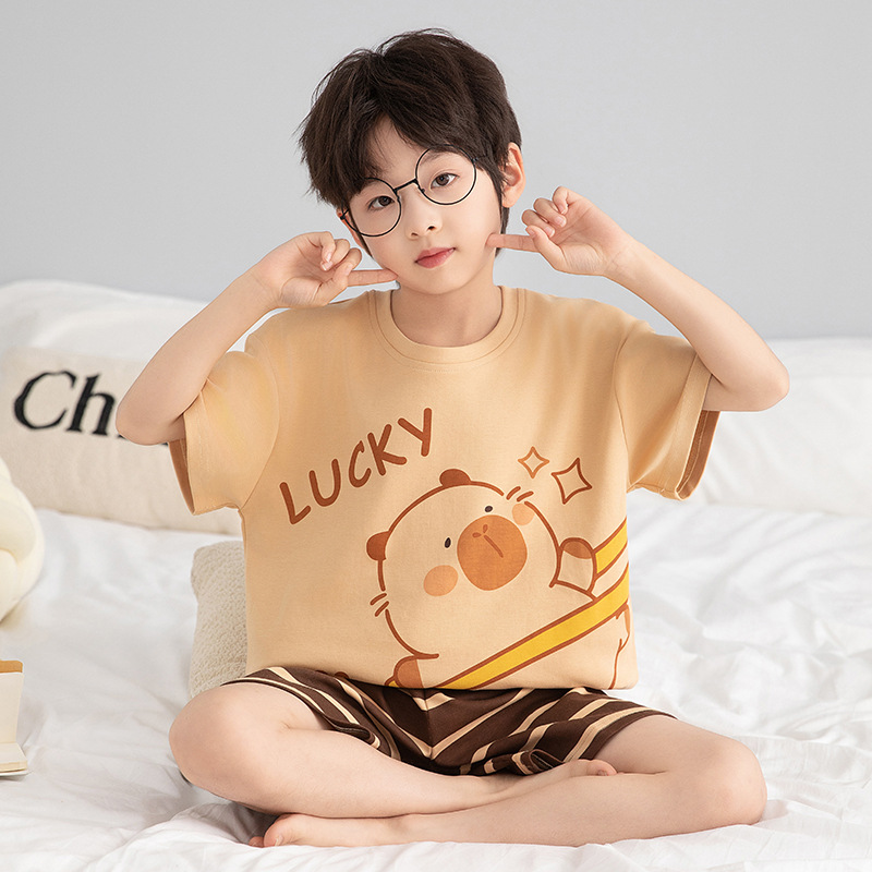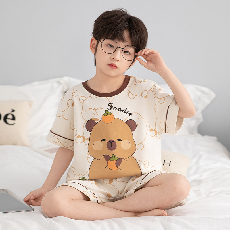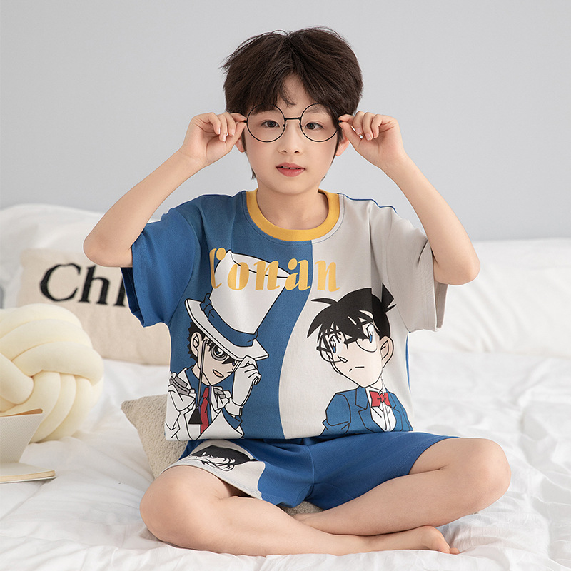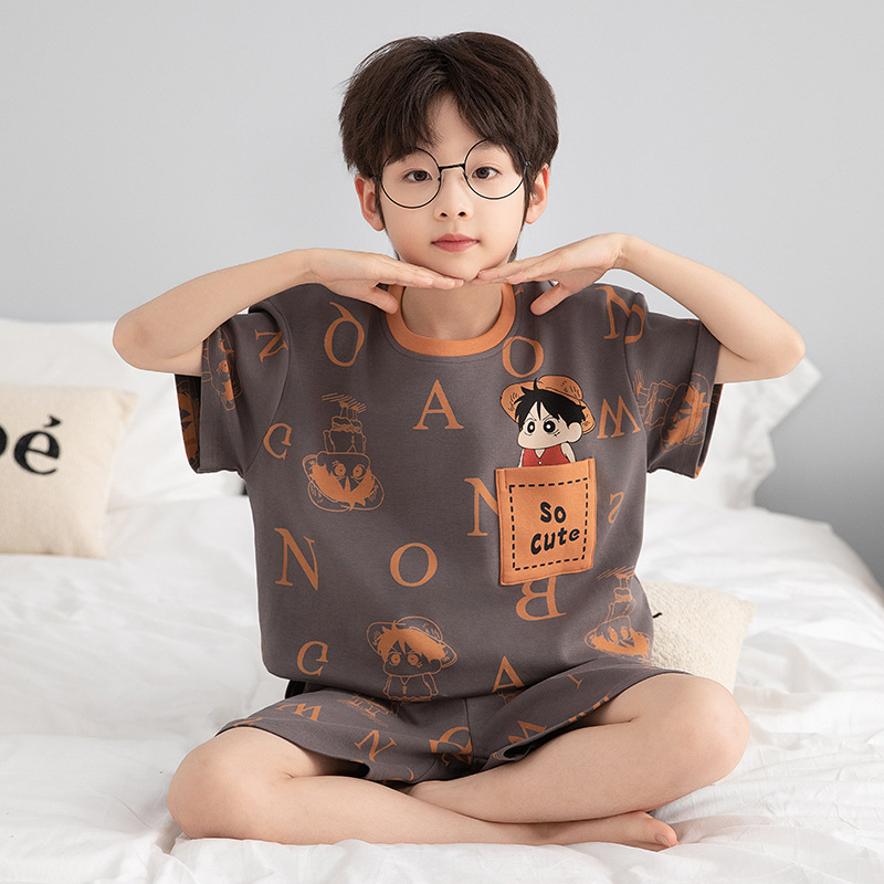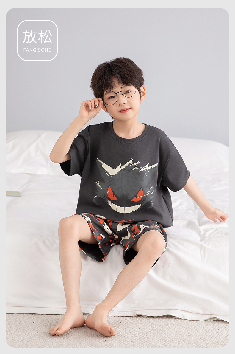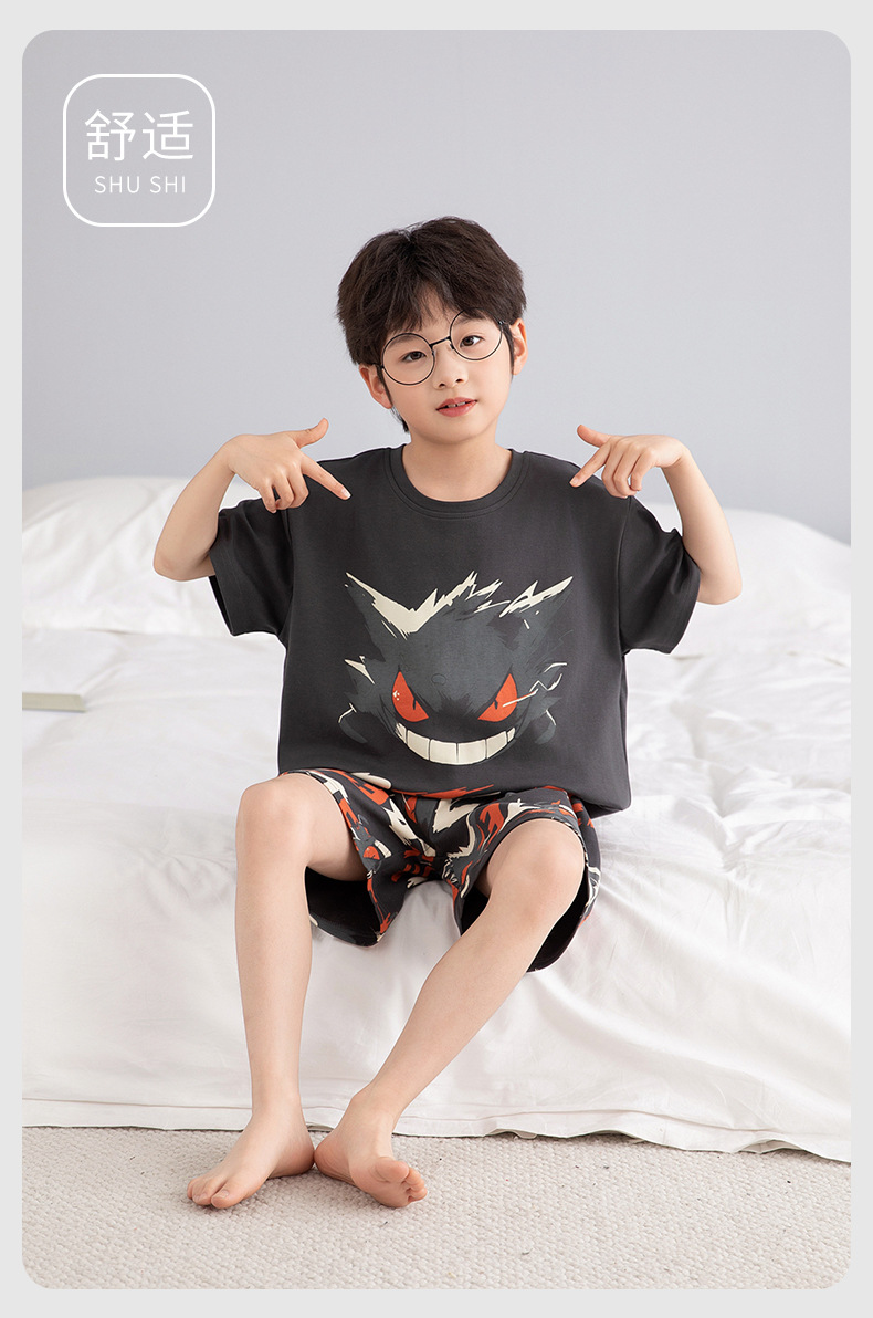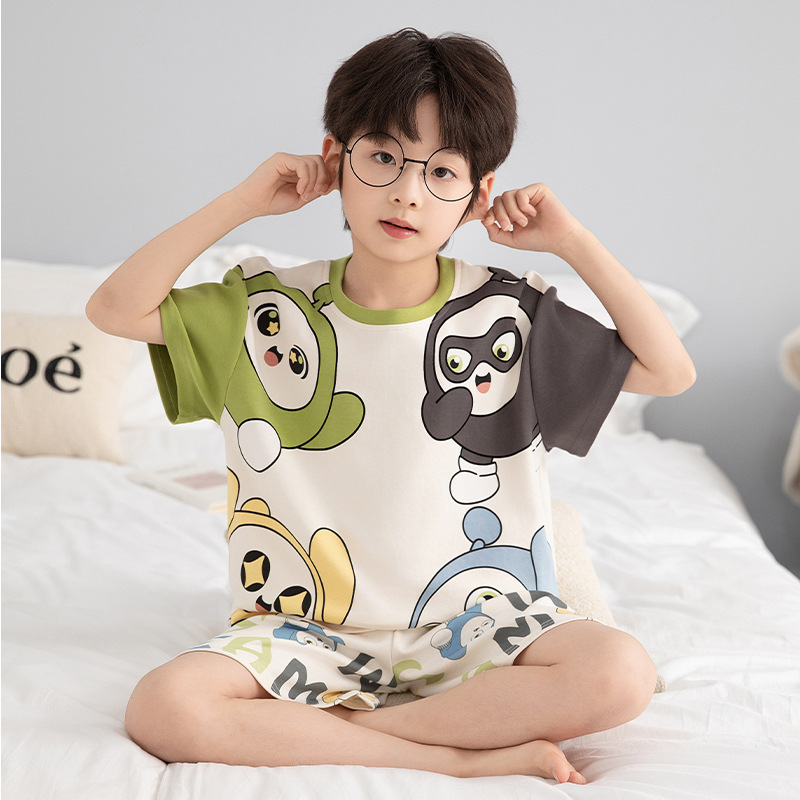 남학생 잠옷 여름 순면 짧은 소매 반바지 십대 소년 아기 학생 캐주얼 에어컨 홈 의류 세트