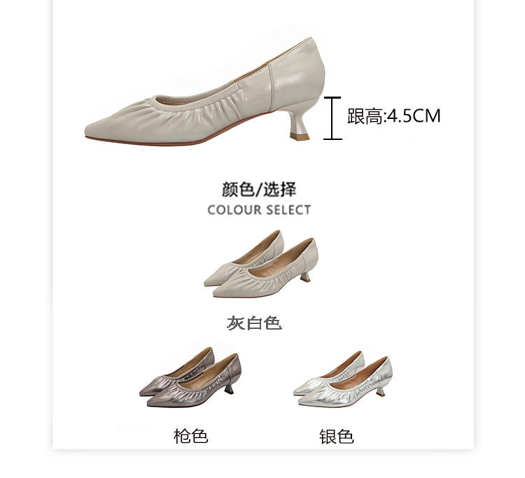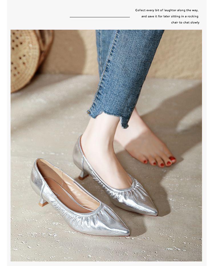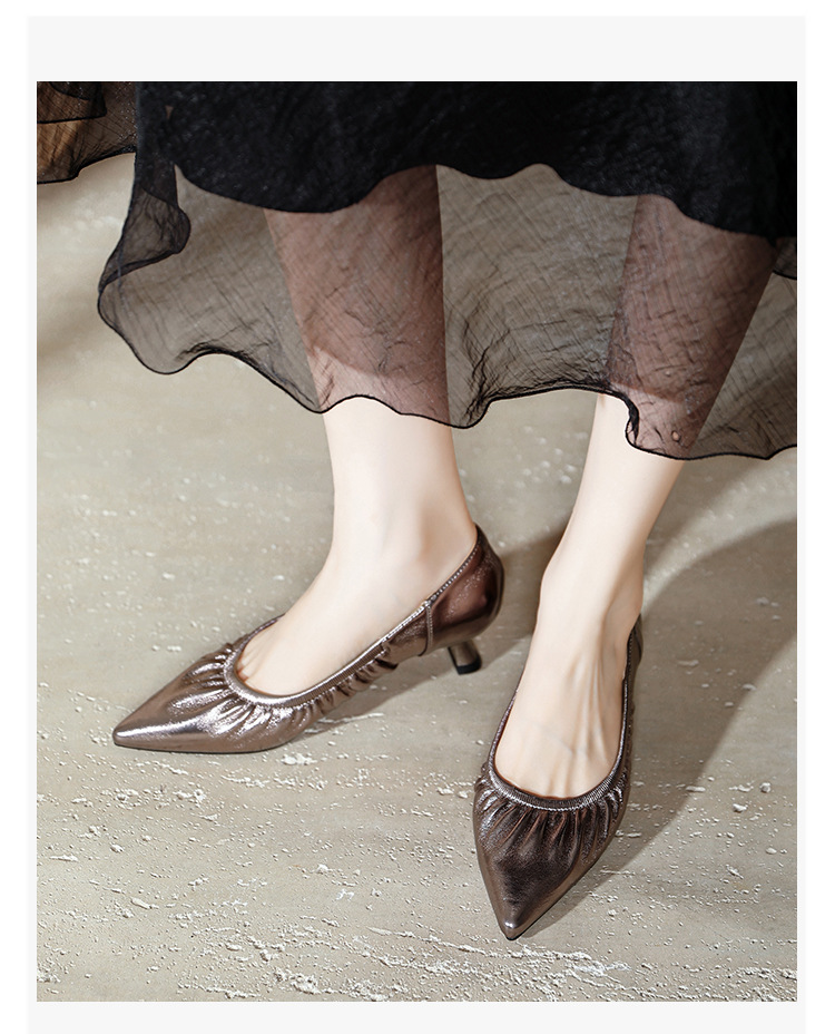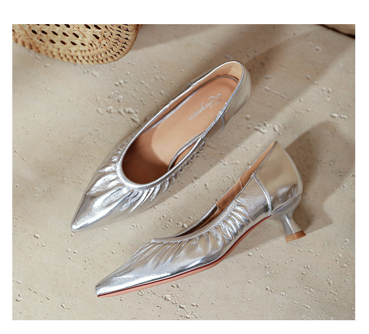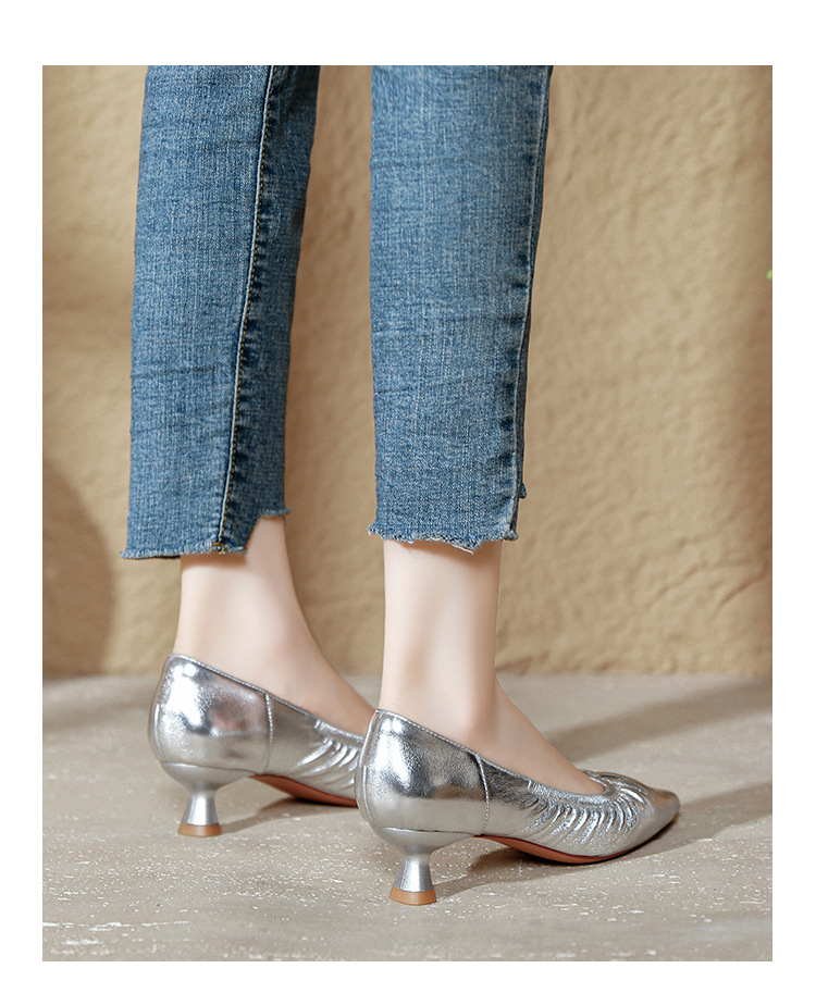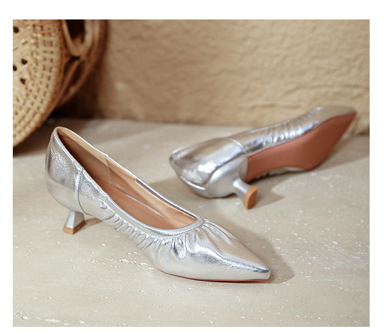 스틸레토 힐 실버 신발 부드러운 가죽 주름 통근 작업 신발 뾰족한 하이힐 2025 새 봄과 가을 여성 신발 미들스토어 가기
