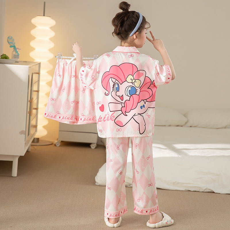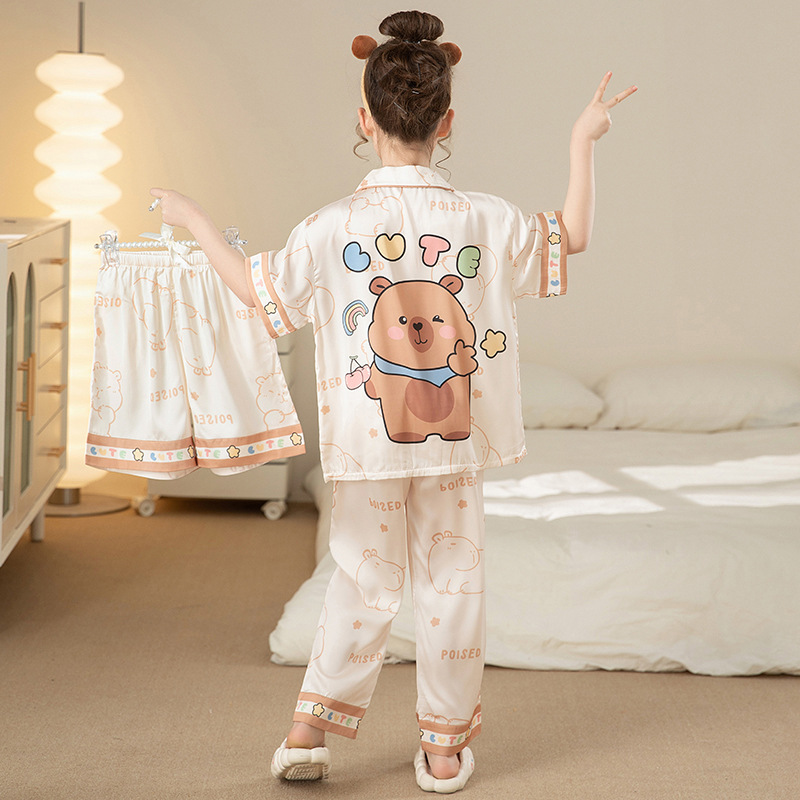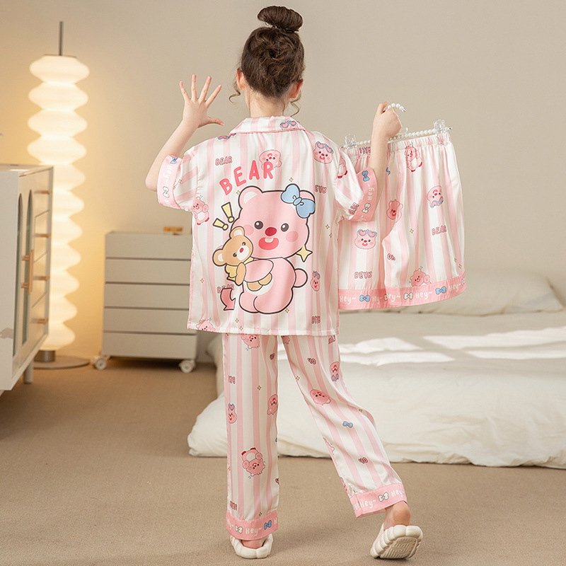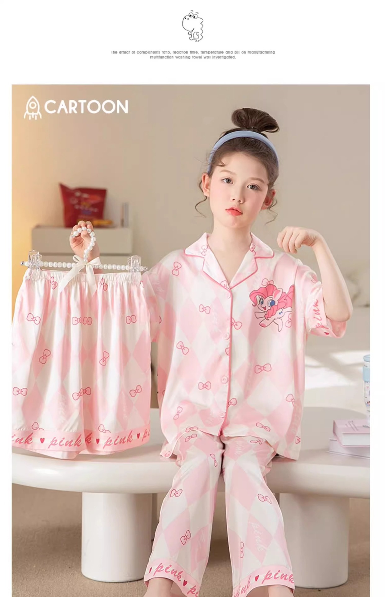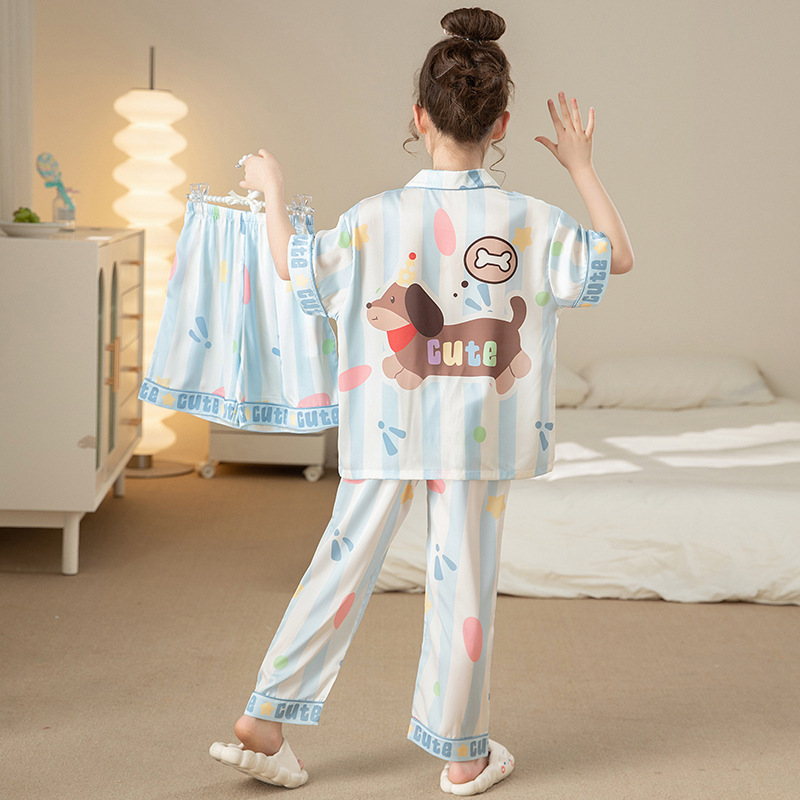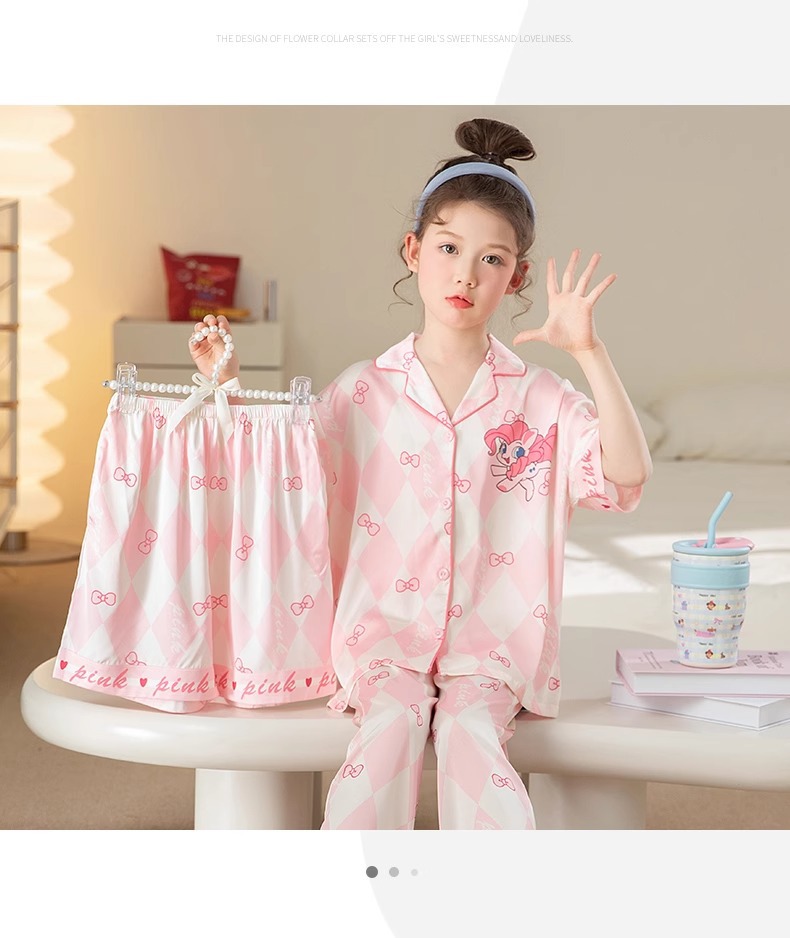 어린이 잠옷 여름 2025 새로운 아이스 실크 반팔 소녀 3 피스 세트 아기 공주 여름 소녀의 집 옷스토어 가기