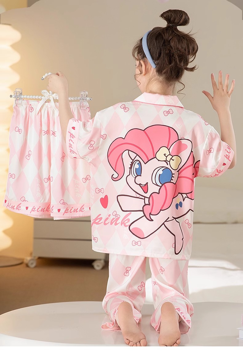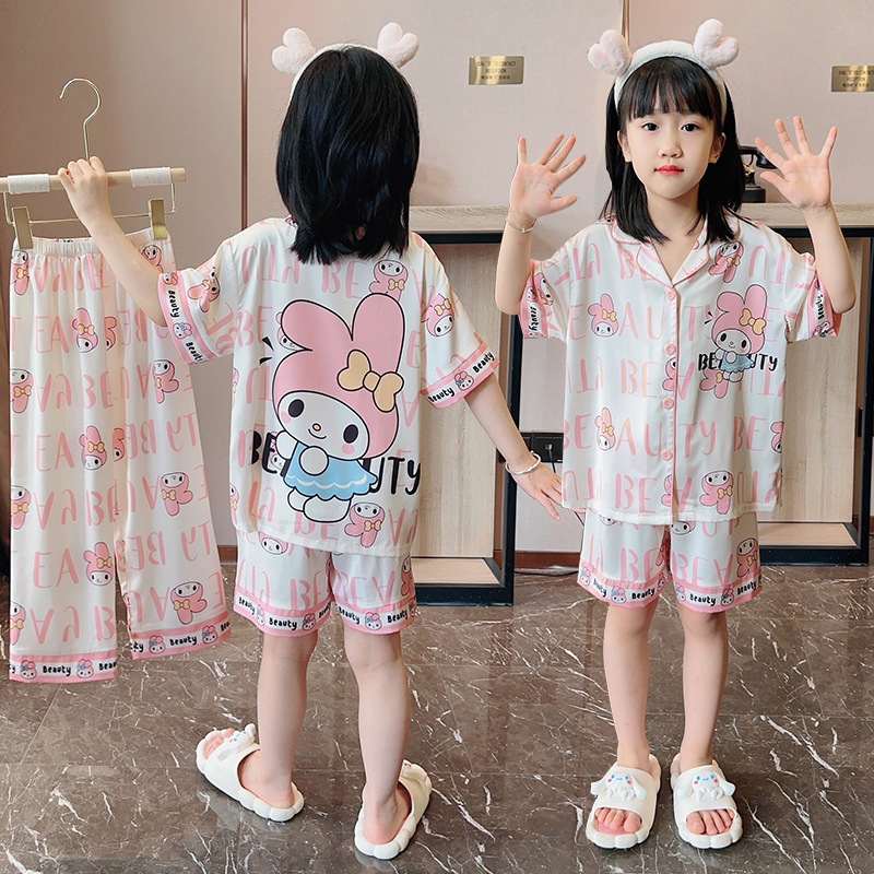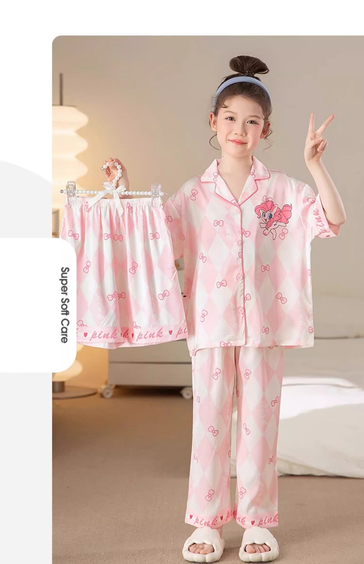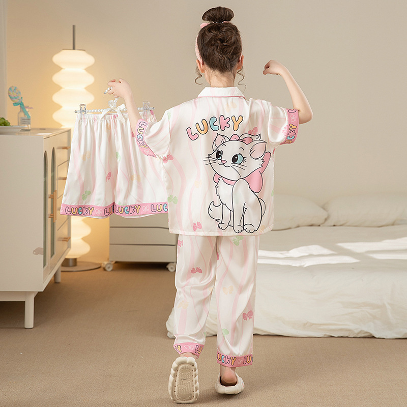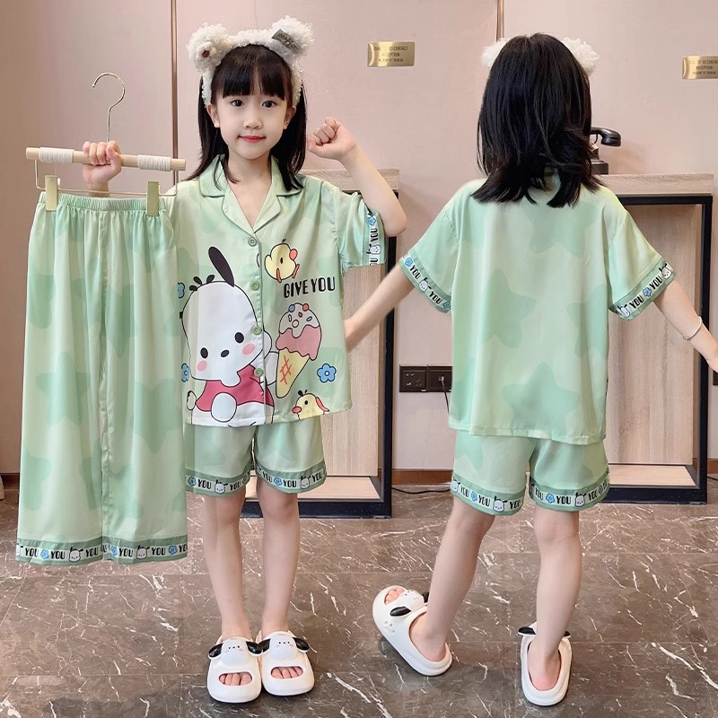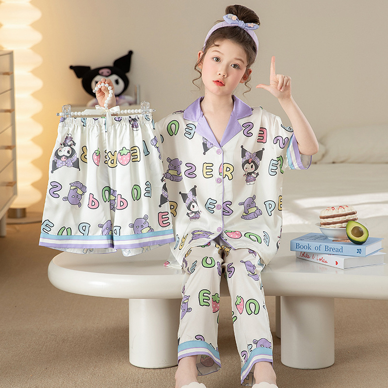 어린이 잠옷 여름 2025 새로운 아이스 실크 반팔 소녀 3 피스 세트 아기 공주 여름 소녀의 집 옷스토어 가기