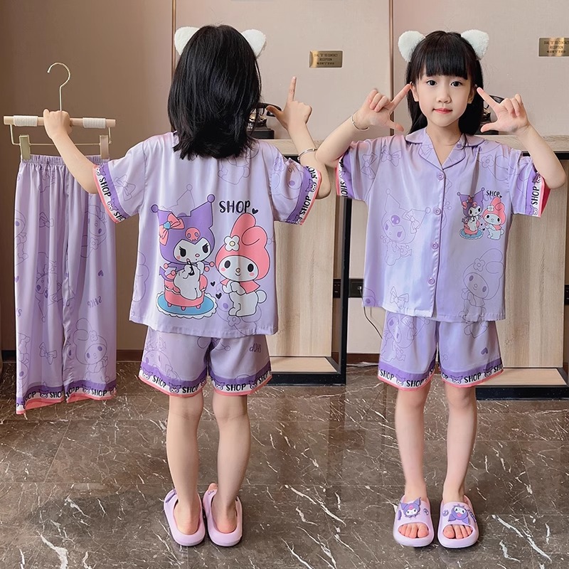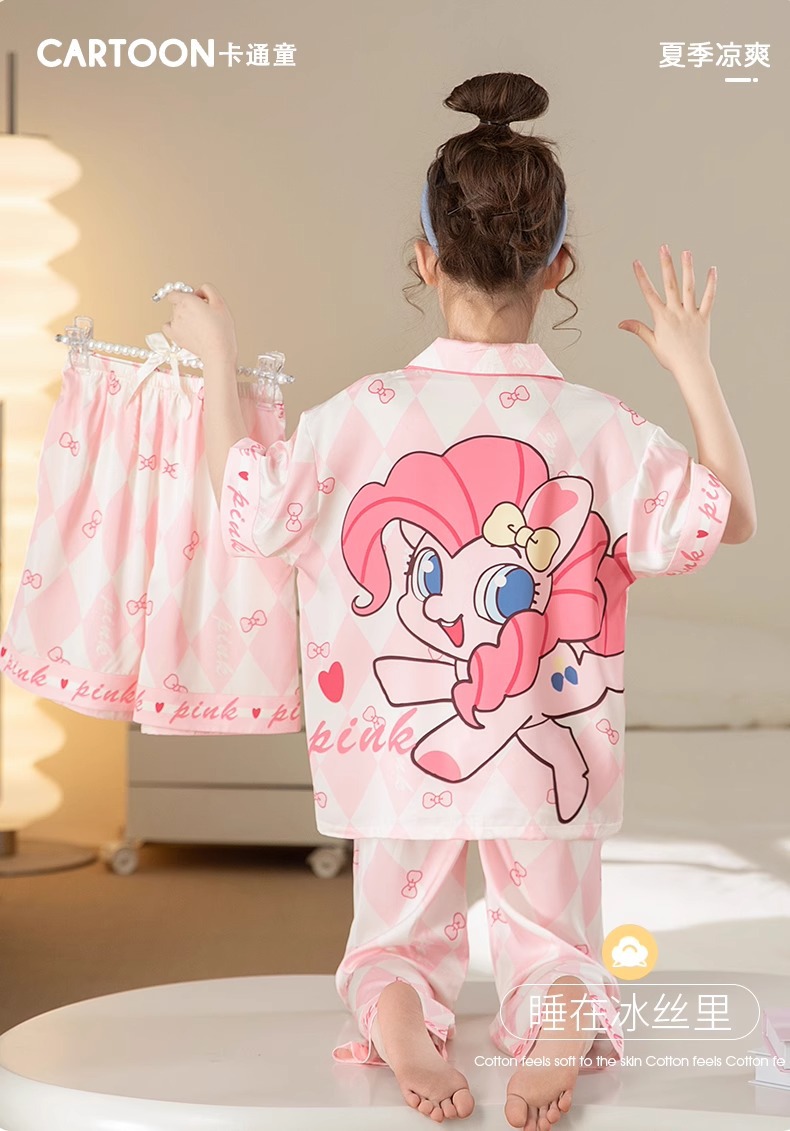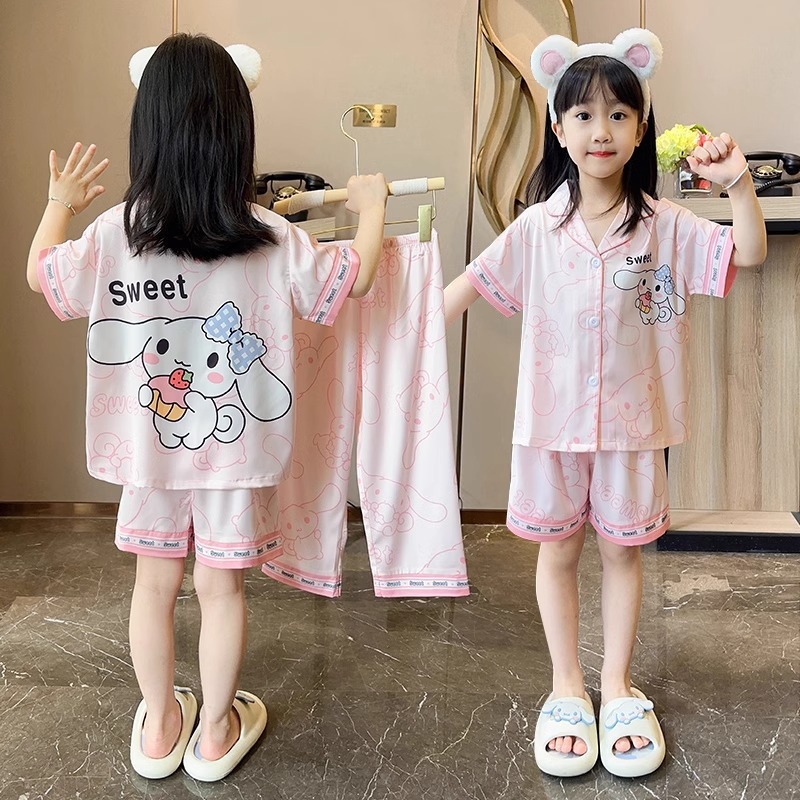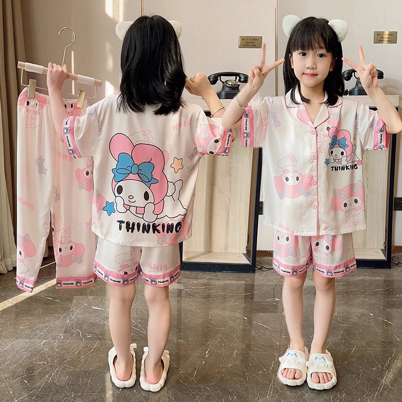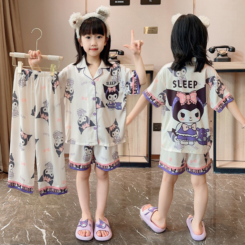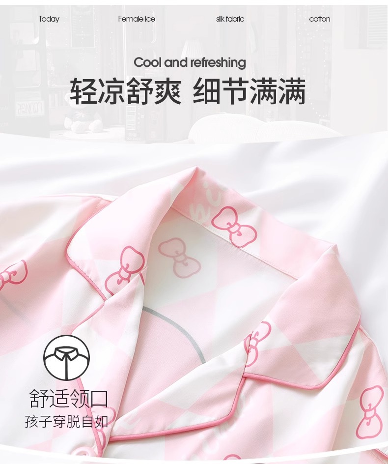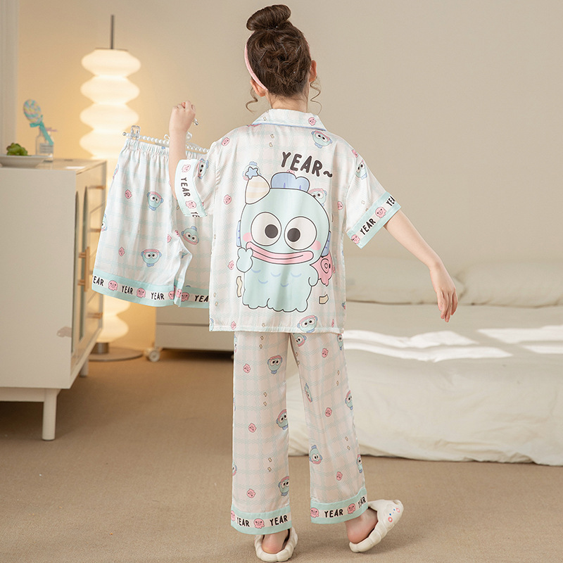 어린이 잠옷 여름 2025 새로운 아이스 실크 반팔 소녀 3 피스 세트 아기 공주 여름 소녀의 집 옷스토어 가기