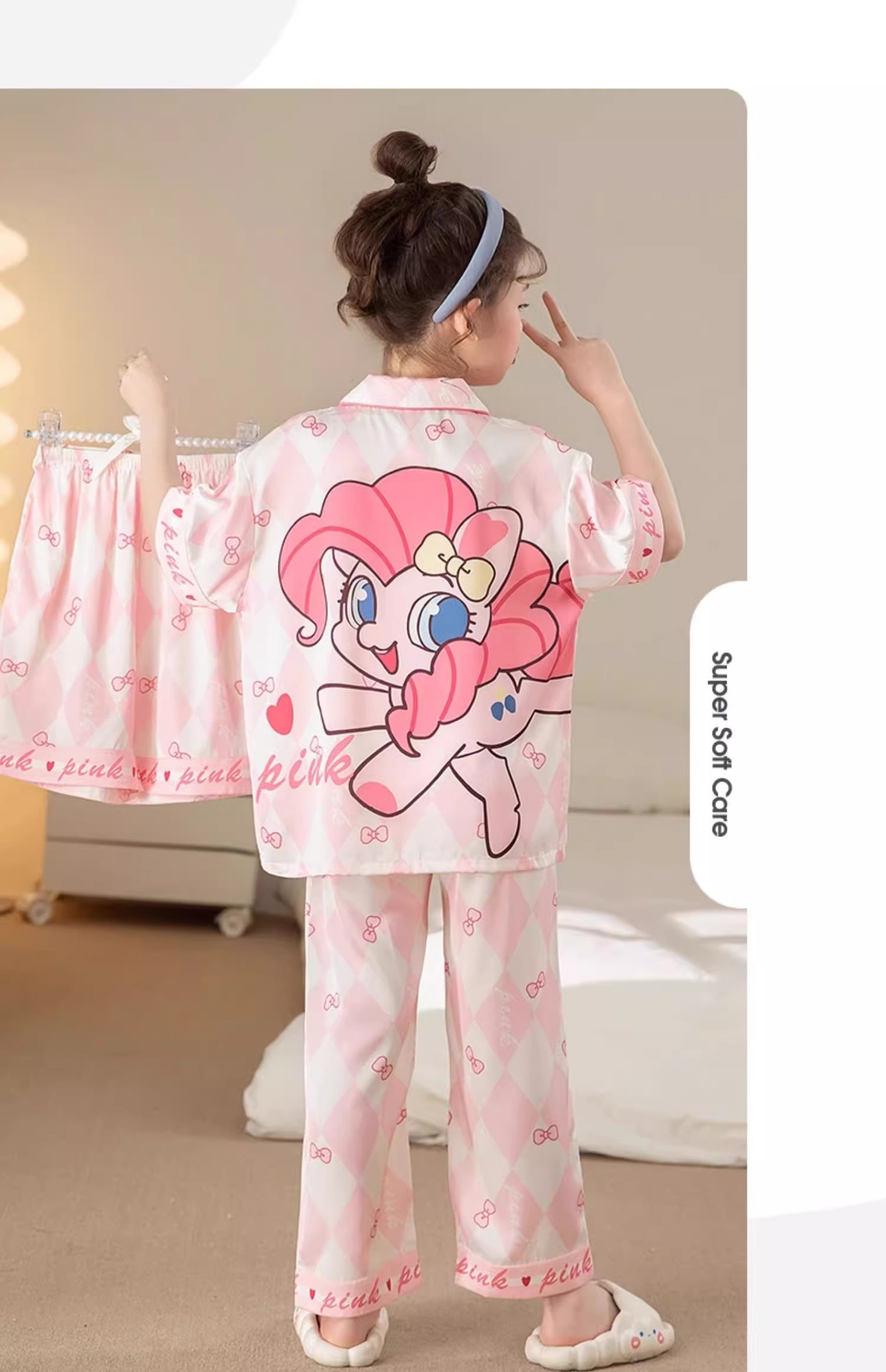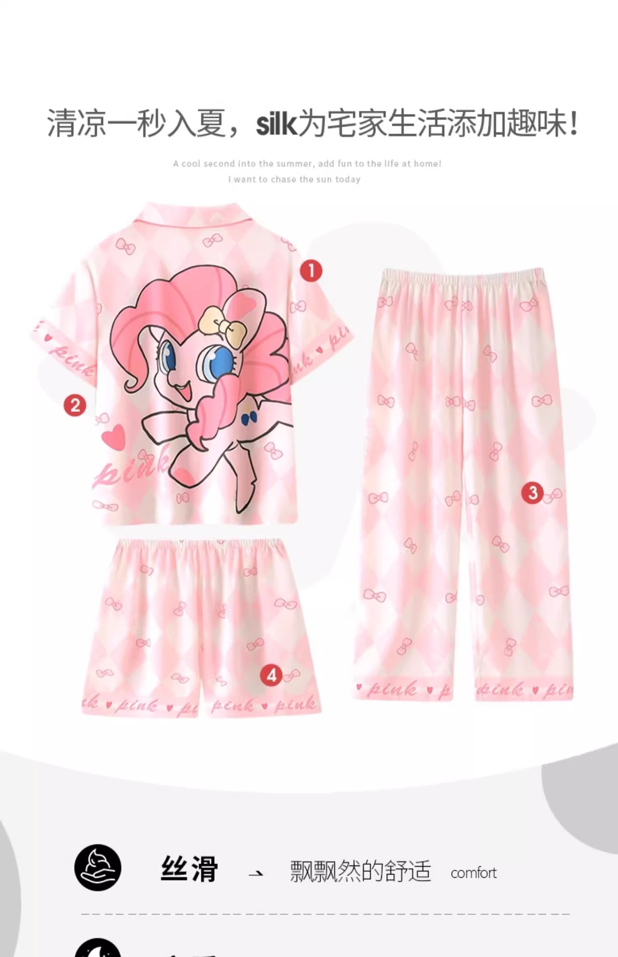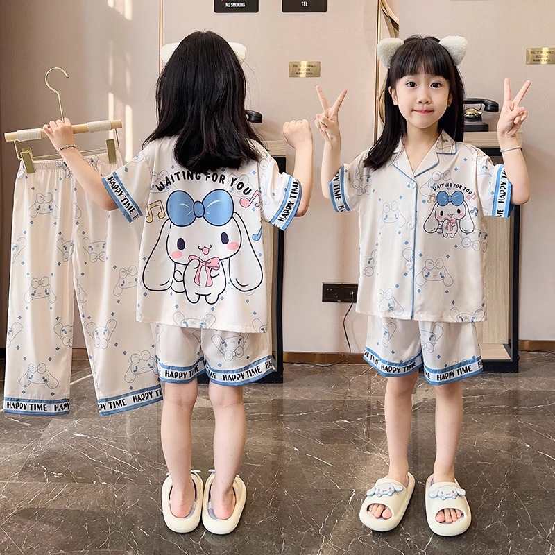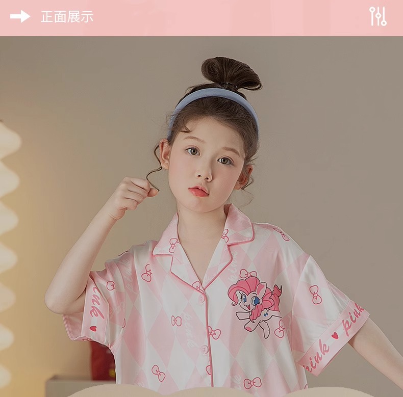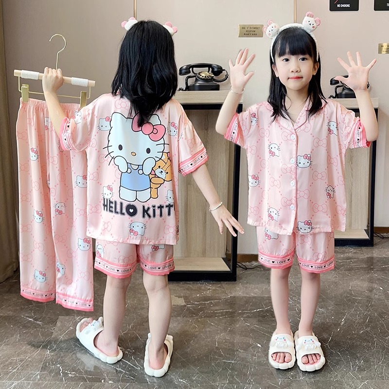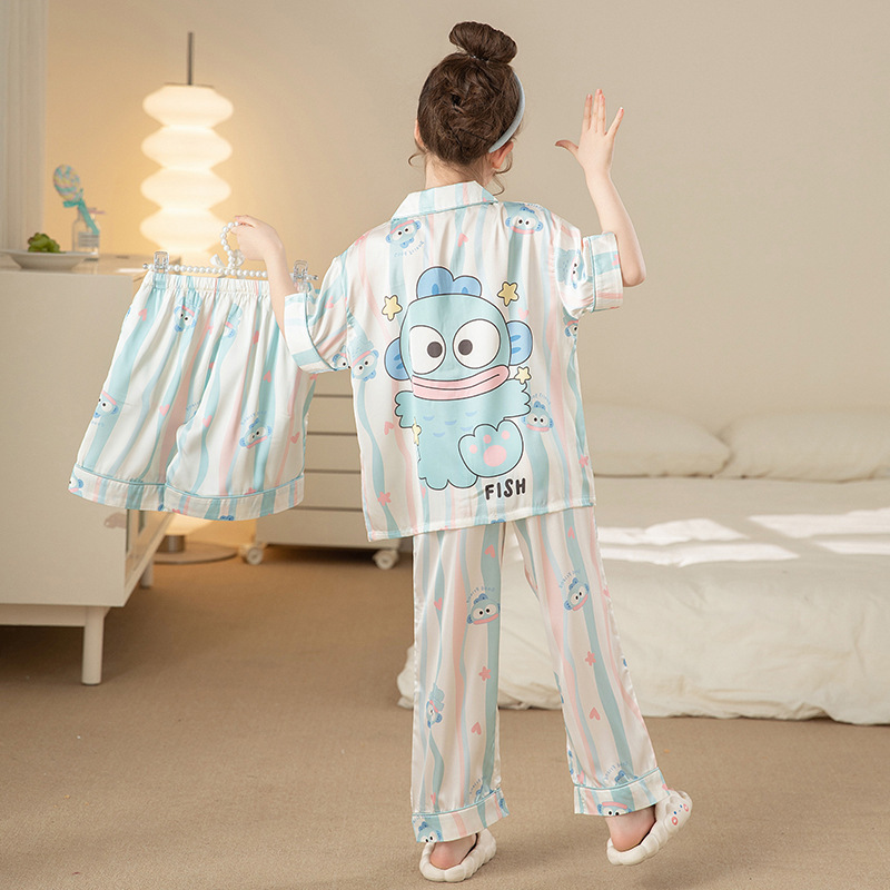 어린이 잠옷 여름 2025 새로운 아이스 실크 반팔 소녀 3 피스 세트 아기 공주 여름 소녀의 집 옷스토어 가기