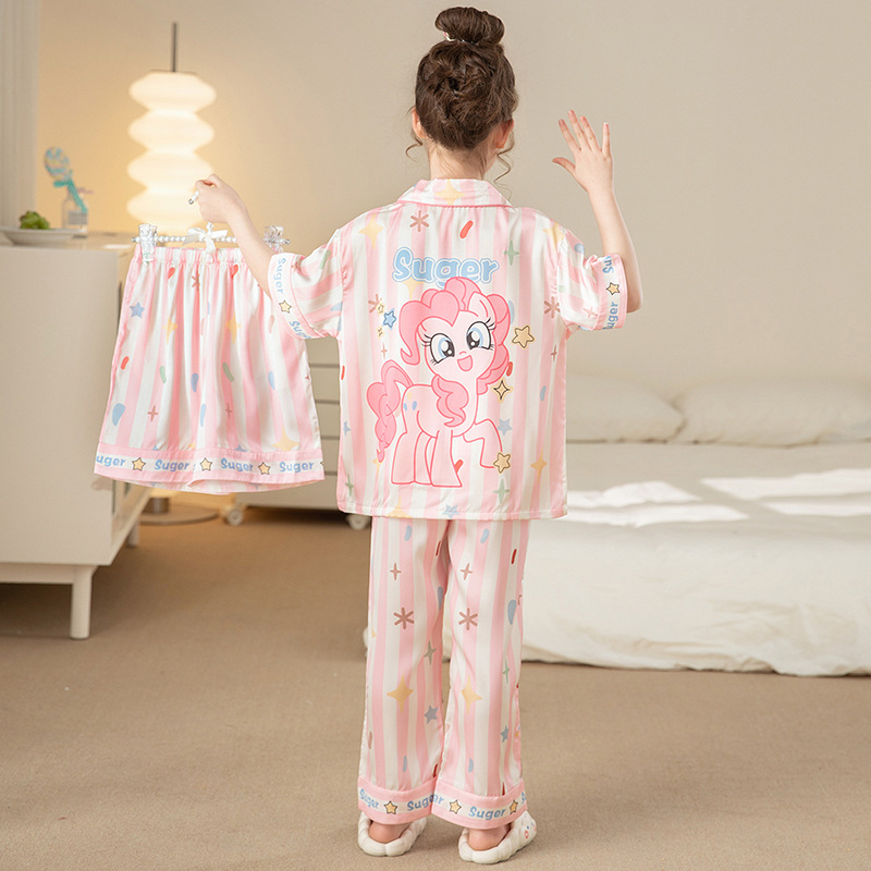 어린이 잠옷 여름 2025 새로운 아이스 실크 반팔 소녀 3 피스 세트 아기 공주 여름 소녀의 집 옷